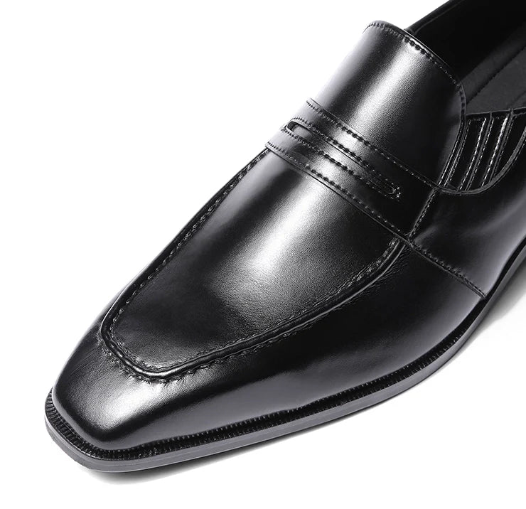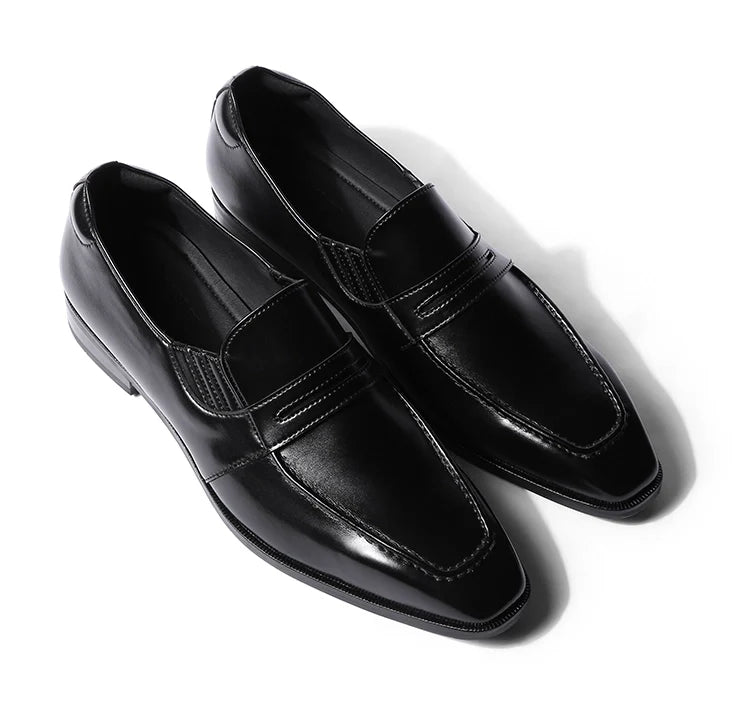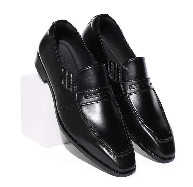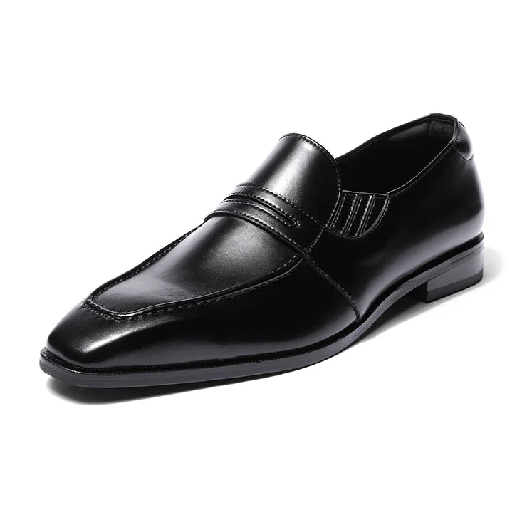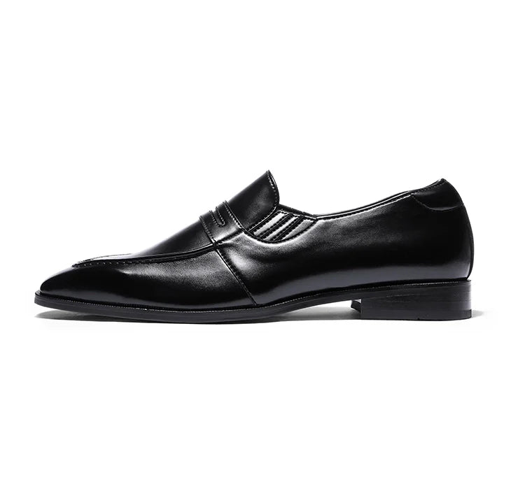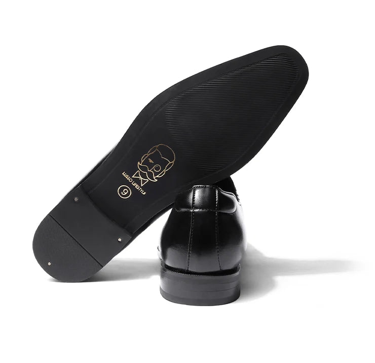 The Dayton is a Lazyman loafer that bridges the gap between Oxford tradition and loafer convenience. Crafted in polished black vegan leather, it features elastic side gussets for effortless slip-on wear, while keeping a structured, formal silhouette. A shoe that delivers boardroom authority with everyday practicality.