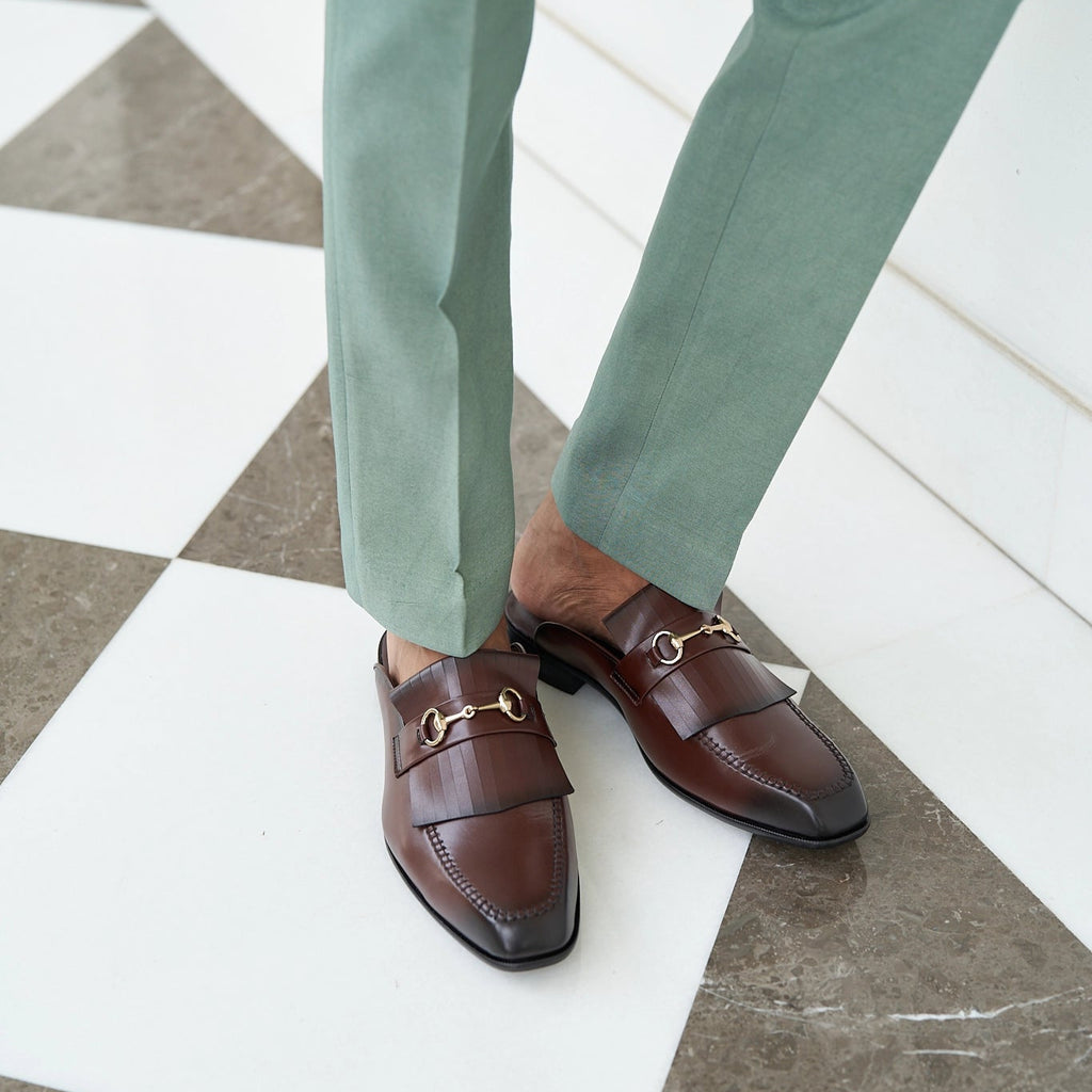 Get these classic dual-tone, dark tan horsebit fringe mules added to your collection. GUSTOSO is styled with an exclusive golden horse-bit buckle with a square toe cap giving you a royal feel. The upper is smooth and shiny and gives your feet a fresh look everytime you pair it!