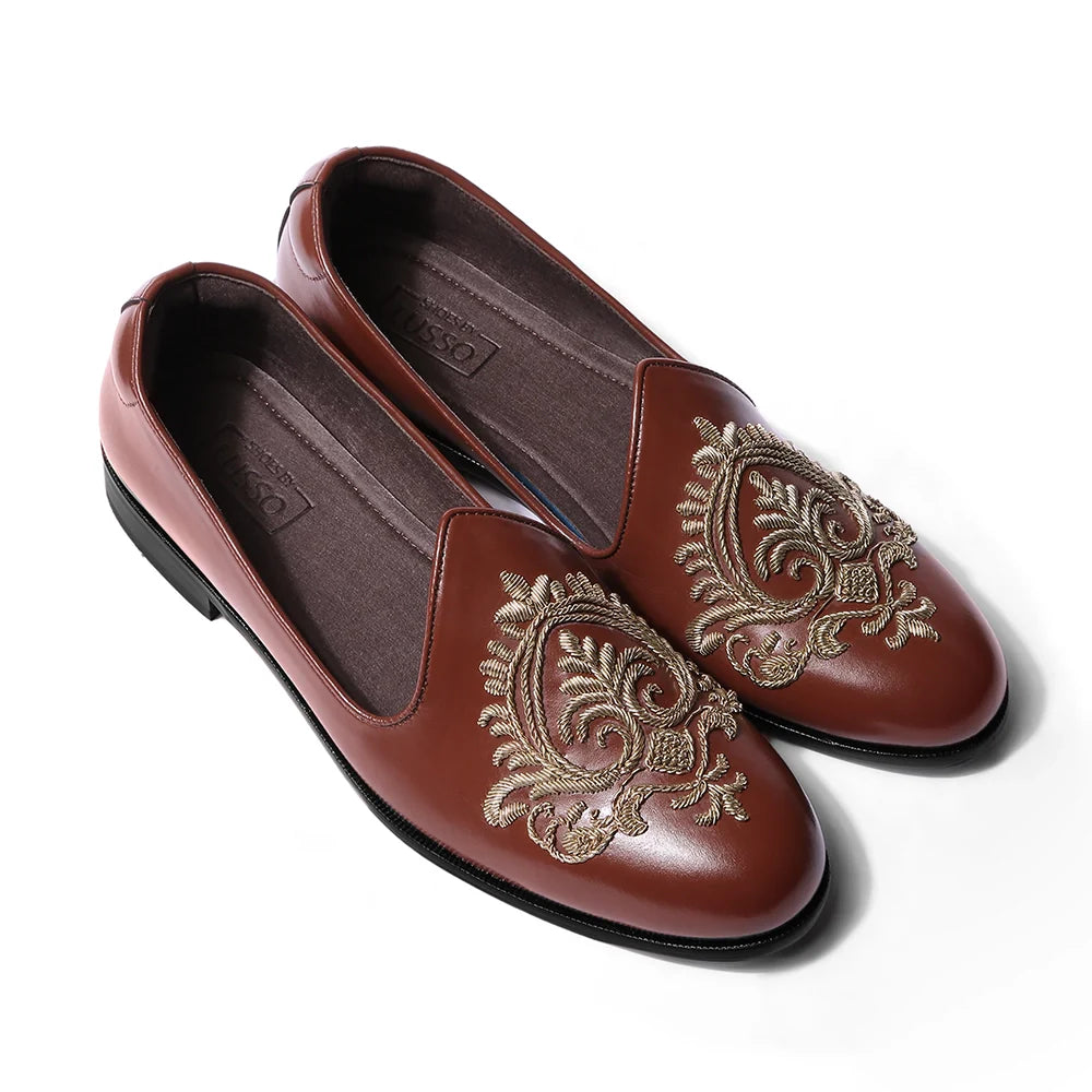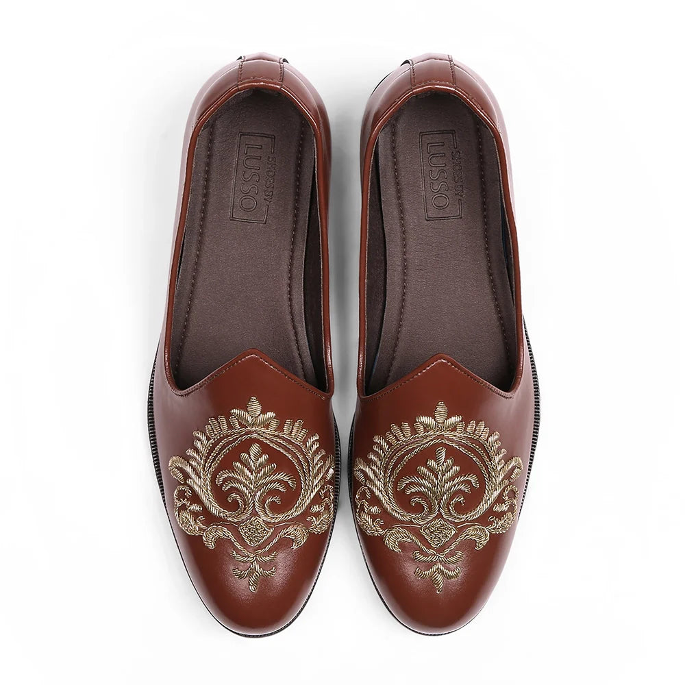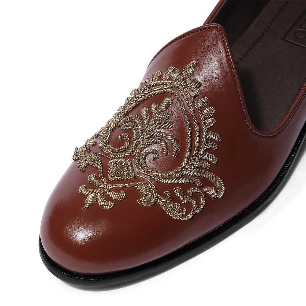 Its embroidery rises like the regal crest of a Kalgi, detailed with fine zardosi handwork that glints softly against the tan vegan leather base. Each curve is a nod to heritage, each stitch a reflection of poise.