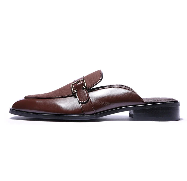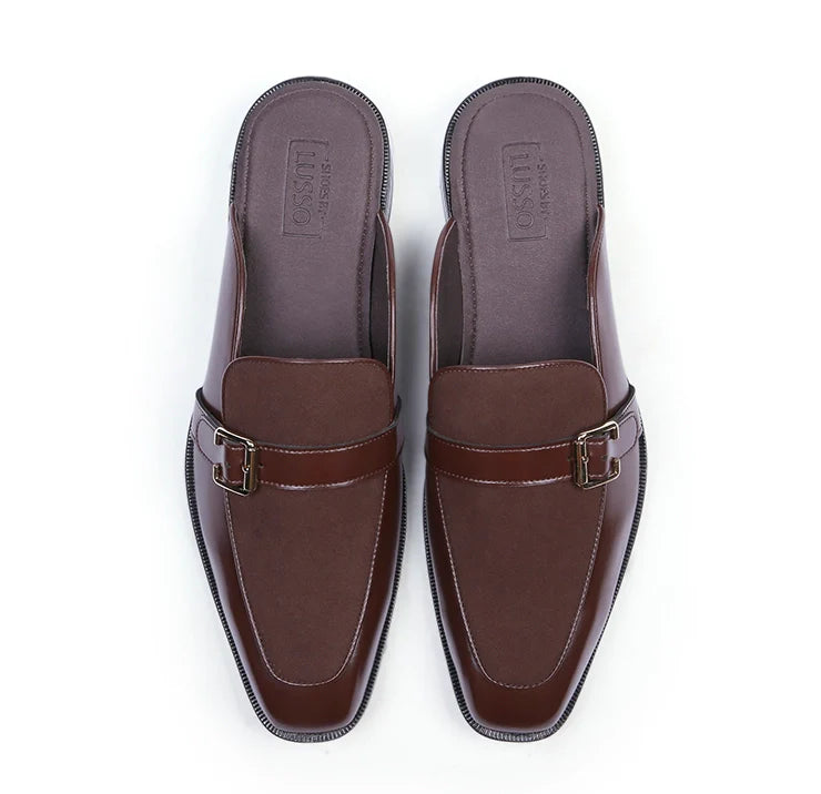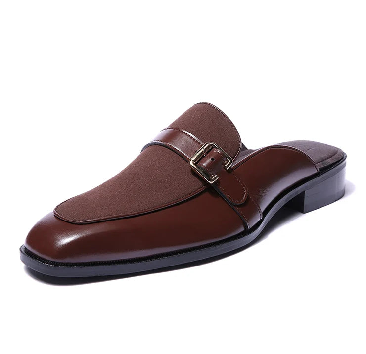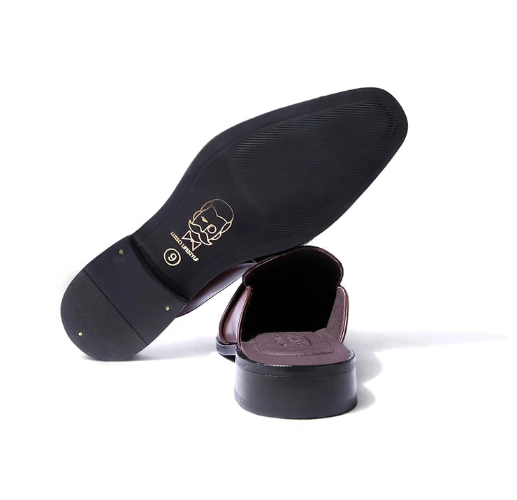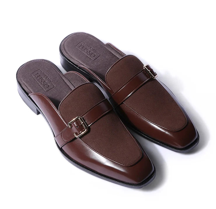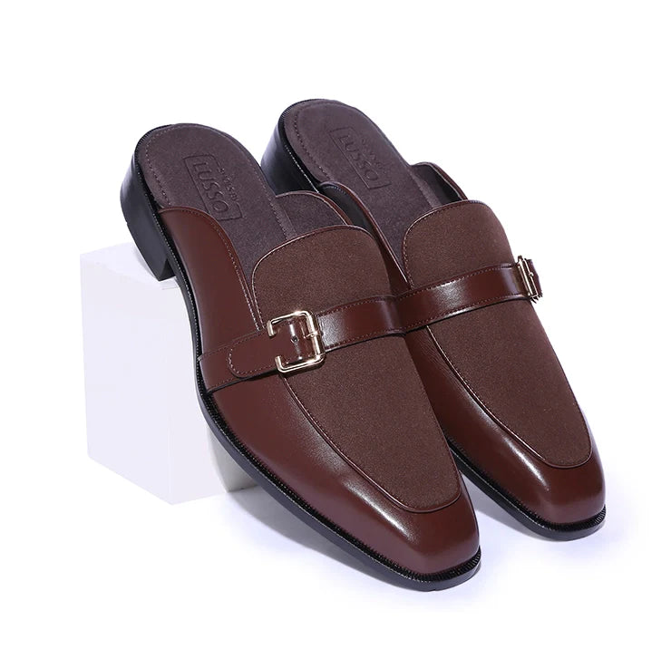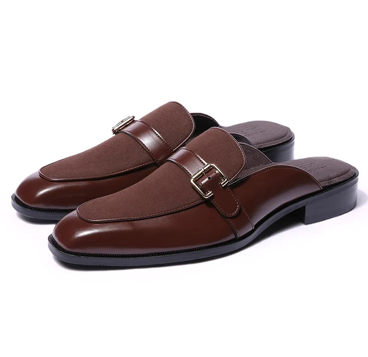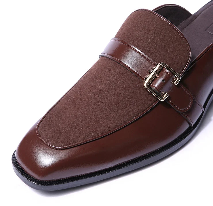 Marlen is designed to stand out, but quietly. Bold in structure, rich in finish, and confident in detail. The soft brown suede body brings depth and texture, while vegan leather dark tan trims add polish and clarity. A golden buckle elevates the mules from simple to statement.