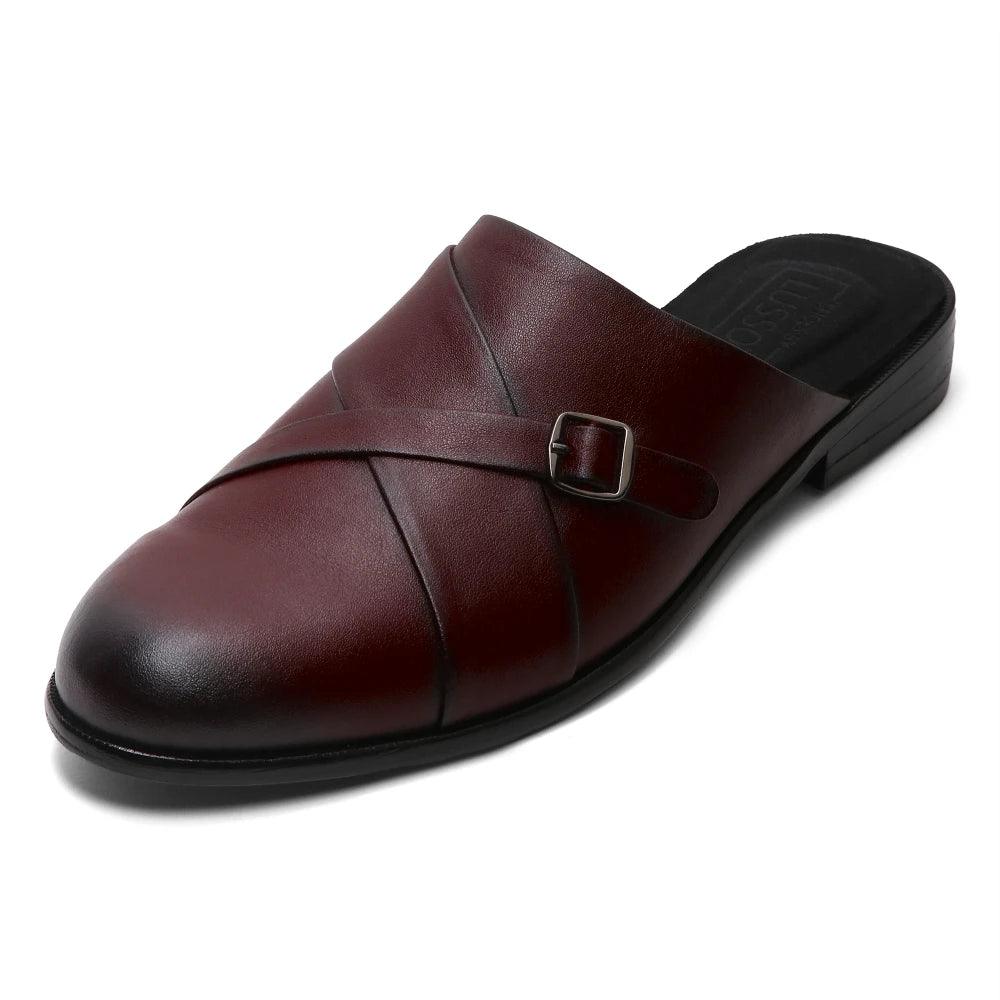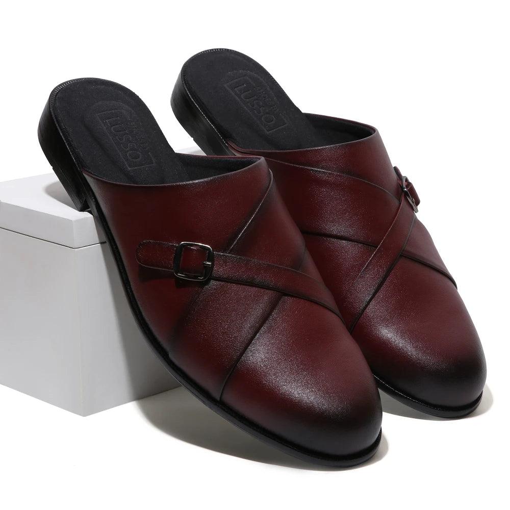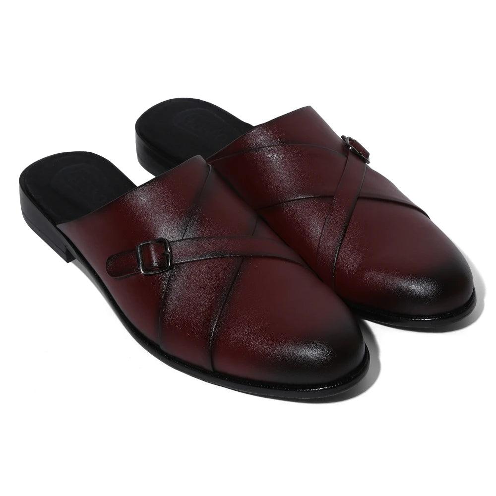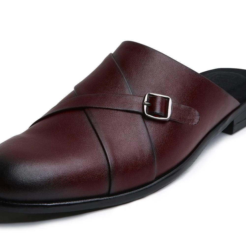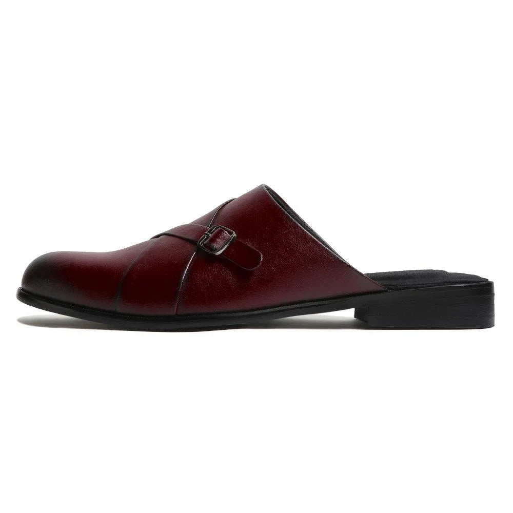 The "Mason" single monk mule is a standout piece that combines the ease of a slip-on with the sophistication of a classic monk shoe. The maroon upper, with its subtle dual-tone black shading, offers depth and character, while the single buckle adds a touch of traditional style. This mule is a versatile choice that pairs well with both casual and semi-formal attire.