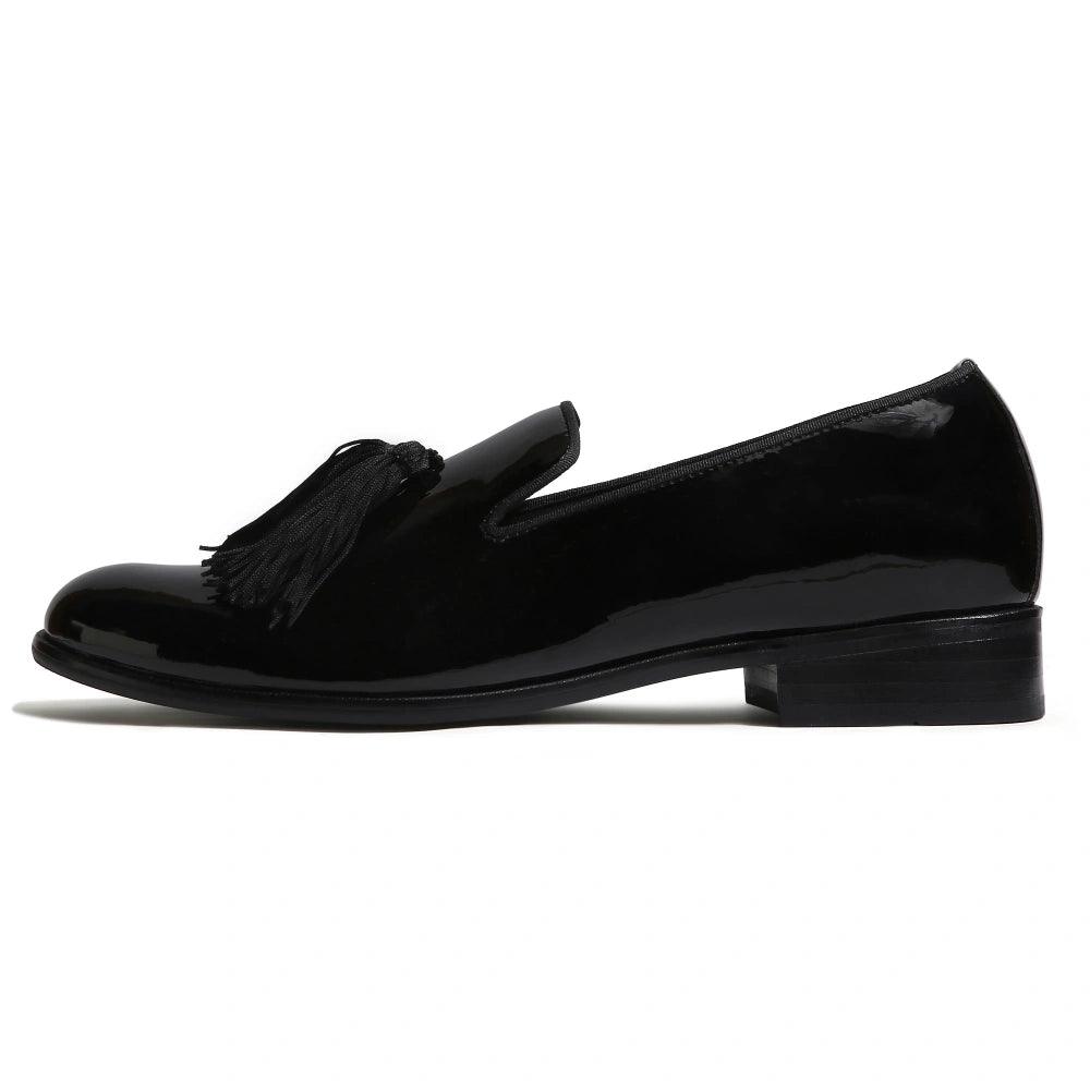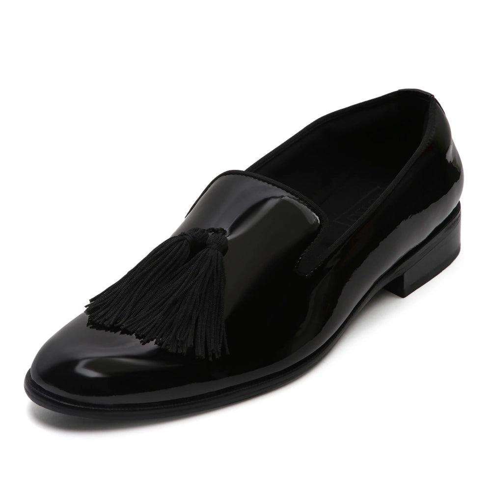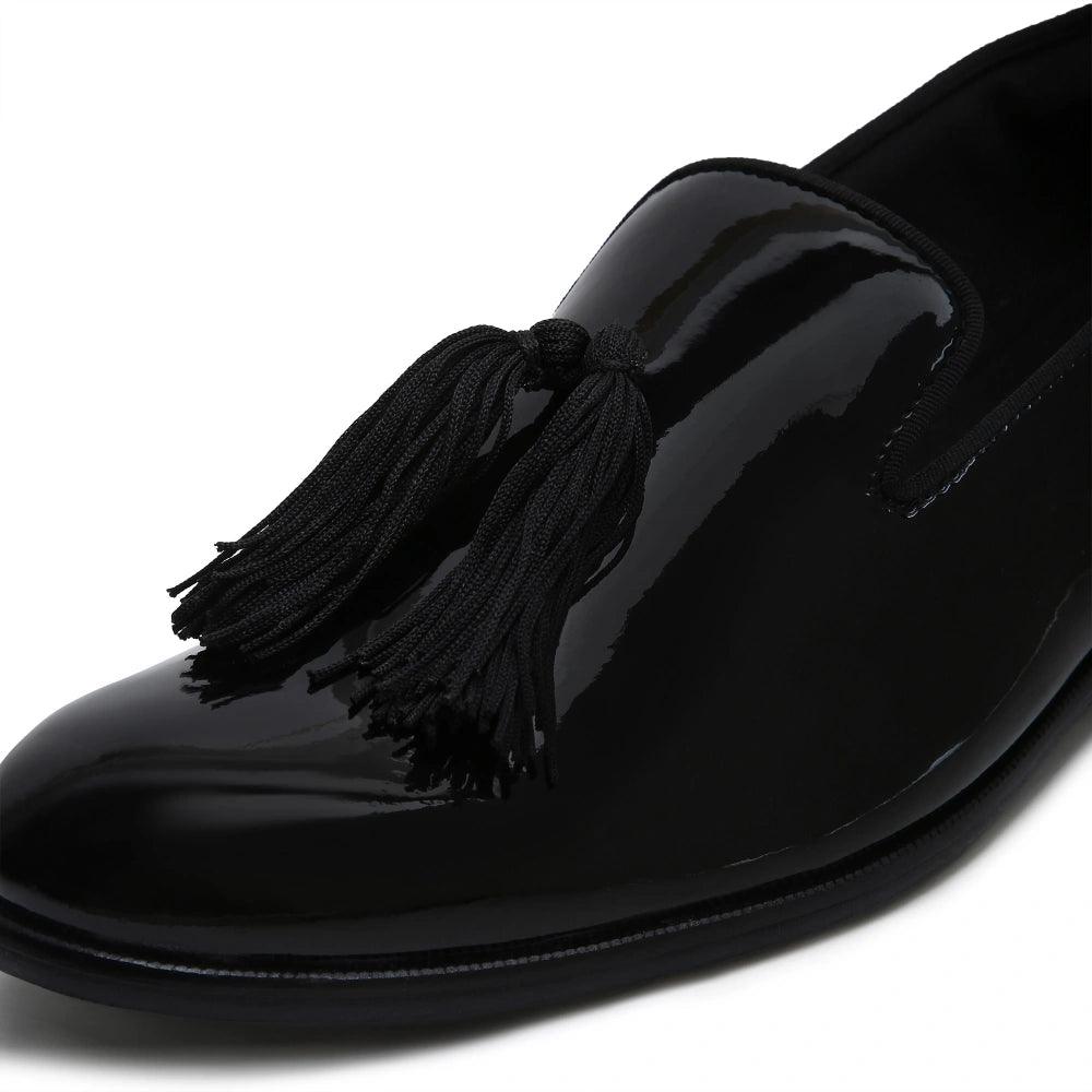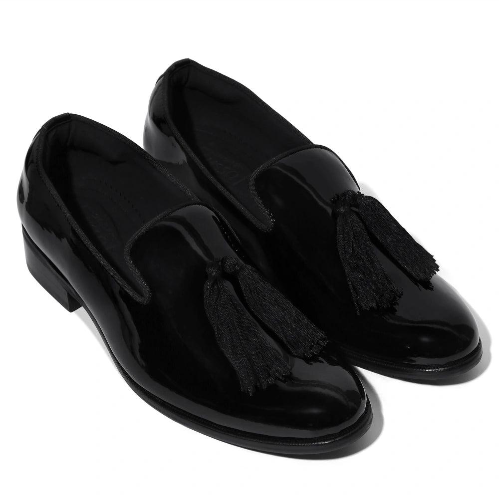 Meet "The Joma," a shoe that embodies simple elegance and ethical luxury. Its design is inspired by the timeless sophistication of a classic tassel, where style meets simplicity. The Joma features a sleek patent black upper, complemented by a distinctive, oversized tassel, adding a touch of flair. Perfect for the modern man who appreciates understated luxury, this slip-on shoe combines comfort with a conscientious choice for the environment. It's not just a shoe, it's a statement of refined taste and sustainable fashion, ideal for any occasion that calls for a touch of class.