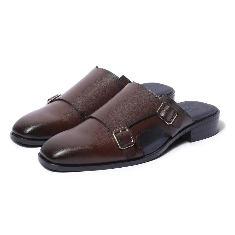 Introducing "The Hulio", the perfect blend of classic and contemporary. These plush dark tan mules feature a clean double monk strap design with a square toe for a sharp, urban look. Ideal for dressing up or down, they slide on effortlessly to complement any outfit.