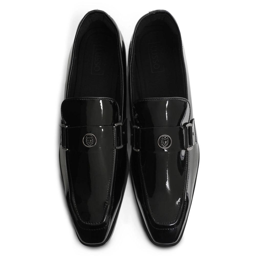 The "Allan - Black Patent Square Toe Loafer" is a masterpiece that exudes luxury and class. The craftsmanship is evident in every detail, from our signature square-toe silhouette to the eye-catching patent black vegan leather. Our iconic Lusso Logo in gun metal finish ornates this pair to add a bling to your ensemble. The "Allan" is exactly what you need to bring the A-game to your next black-tie event. A perfect option for your Tuxedos, Suits and Heritage outfits.