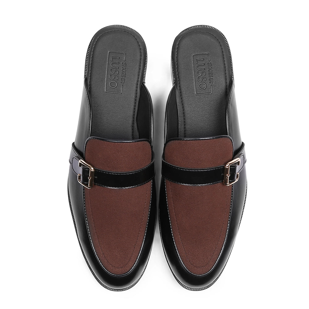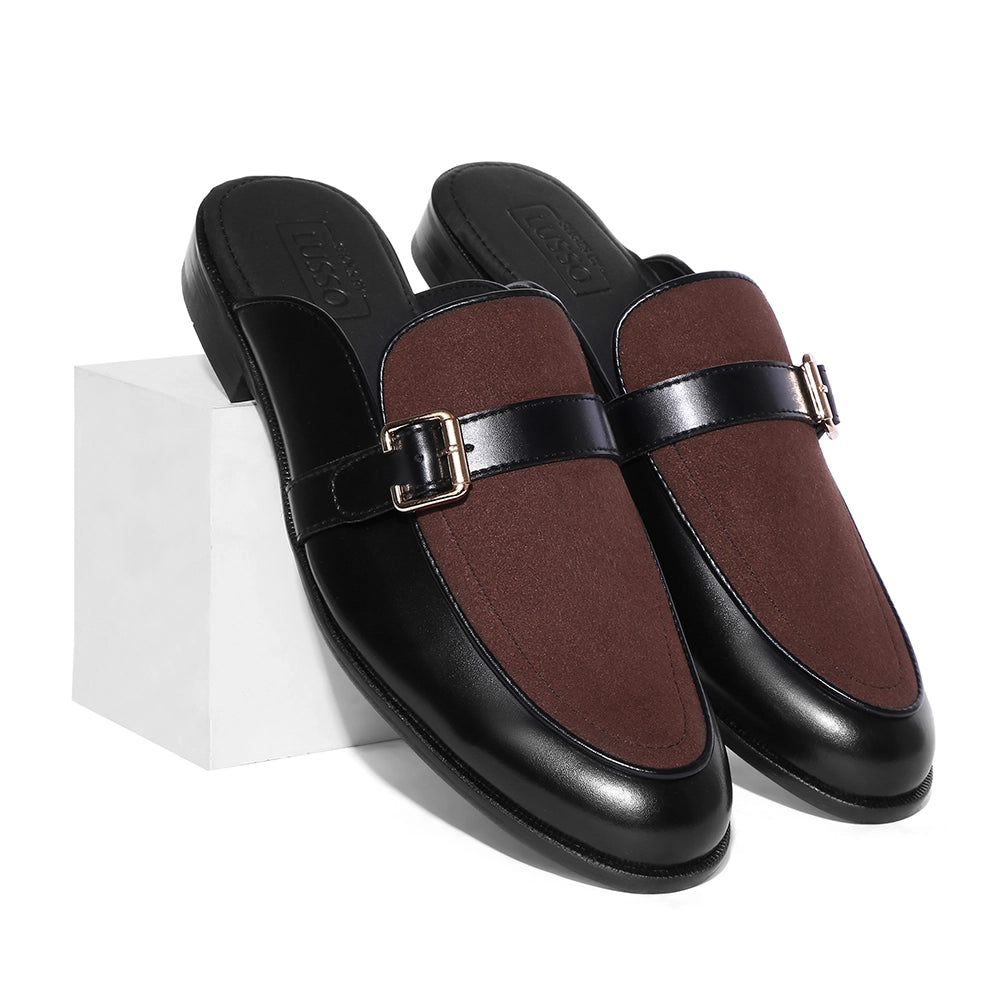 Duco is designed to stand out, but quietly. Bold in structure, rich in finish, and confident in detail. The soft brown suede body brings depth and texture, while black trims add polish and clarity. A gold buckle elevates the mules from simple to statement.