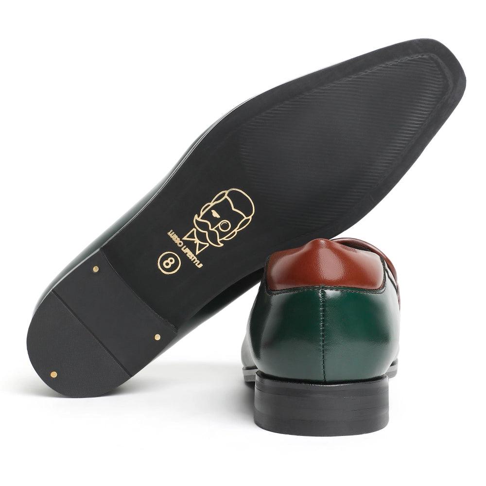 The "Giovanni" is our homage to the Italian craft and culture. These ultra-modern loafers are meticulously crafted to exude sophistication and opulence. The "Giovanni" - Green Slip-on embodies elegance in every detail. Featuring a striking green upper with a charming tan contrast on each side of the tongue, this pair offers a distinctive look. Our iconic square-toe silhouette of the "Giovanni" blends confidence and comfort seamlessly, telling a tale of style and ease.