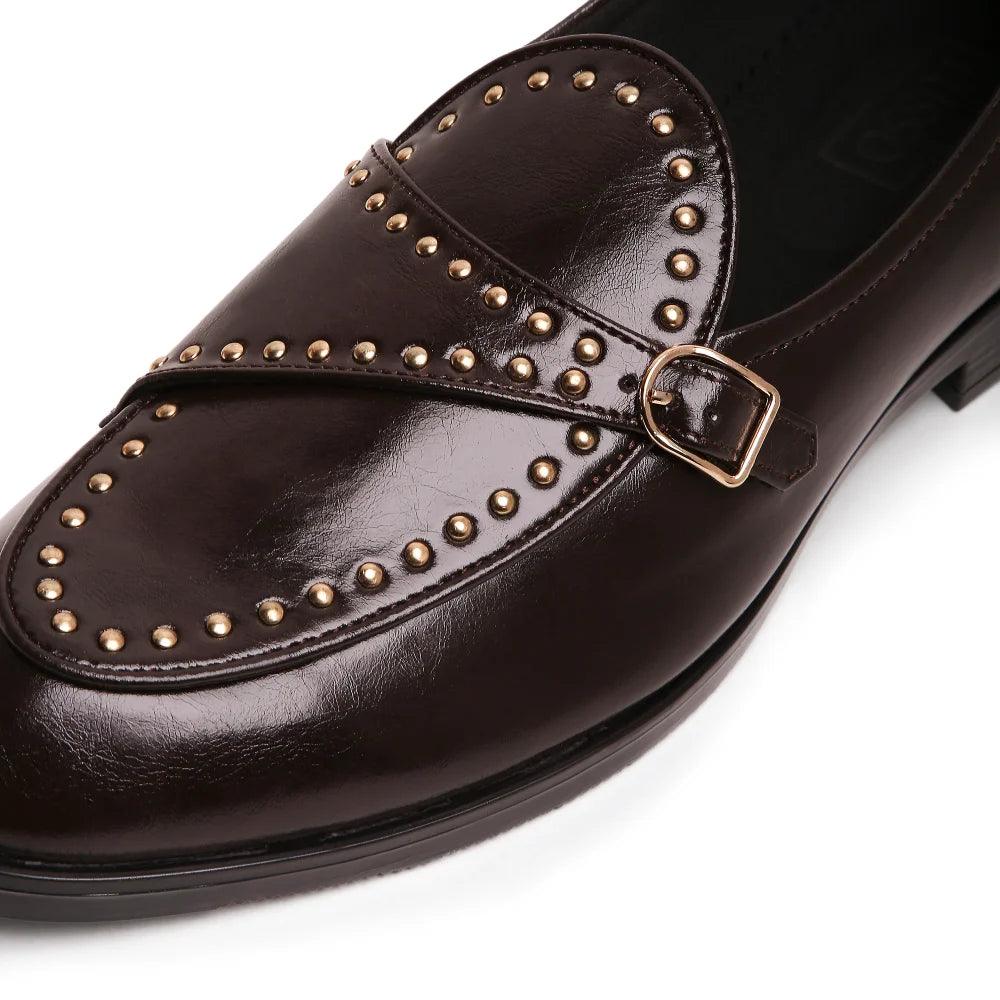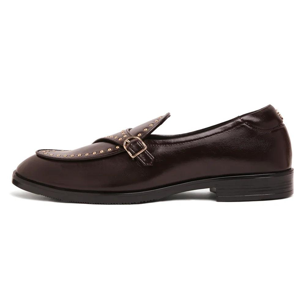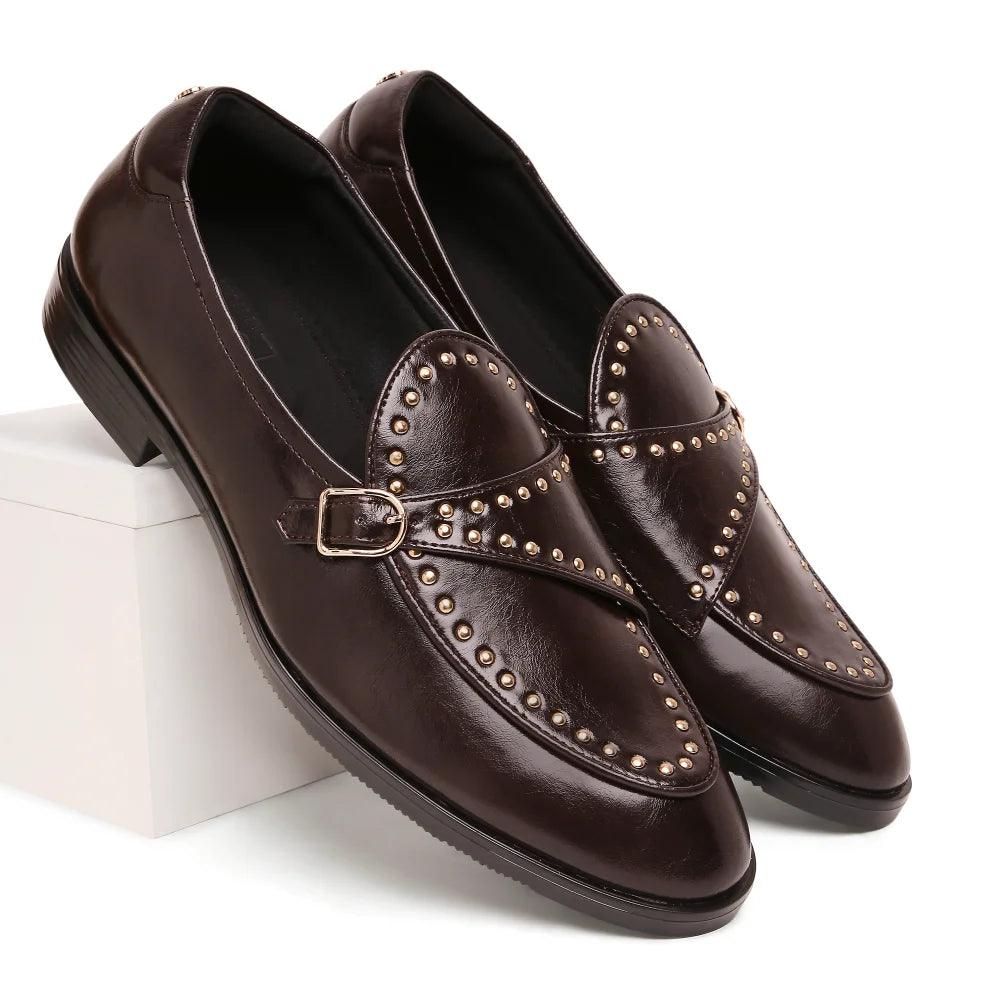 Make a statement that leaves a lasting impression. Discover the timeless elegance of Goliath Brown Rivet Monk Slip-On shoes. With its Brown textured, vegan-leather construction, the Goliath is handcrafted in a classic single-monk strap design and elegantly styled with contouring rivets.