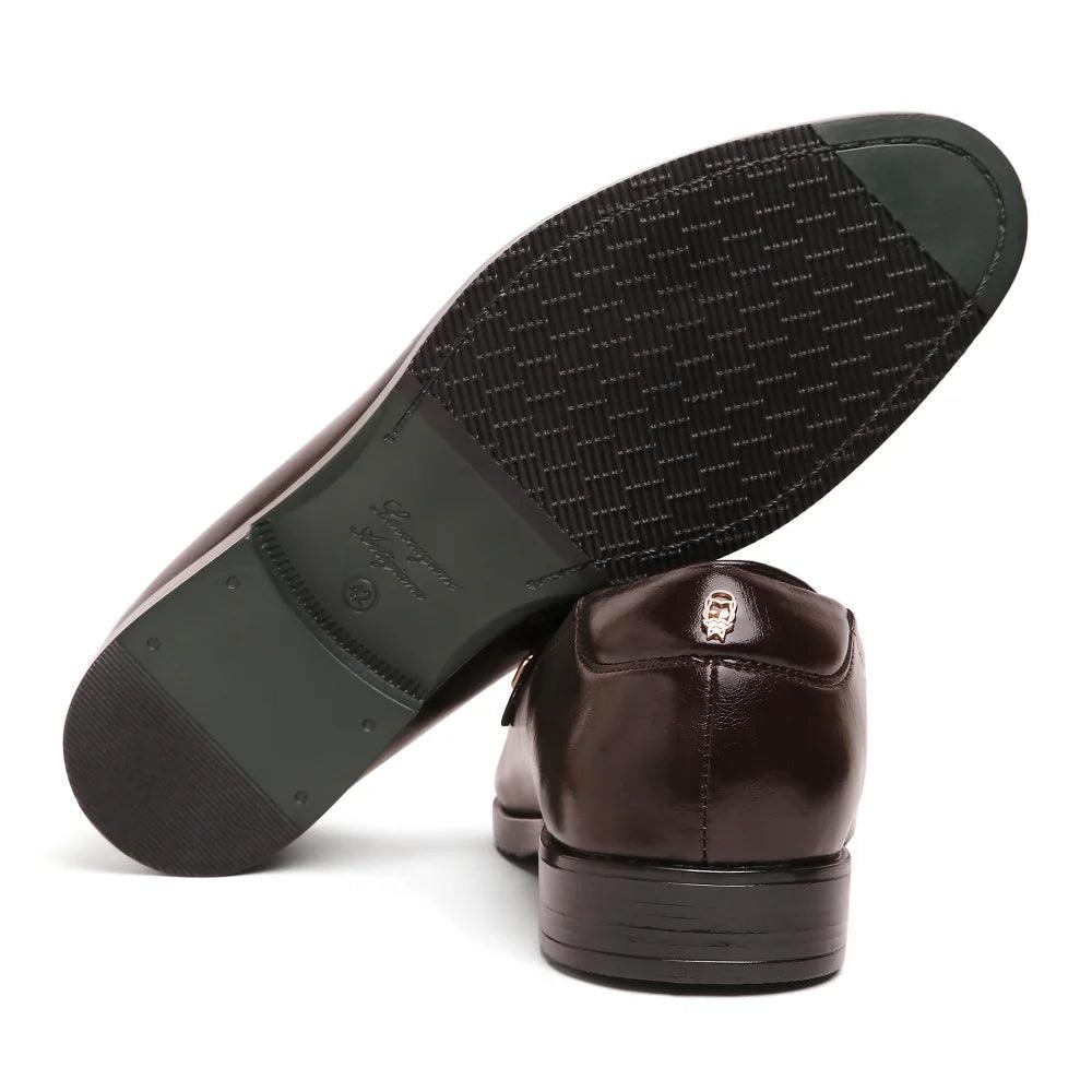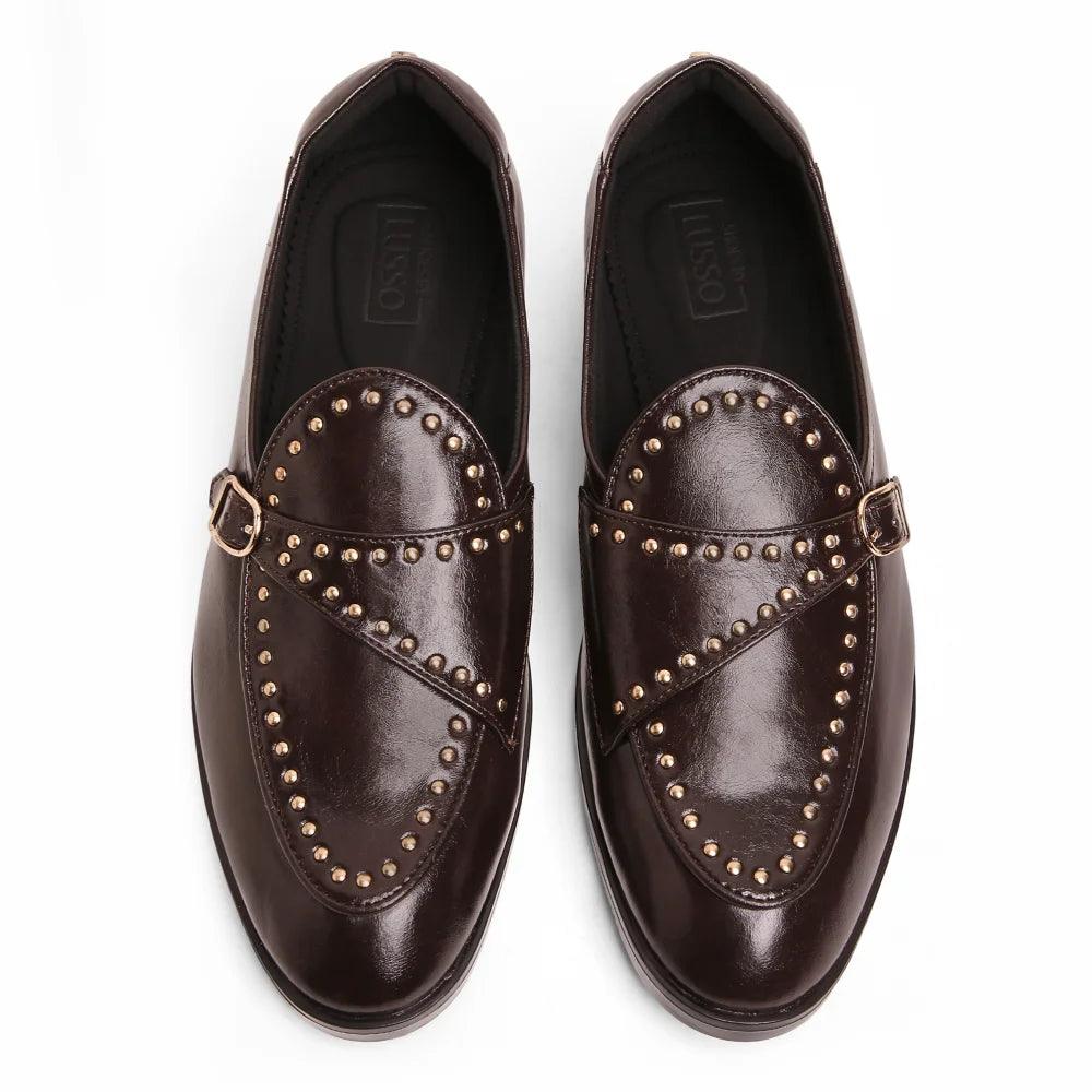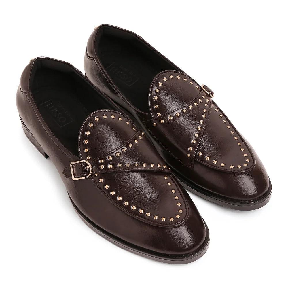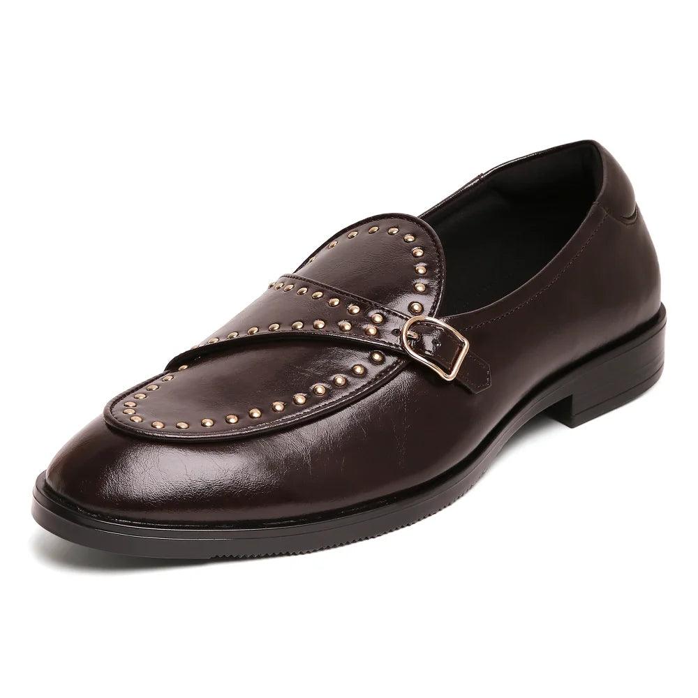 Make a statement that leaves a lasting impression. Discover the timeless elegance of Goliath Brown Rivet Monk Slip-On shoes. With its Brown textured, vegan-leather construction, the Goliath is handcrafted in a classic single-monk strap design and elegantly styled with contouring rivets.