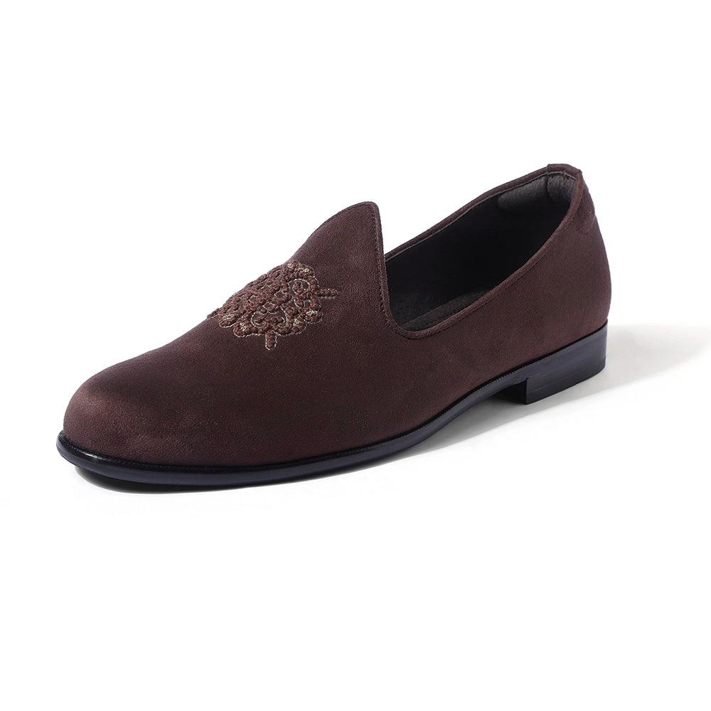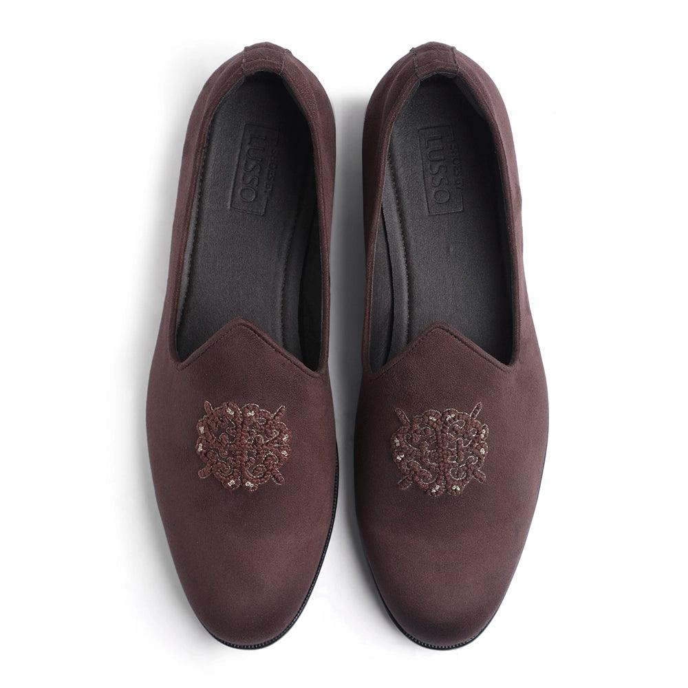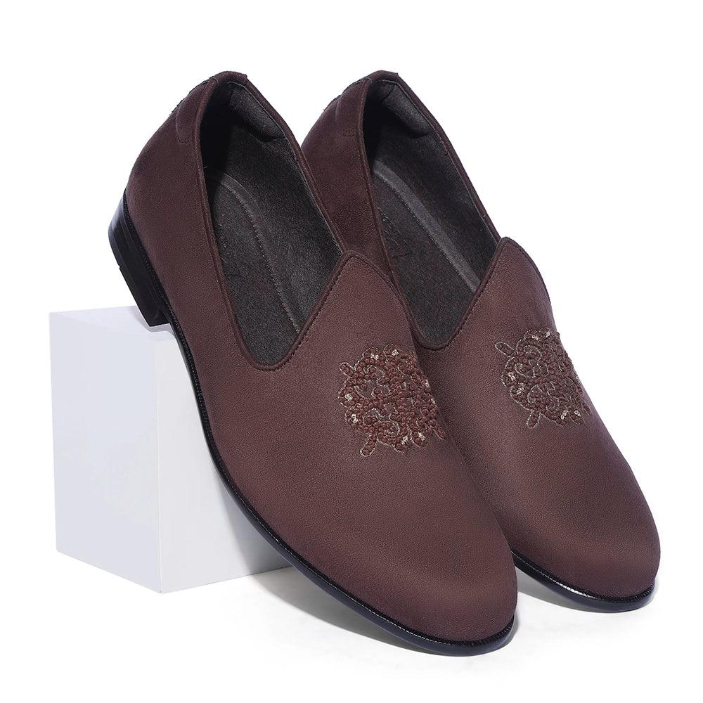 Introducing the "Gulbarg" mojdi, a lush, soft-to-touch, luxurious brown suede crafted on a classic mojdi silhouette. To complete the look, intricate French knot embroidery creates a pair versatile for all your ethnics.