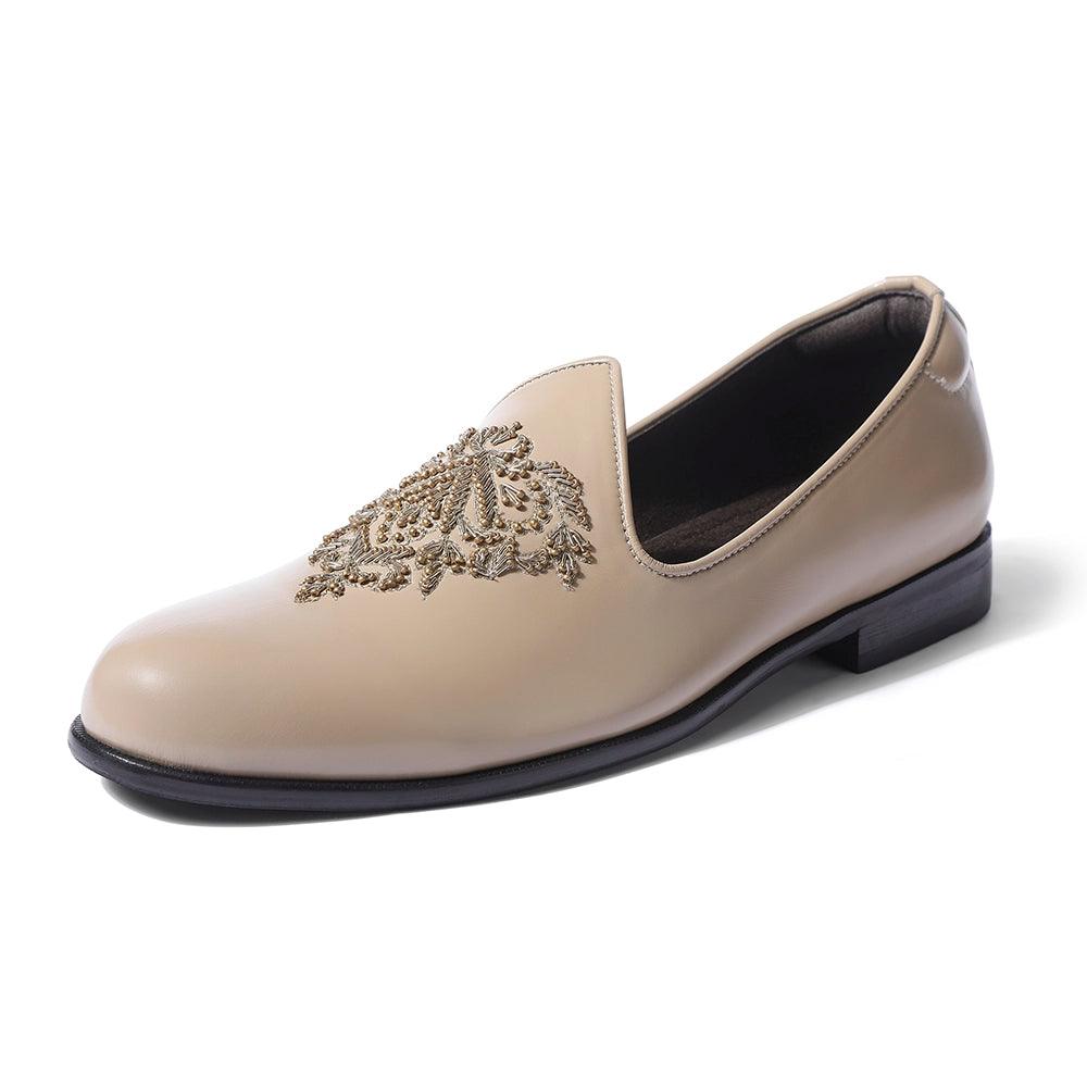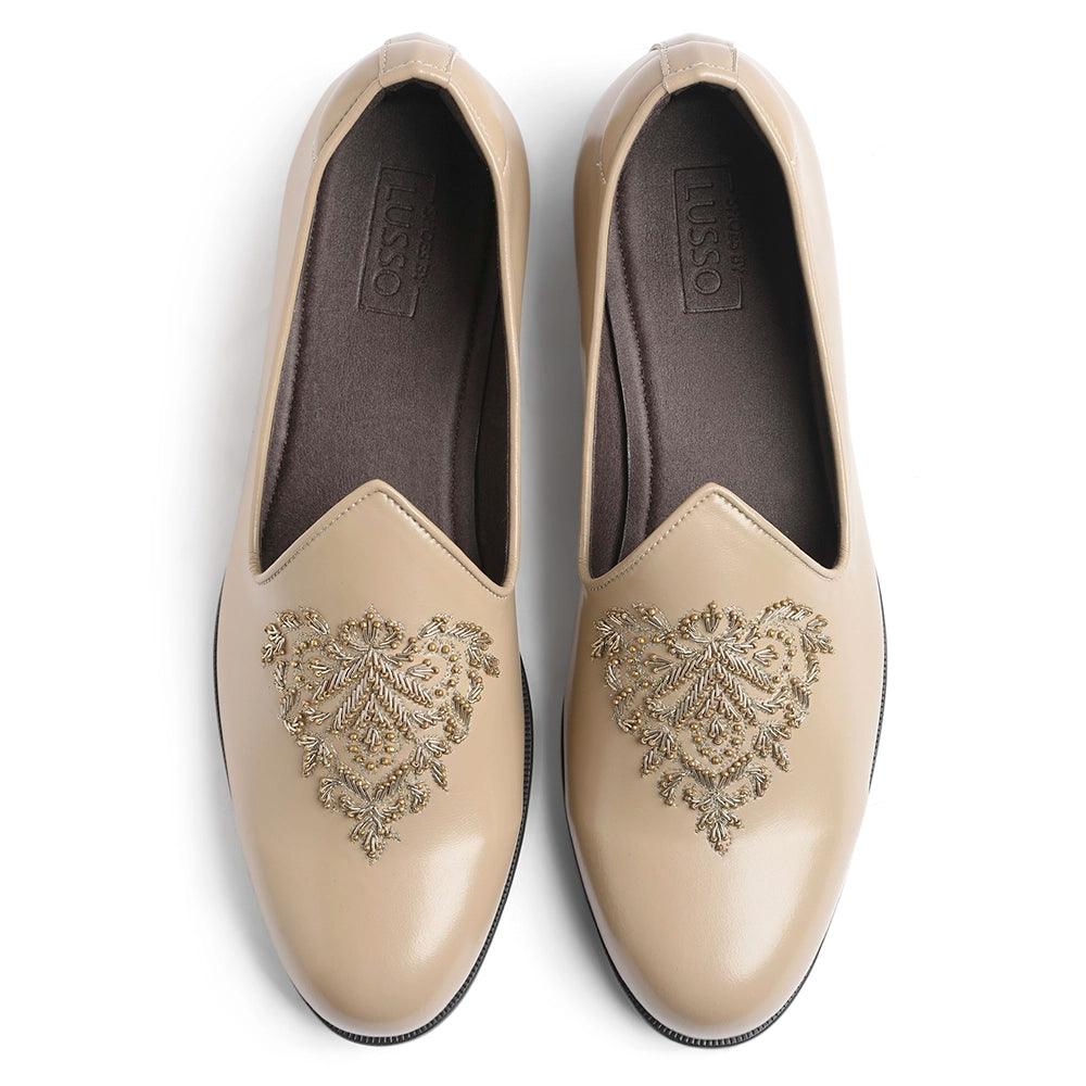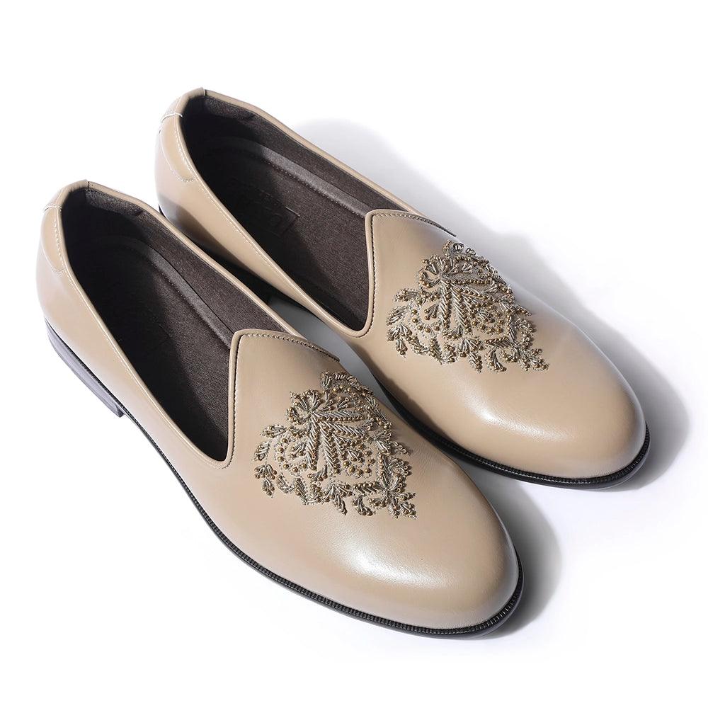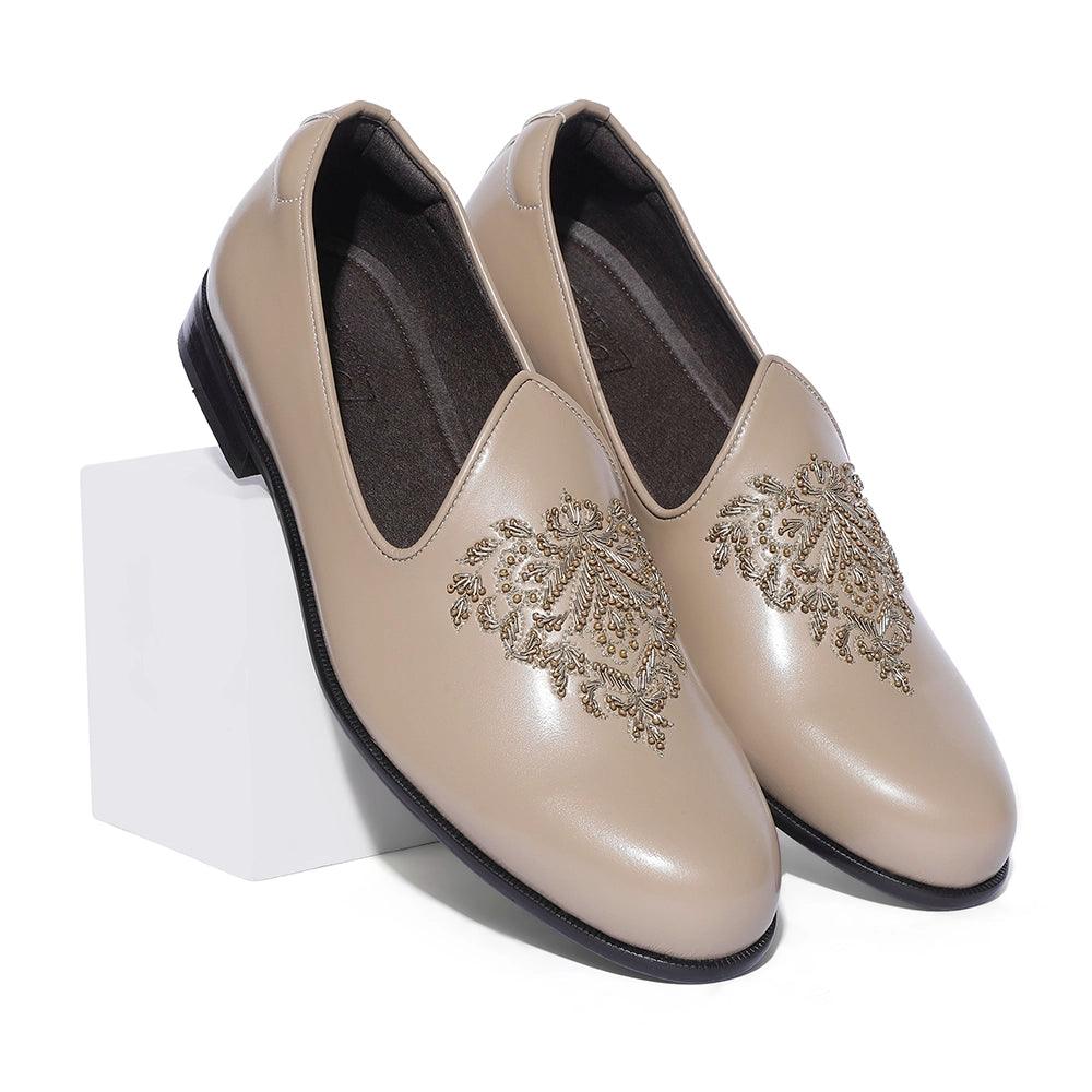 The "Joomar" is a pair that will fill you with pride and poise. These pair of mojdis are a true harmony between grace and splendour. Our beautiful beige upper is handcrafted with intricate zardosi work that represents our culture and history. Truly awe-inspiring.