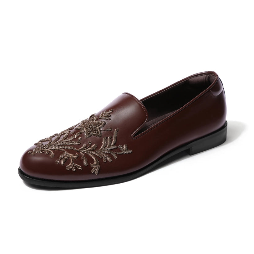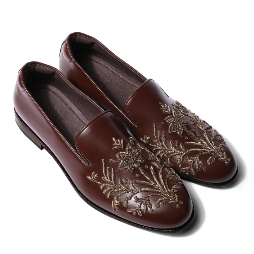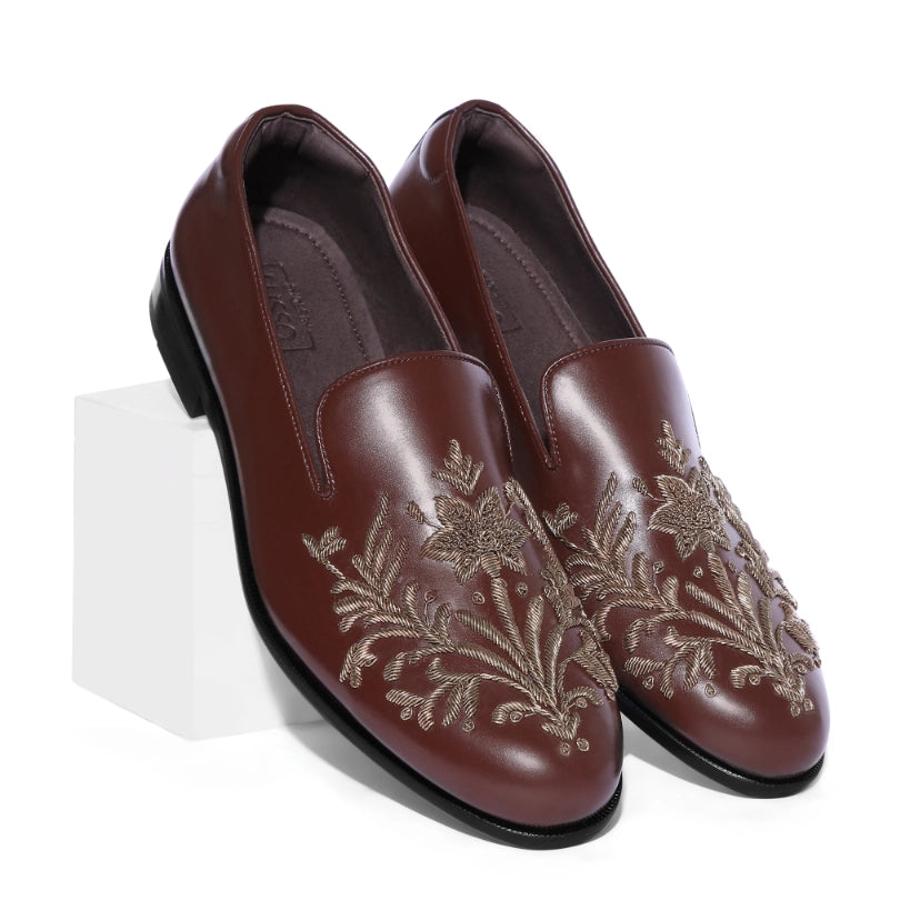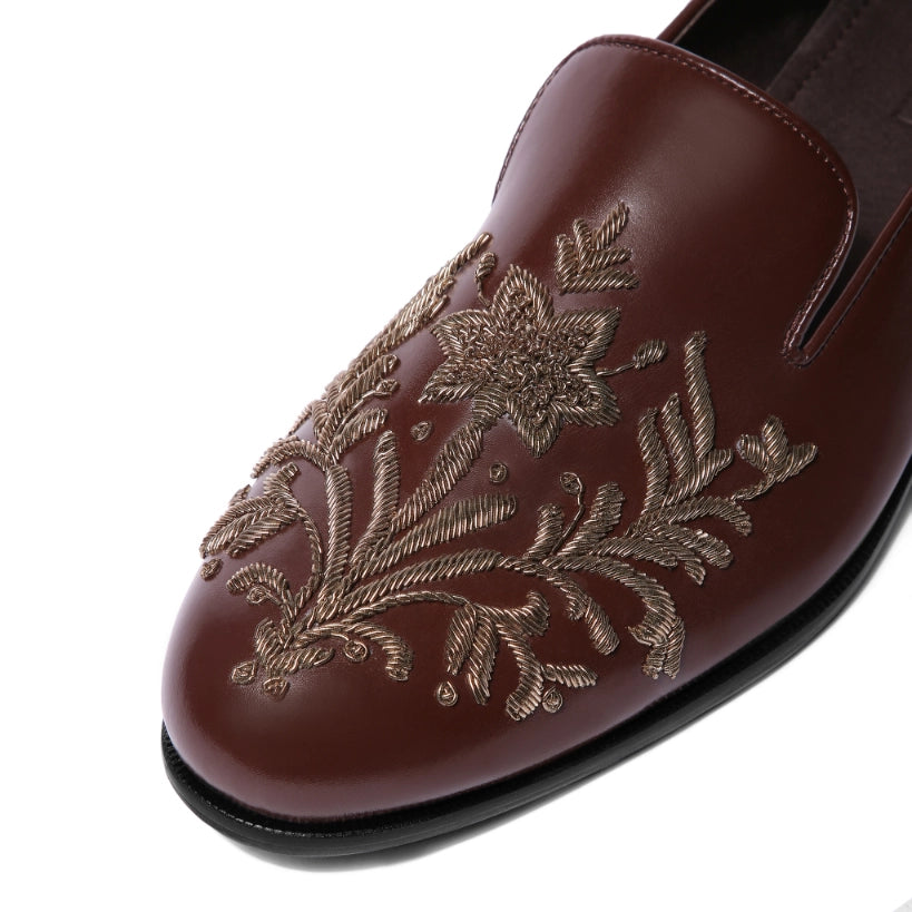A celebration captured in every stitch. The Malhaar is inspired by the moment when petals rain down upon newlyweds, a timeless symbol of blessings, joy, and festivity. Crafted in rich dark tan vegan leather, the pair features intricate floral embroidery that feels both regal and poetic. Designed for weddings and grand occasions, it’s more than a slip-on. It’s a serenade of elegance, tradition, and modern luxury rooted in heritage.