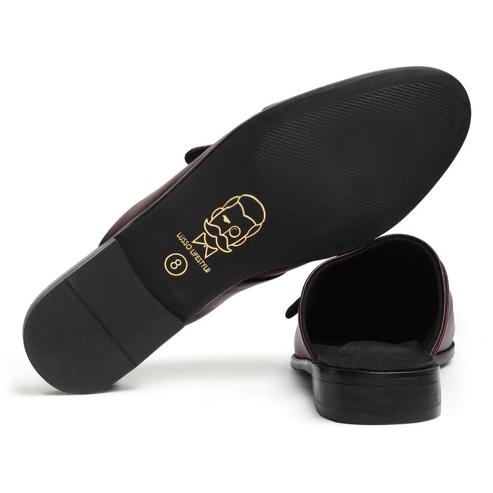The "Mason" single monk mule is a standout piece that combines the ease of a slip-on with the sophistication of a classic monk shoe. The maroon upper, with its subtle dual-tone black shading, offers depth and character, while the single buckle adds a touch of traditional style. This mule is a versatile choice that pairs well with both casual and semi-formal attire.