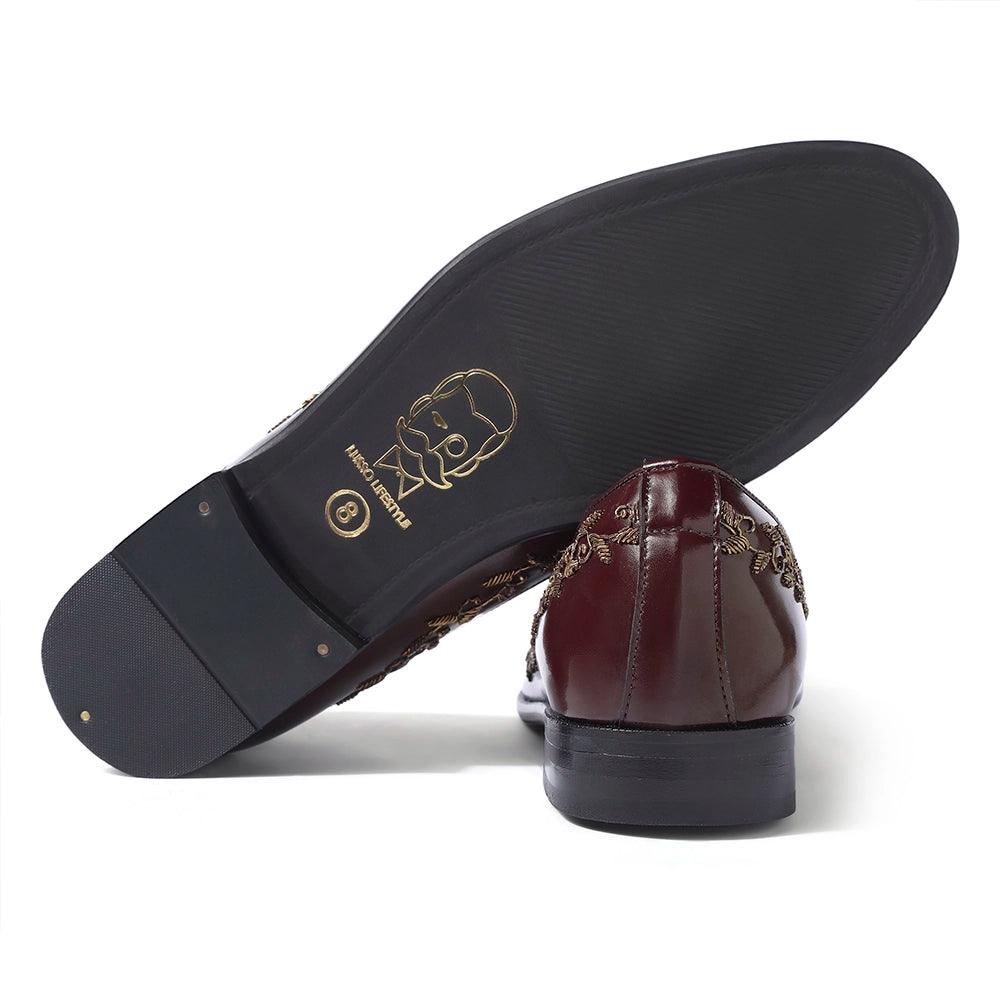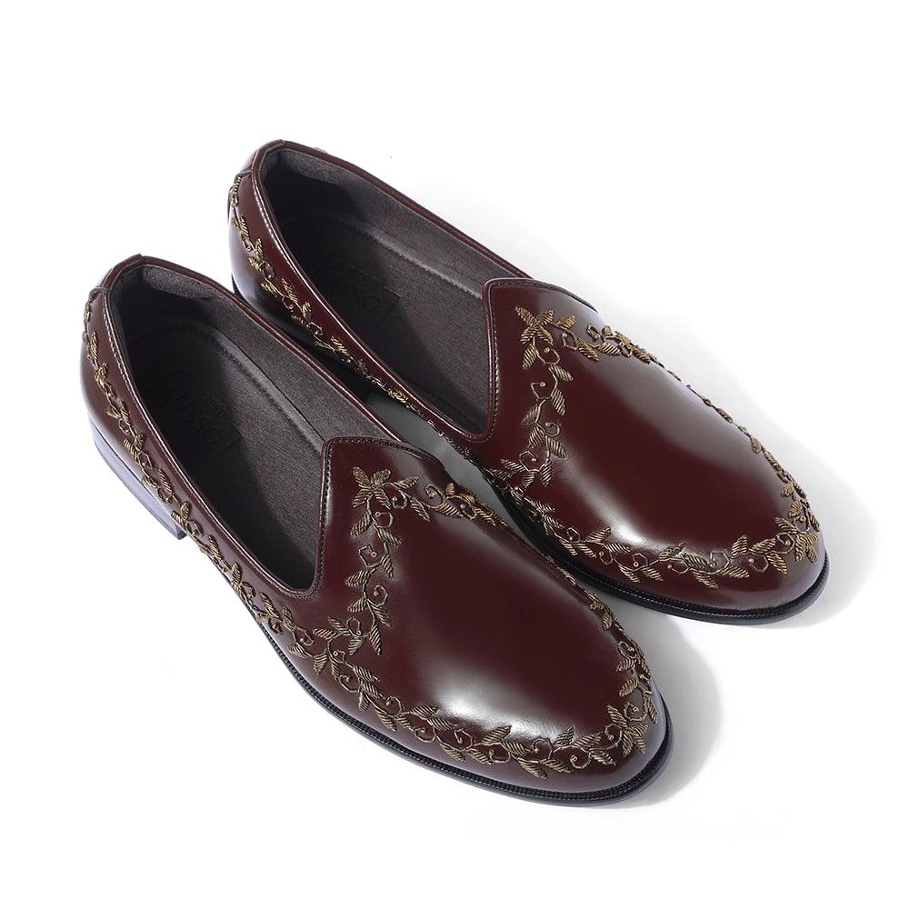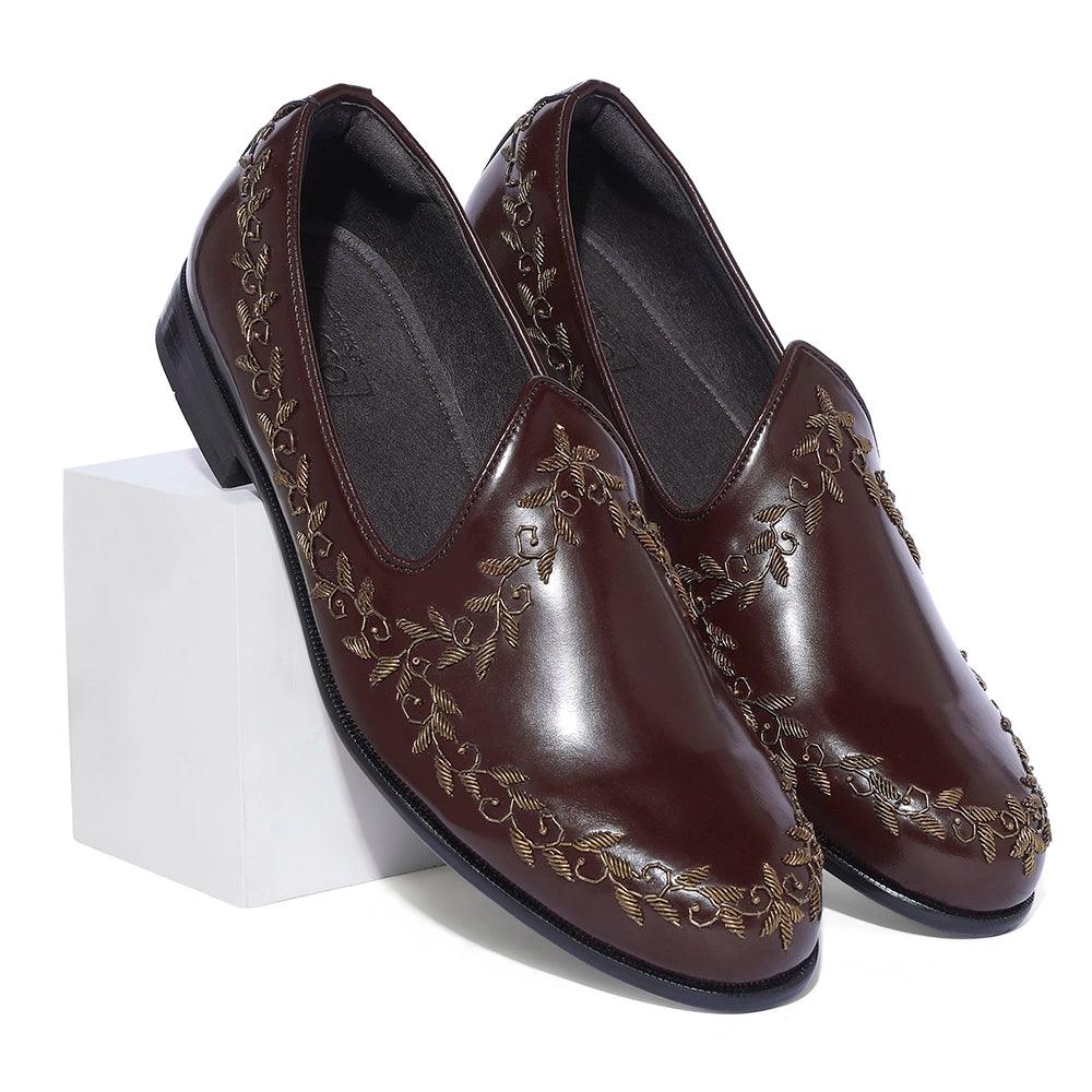 This pair signifies 'Royalty' in every sense of the word. The "Merwan" is handcrafted in our luxurious vegan dark tan upper. Contouring the silhouette are elaborately hand-worked zardozi leaves denoting garlands for the grandest of occasions.