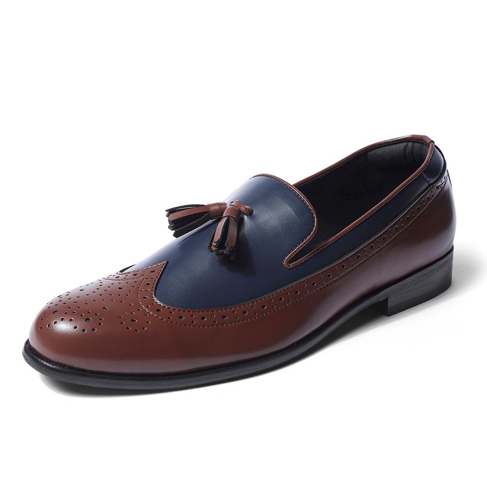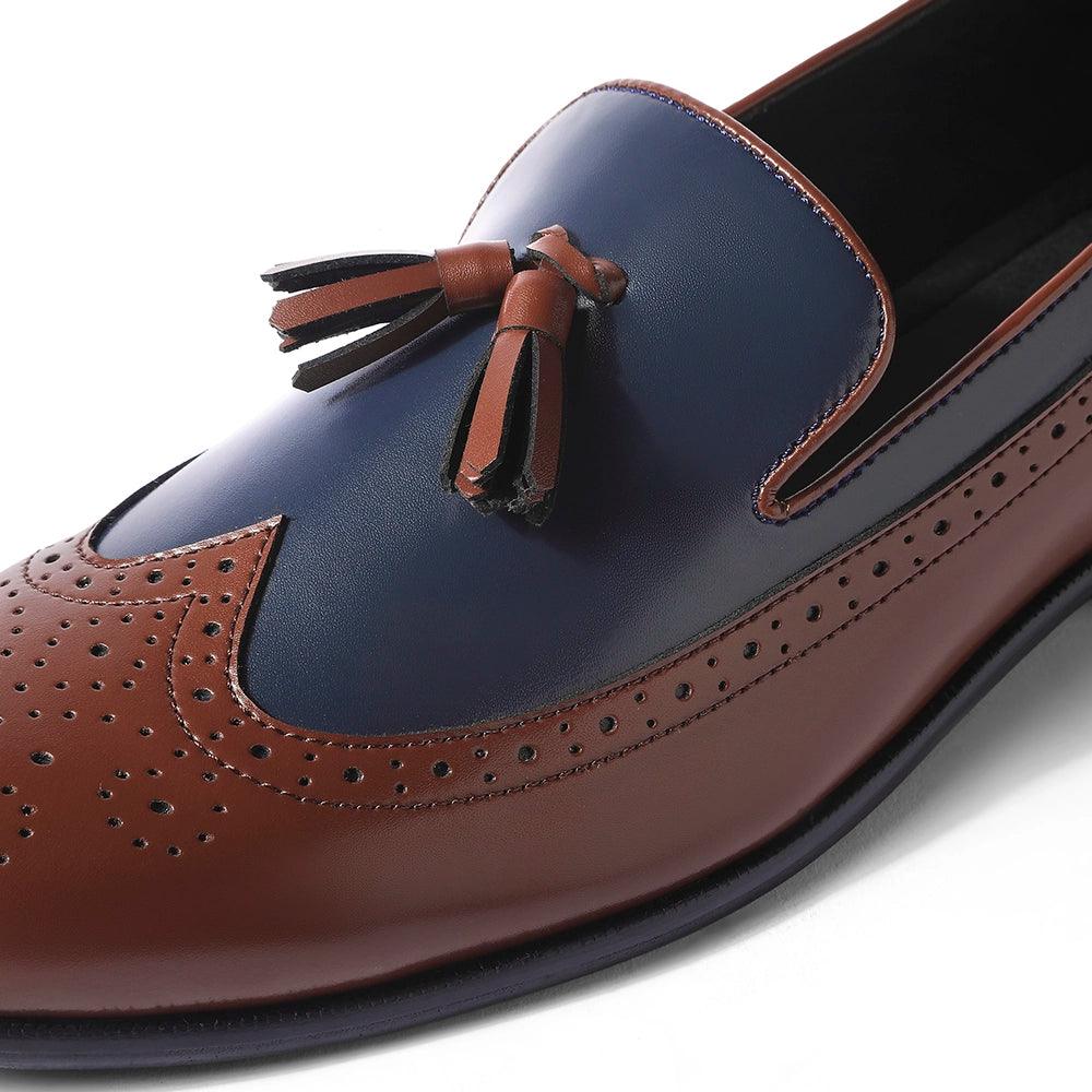 A timeless tassel loafer re-invented in our perfect silhouettes and brought to life in a rich colour way. The "Moreno" is crafted in a luxurious deep blue upper and the wingtip british tan paired with tassels complete a refined, show-stopping look.