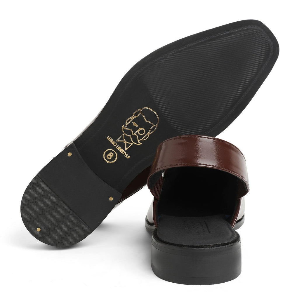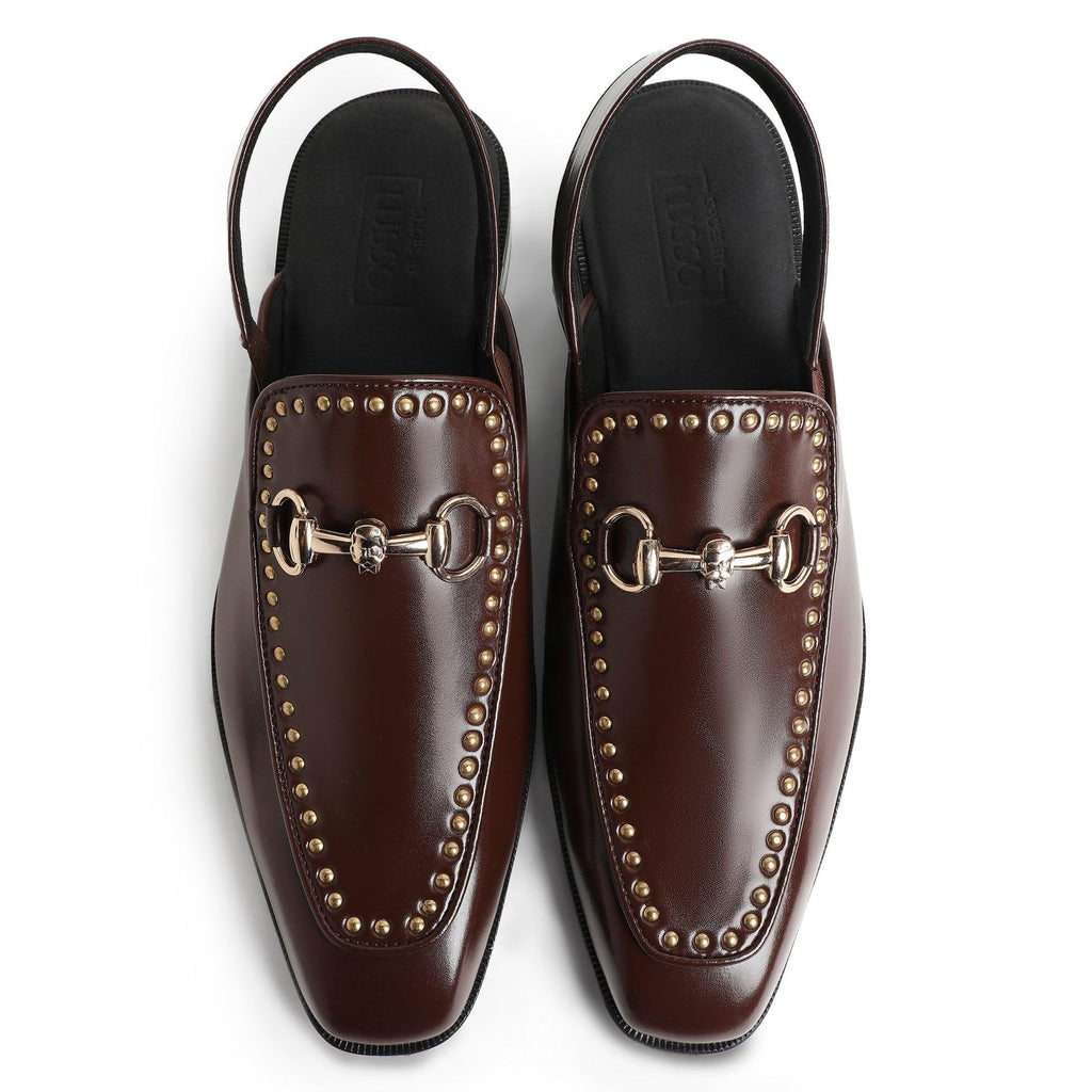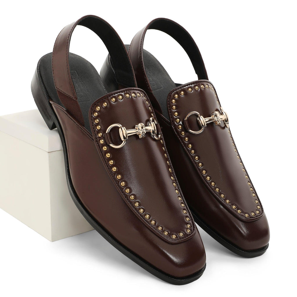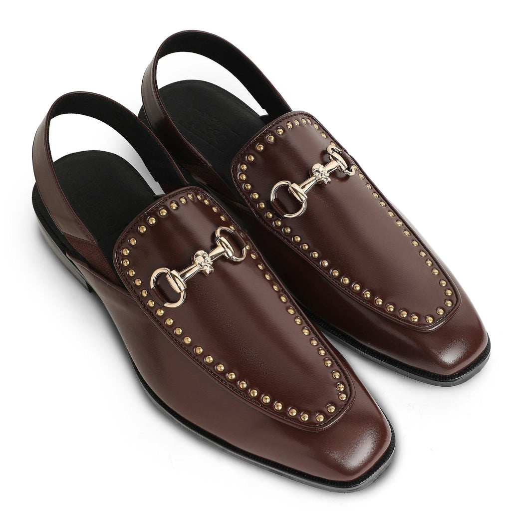 Experience the blend of traditional charm and modern elegance with our rich dark tan square toe sandals, an ideal choice for enhancing your Indian ethnic attire. The plush upper provides a soft, luxurious feel, while the striking rivets along the contour add a touch of bold sophistication. A classic horsebit buckle completes the look, offering a timeless appeal. These sandals are not only a nod to classic style but also a perfect match for the contemporary fashion landscape.