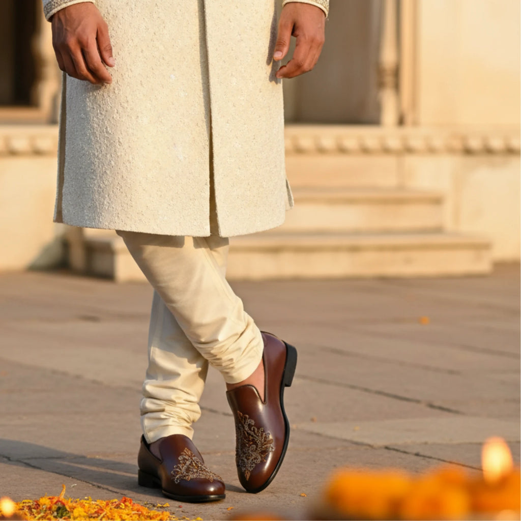 The Jumera draws its inspiration from the grand chandeliers and jhoomars that once lit royal durbars. Every thread of its Zardosi embroidery captures that same glow, ornate yet balanced, detailed yet dignified. The golden handwork glimmers softly against rich dark tan vegan leather, making it an ideal match for sherwanis and regal festive wear. Jumera is designed for moments that deserve presence, when every step feels like you're walking through a palace hall.