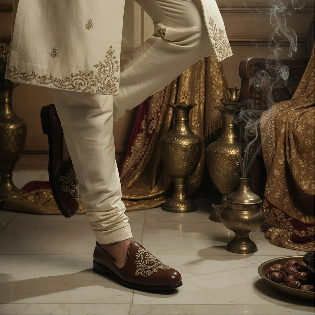 Its embroidery rises like the regal crest of a Kalgi, detailed with fine zardosi handwork that glints softly against the tan vegan leather base. Each curve is a nod to heritage, each stitch a reflection of poise.