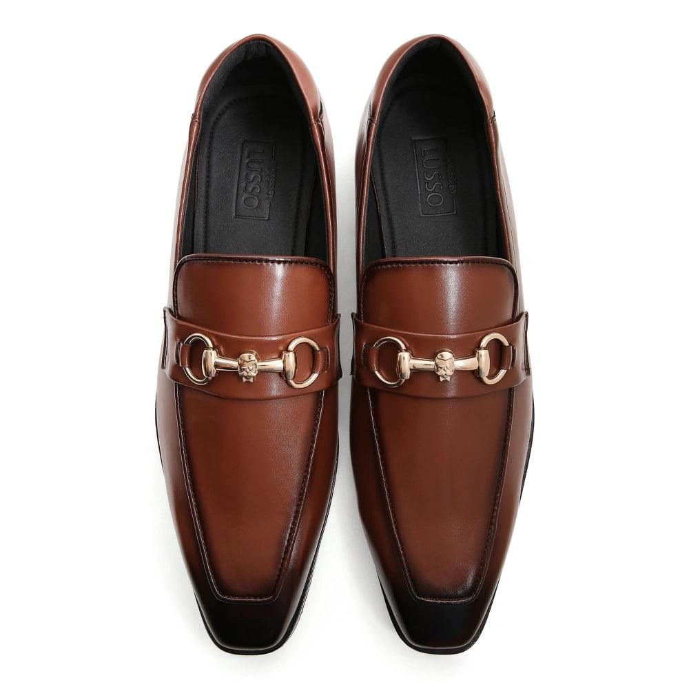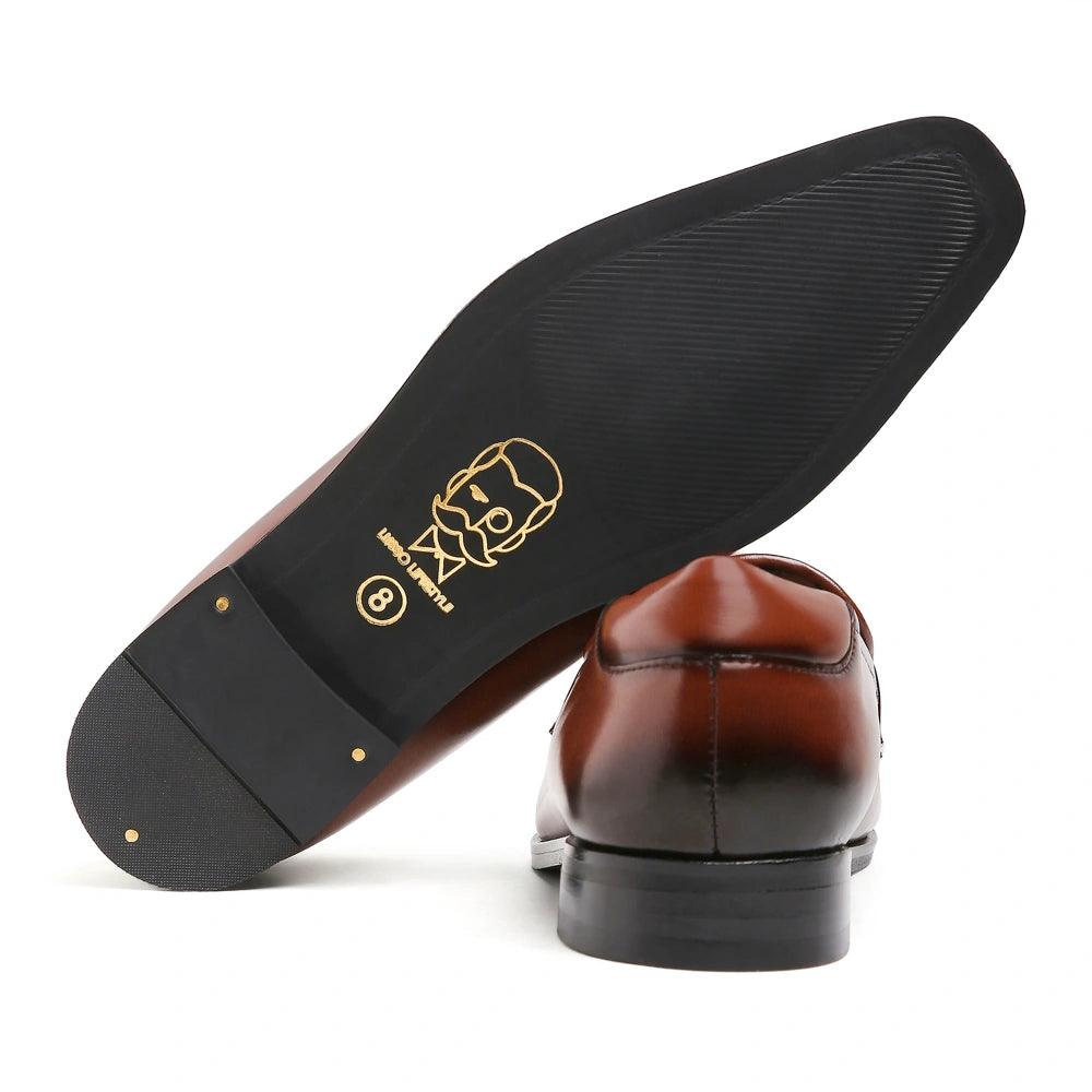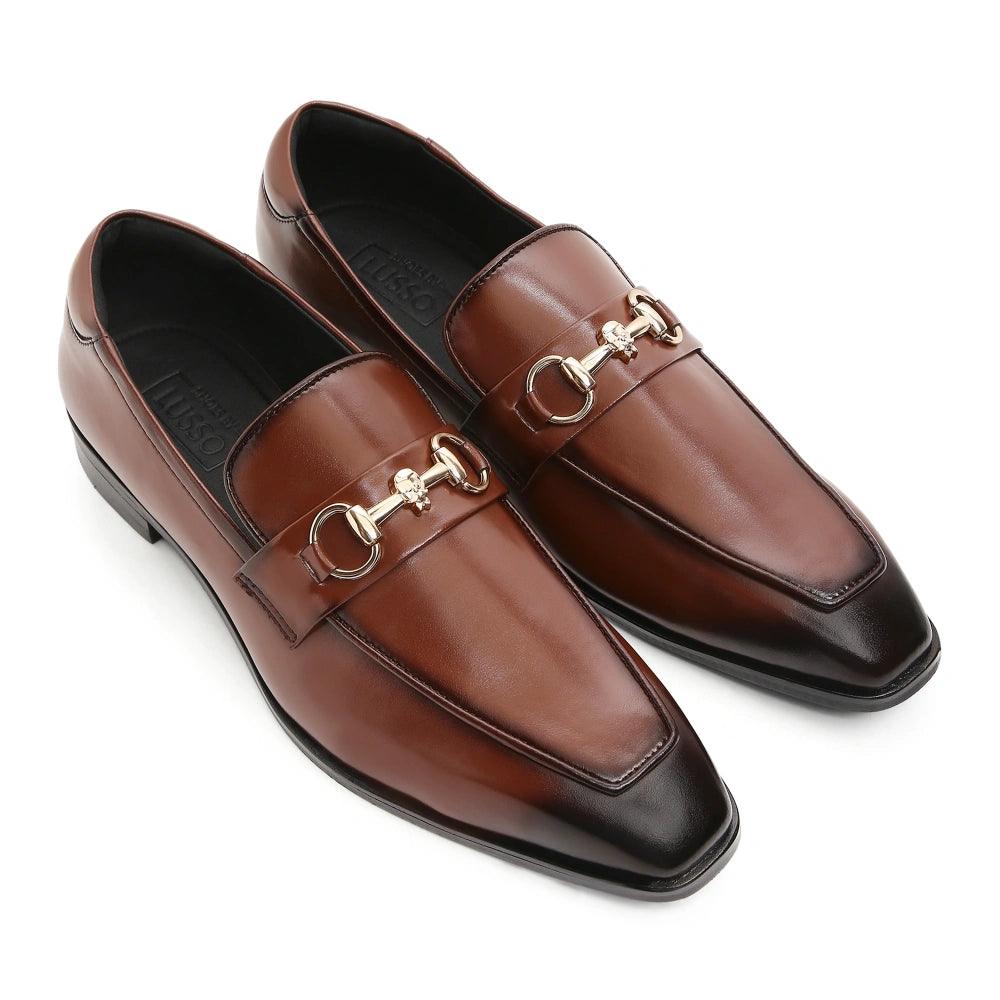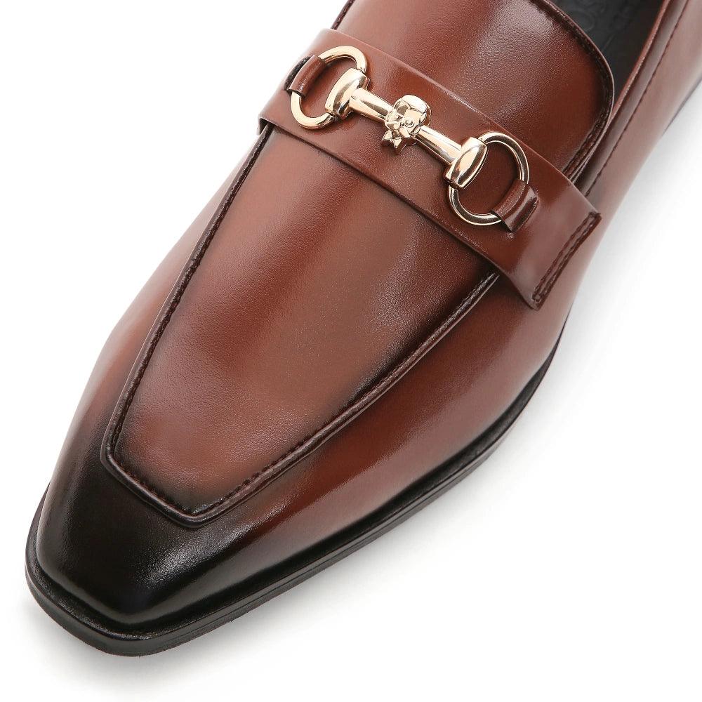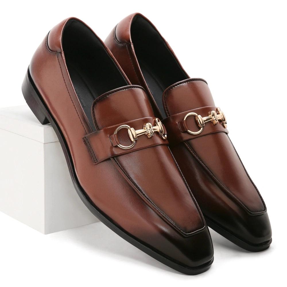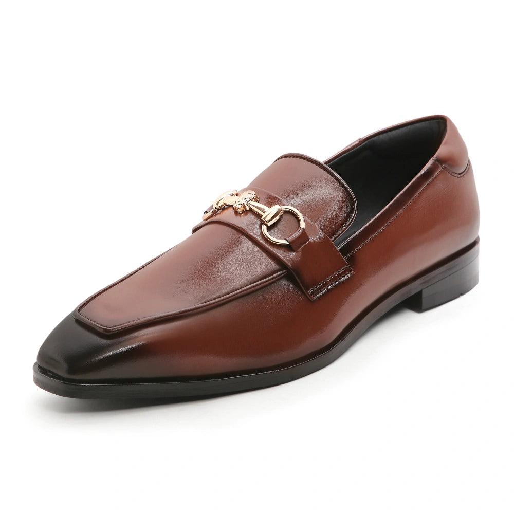The "David - Square Toe Slip-on" is a masterpiece that exudes luxury and class. The craftsmanship is evident in every detail, from the ageless square toe to the refined perfection of the British Tan Vegan Leather. The subtle yet striking gun-metal horse bit adds a touch of sophistication to the already elegant silhouette. Slip into the "David" and step out in style, knowing that every step you take will turn heads and make a statement of timeless elegance.