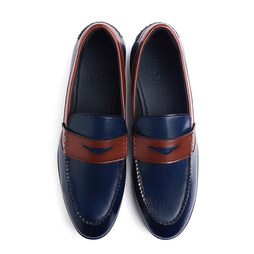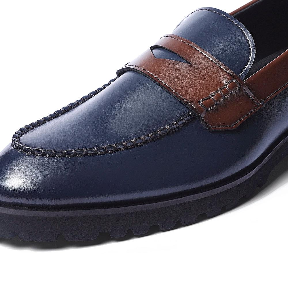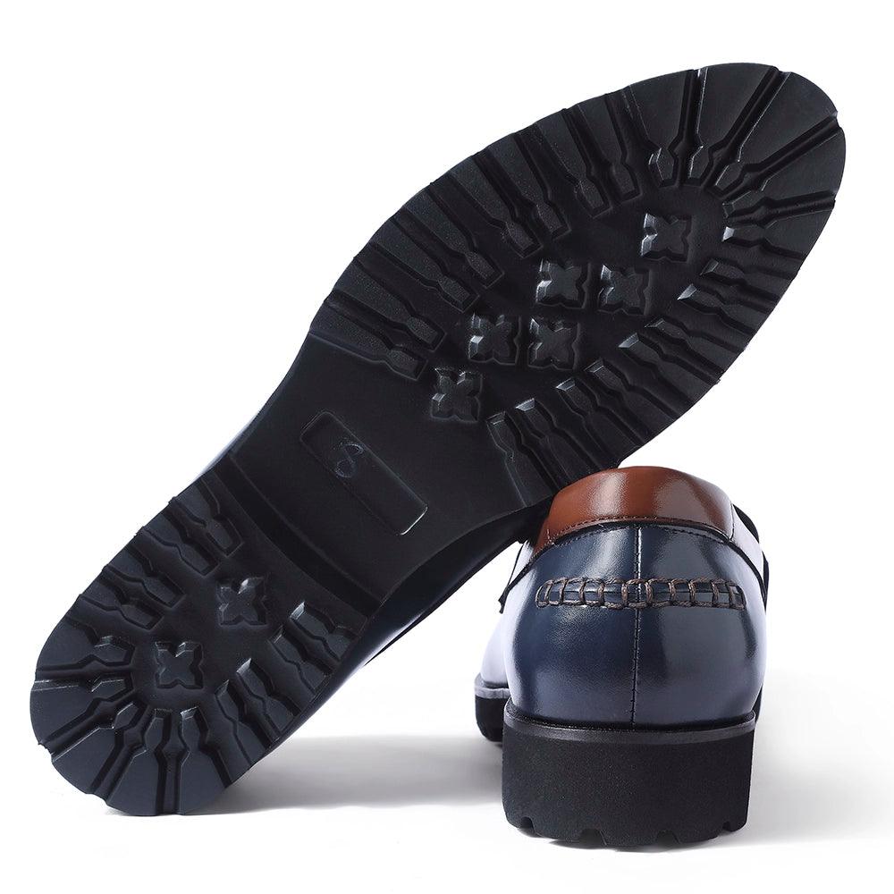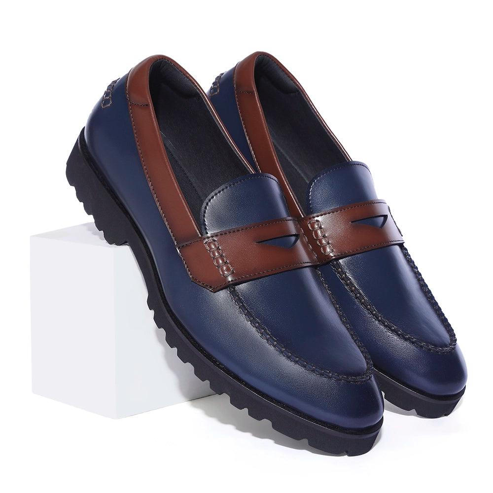 Introducing the 'Windon' Chunky Loafers with our exclusive Featherlite technology. This pair of chunky penny loafers is designed to give you the best of comfort and a subtle yet catchy colourway. The Windon is crafted in a blue upper and contrasts with our tan penny strap to give you an iconic look. Style these with a straight-fit bottom, a neutral vest and an overshirt for a statement look.