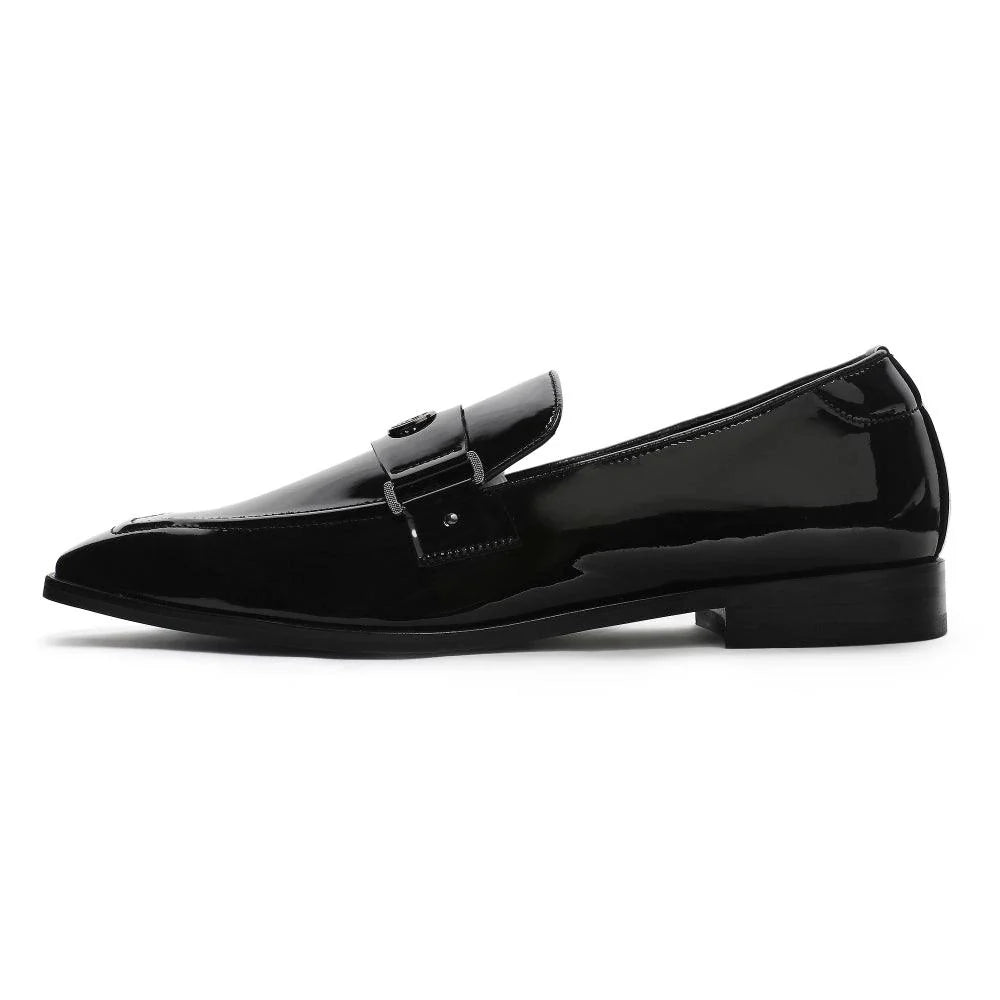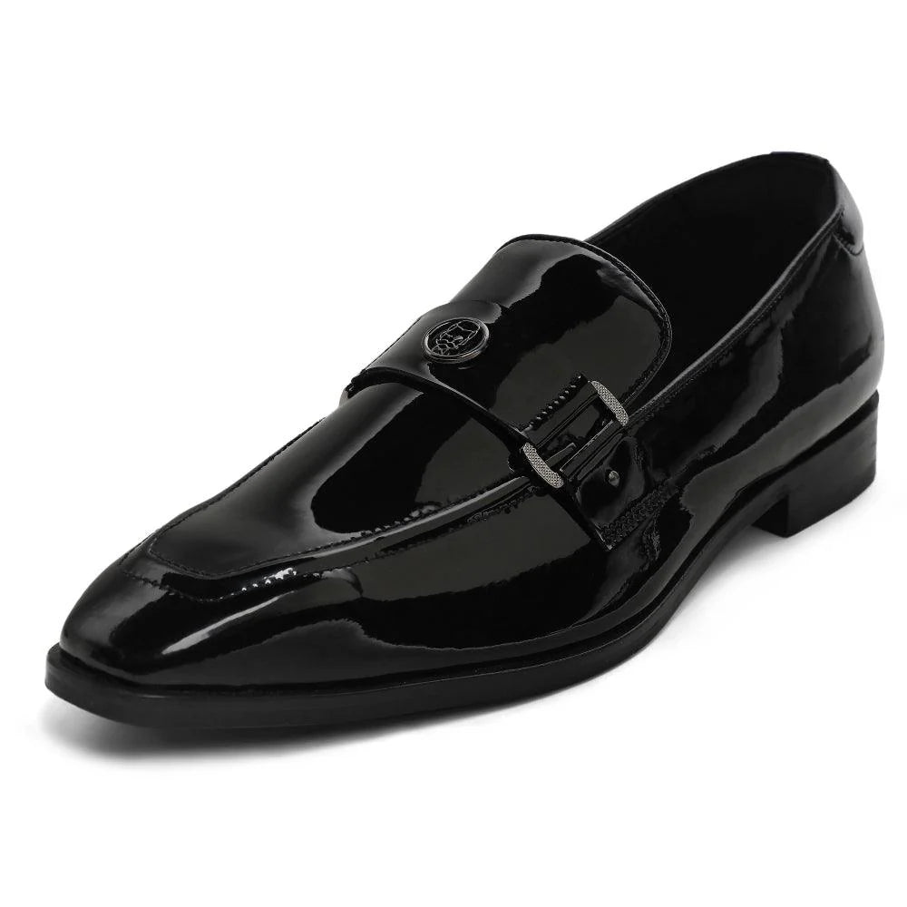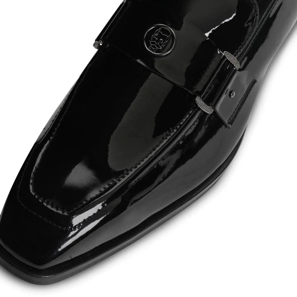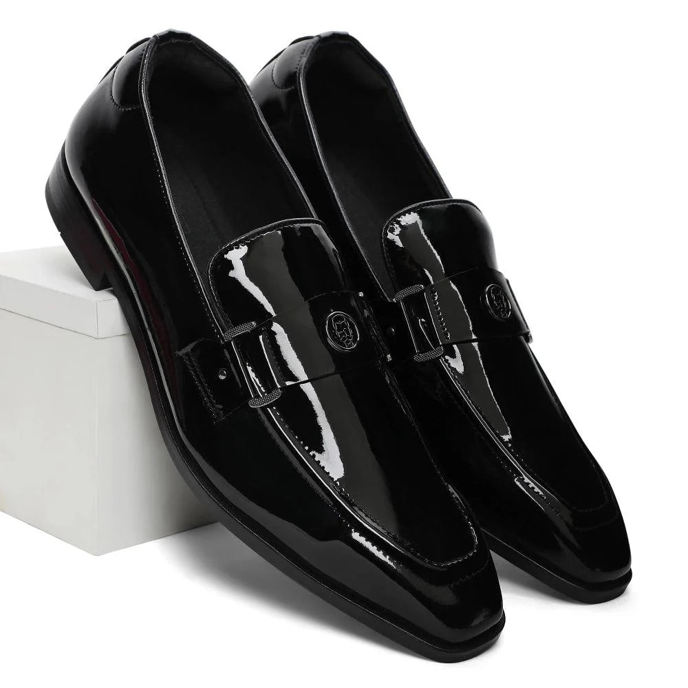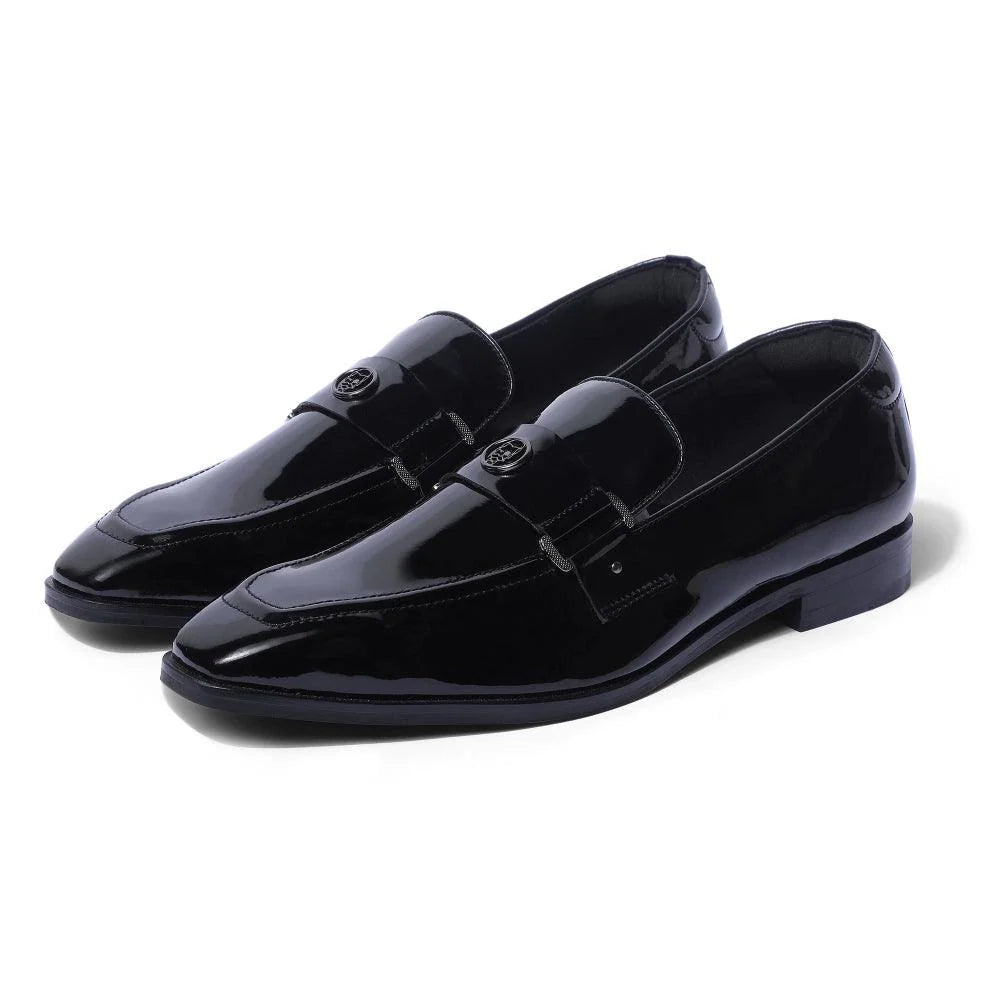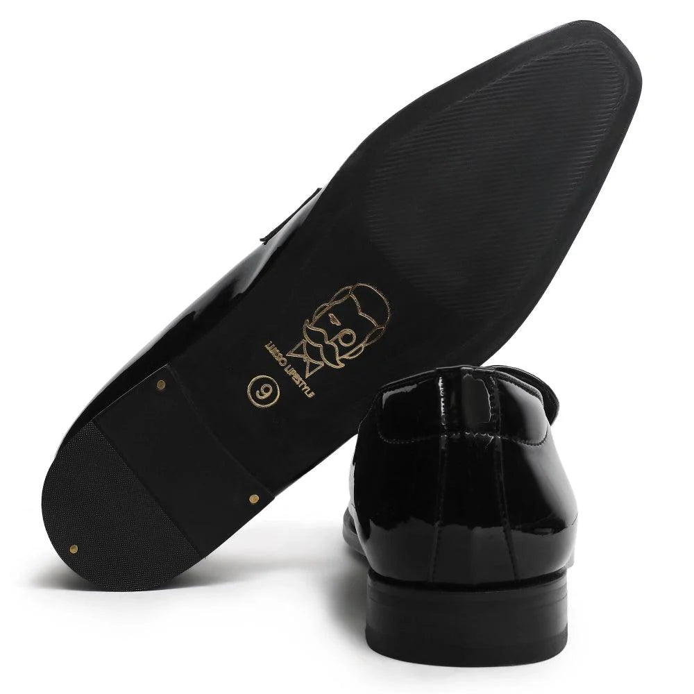 The "Allan - Black Patent Square Toe Loafer" is a masterpiece that exudes luxury and class. The craftsmanship is evident in every detail, from our signature square-toe silhouette to the eye-catching patent black vegan leather. Our iconic Lusso Logo in gun metal finish ornates this pair to add a bling to your ensemble. The "Allan" is exactly what you need to bring the A-game to your next black-tie event. A perfect option for your Tuxedos, Suits and Heritage outfits.