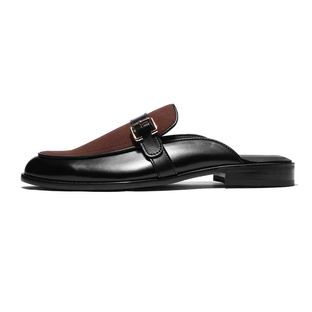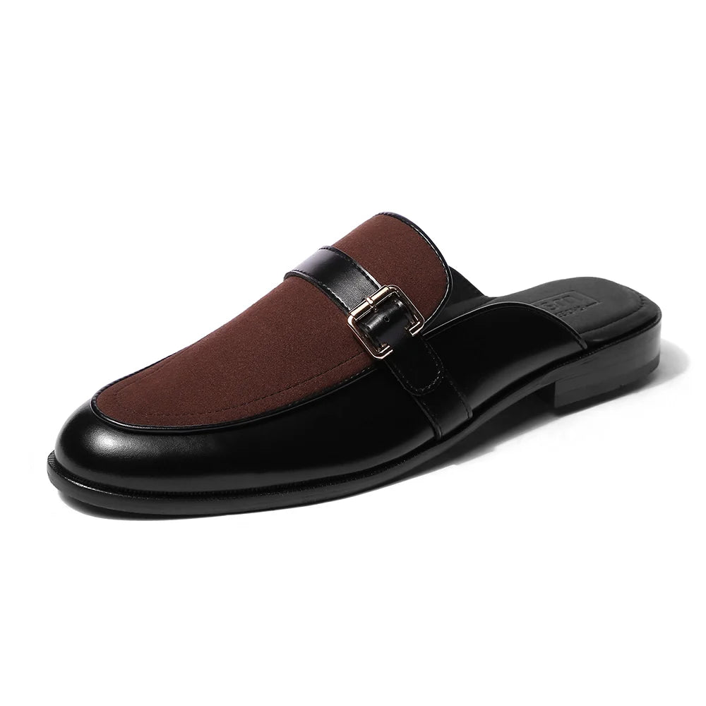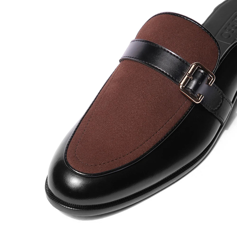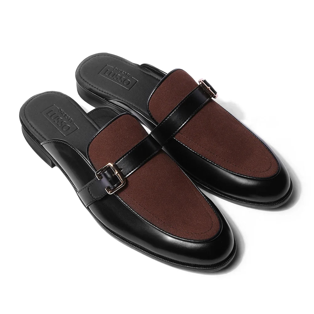 Duco is designed to stand out, but quietly. Bold in structure, rich in finish, and confident in detail. The soft brown suede body brings depth and texture, while black trims add polish and clarity. A gold buckle elevates the mules from simple to statement.