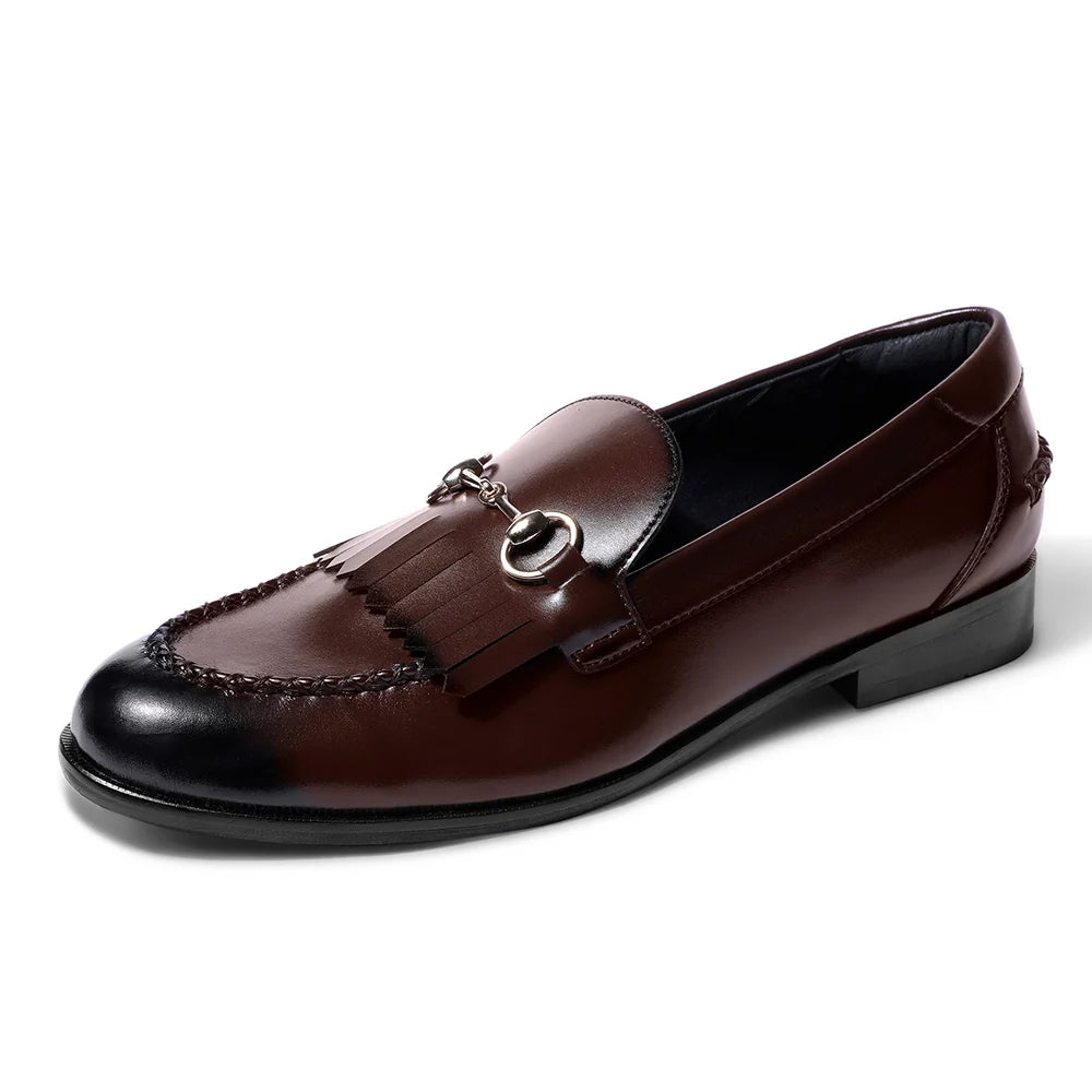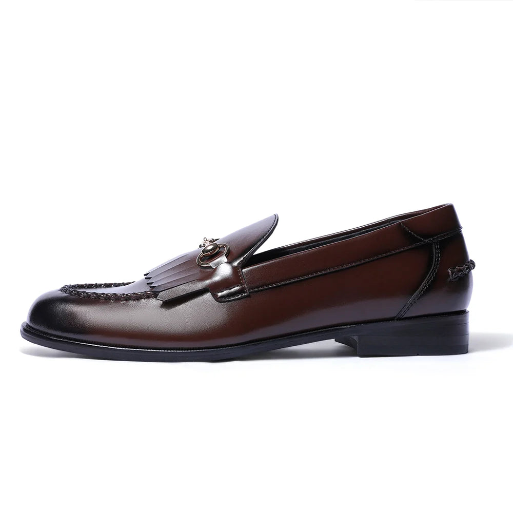 For the man who masters the art of understated luxury, the Gustoso 2.0 delivers. Crafted in rich dark tan leather with a smooth, polished finish, these loafers are adorned with the signature gold-tone horsebit and refined kiltie fringe. Versatile yet commanding, they bring effortless sophistication to every step, from tailored suits to relaxed weekend ensembles.