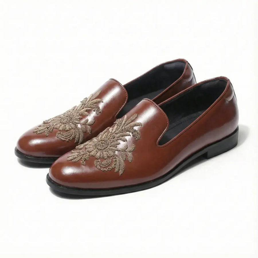 Mehroz celebrates the artistry of heritage florals through an intricately embroidered zardosi motif, crafted in antique metallic threads. Set against warm Brtish Tan Vegan leather, the motif opens like a regal bloom, detailed, layered, and emanating quiet grandeur. Designed for wedding ensembles, festive evenings, and refined ethnic wear, Mehroz is a tribute to timeless craft elevated for the modern gentleman. With every step, it carries the grace of tradition and the poise of understated luxury.