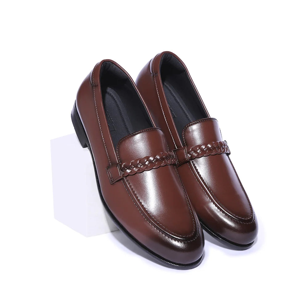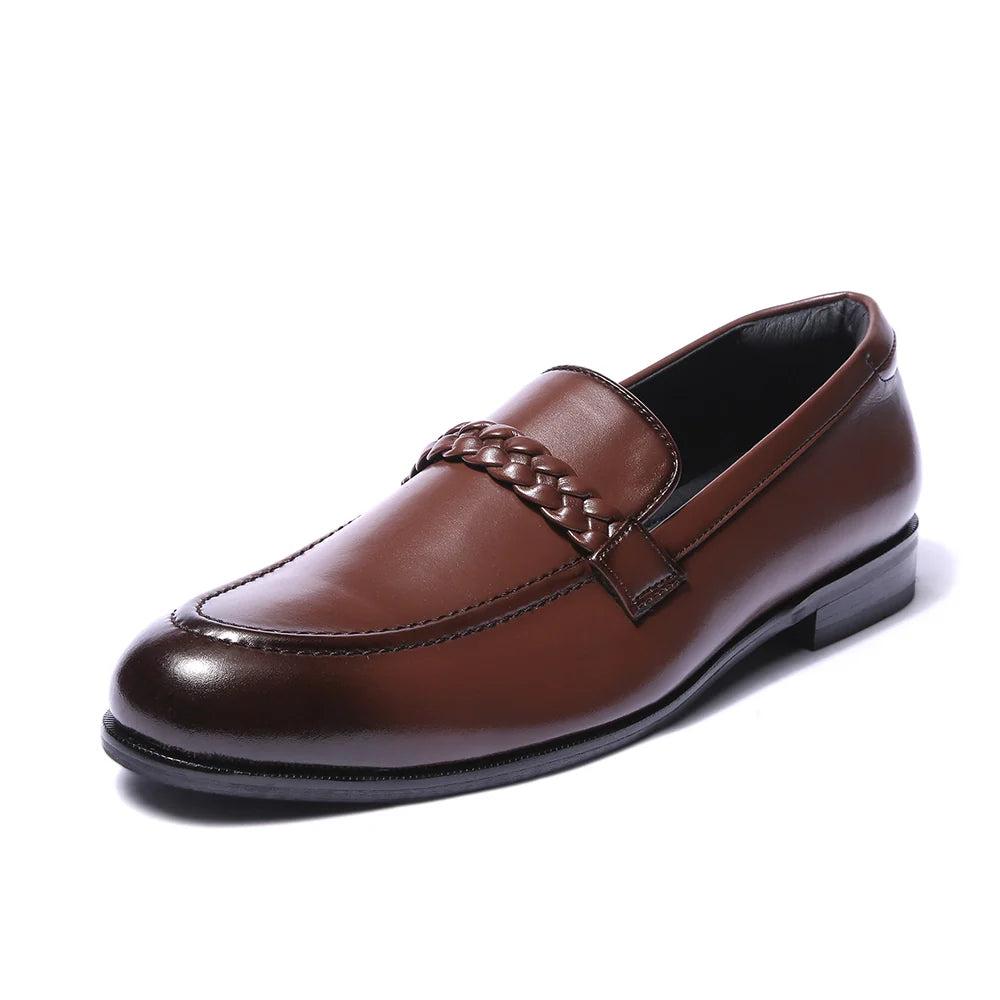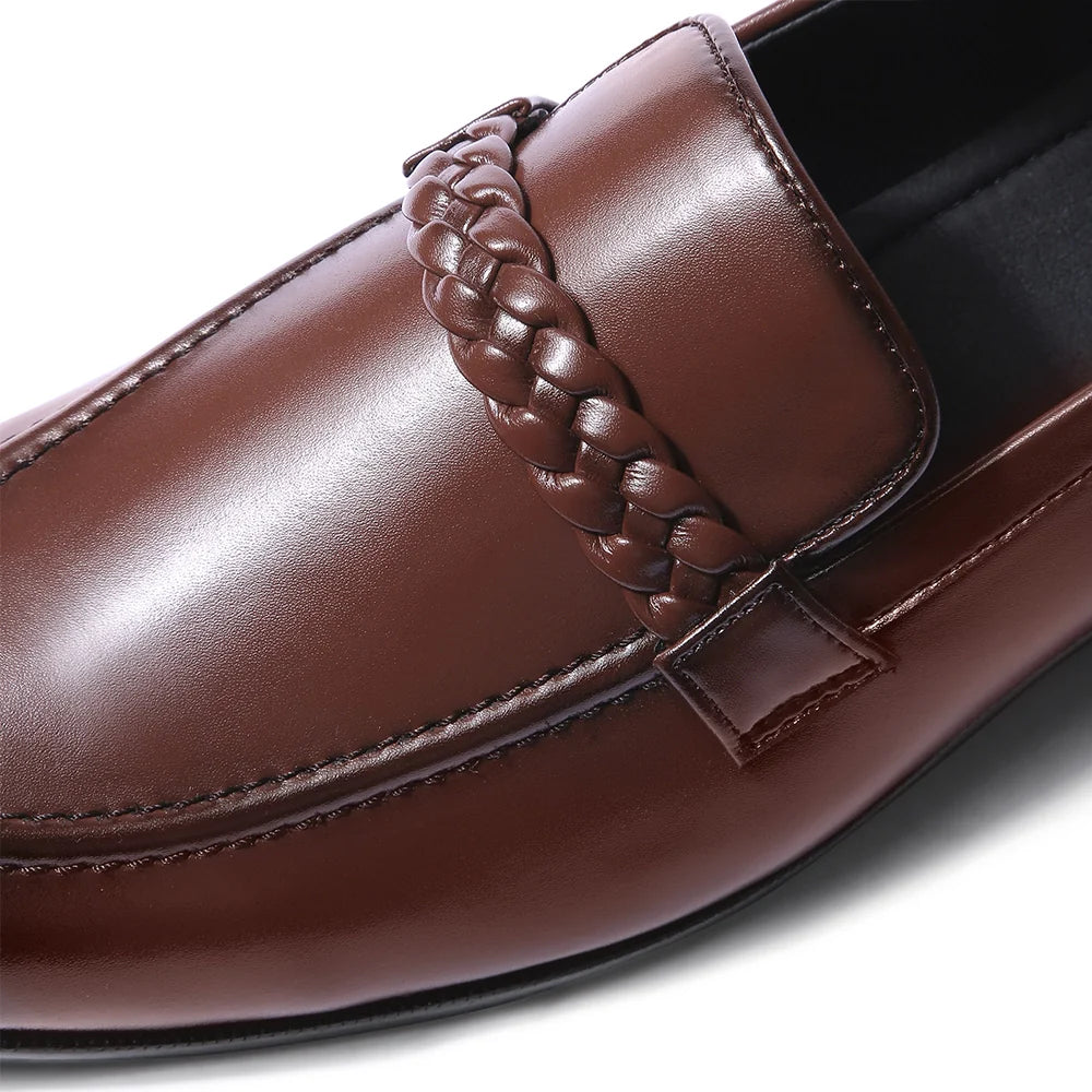 Presenting the Saran, a refined balance of modern minimalism and timeless craftsmanship. Handcrafted in smooth British tan vegan leather, its defining detail is the braided woven strap across the vamp, adding subtle texture to a clean silhouette. The burnished finish at the toe lends depth and richness, making it perfect for both tailored formals and relaxed evening wear. Light, flexible, and effortlessly versatile, Saran is designed for the man who values quiet sophistication over loud statements.