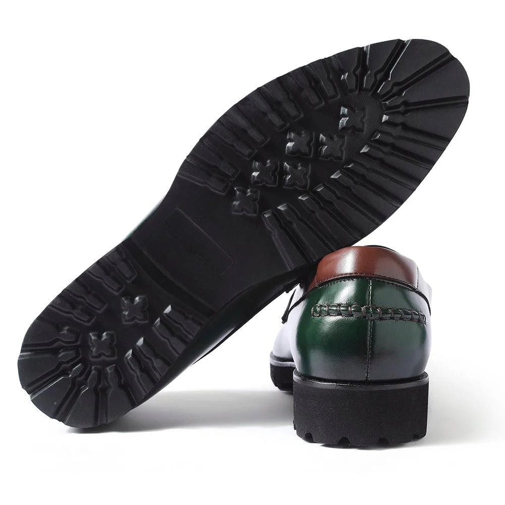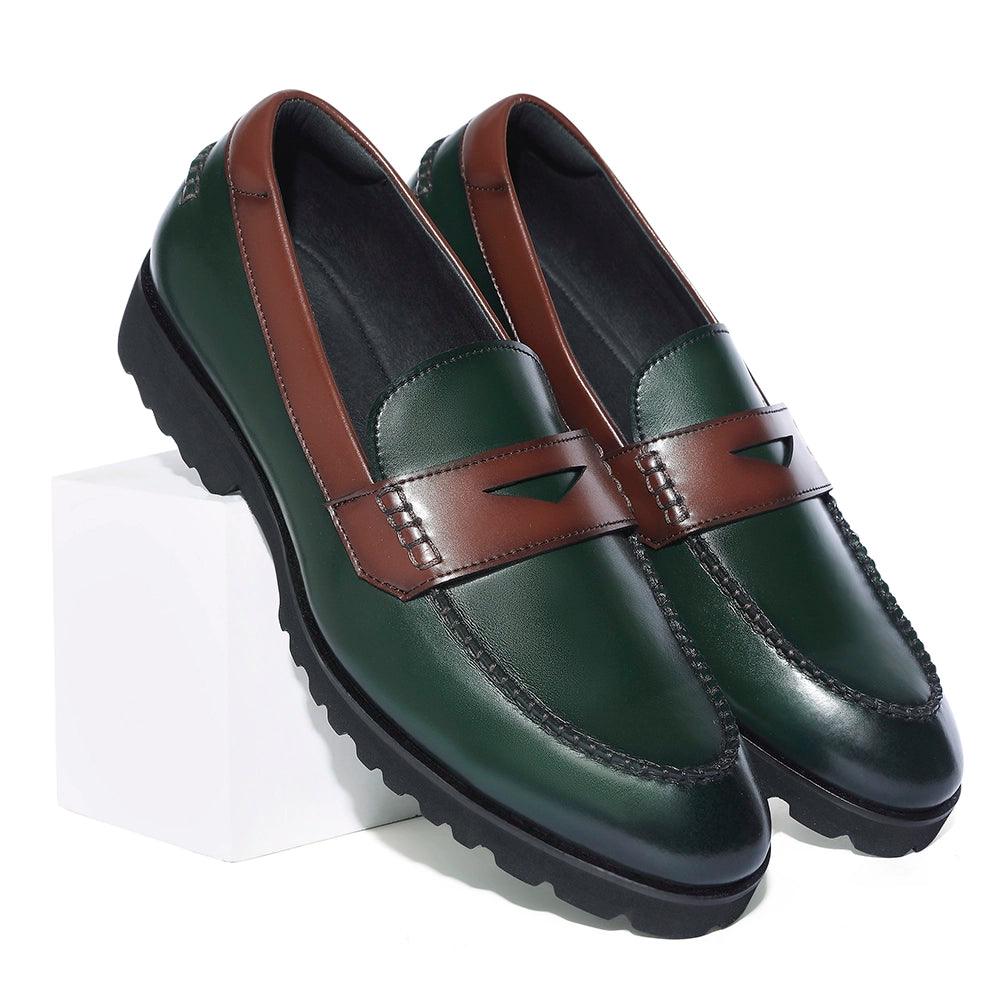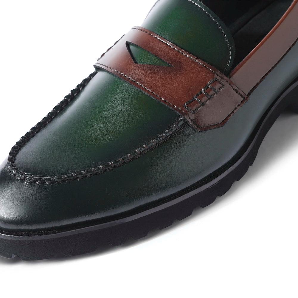 Introducing the 'Windon' Chunky Loafers with our exclusive Featherlite technology. This pair of chunky penny loafers is designed to give you the best of comfort and a subtle yet catchy colourway. The Windon is crafted in a green upper and contrasts with our tan penny strap to give you an iconic look. Style these with a straight-fit bottom, a neutral vest and an overshirt for a statement look.