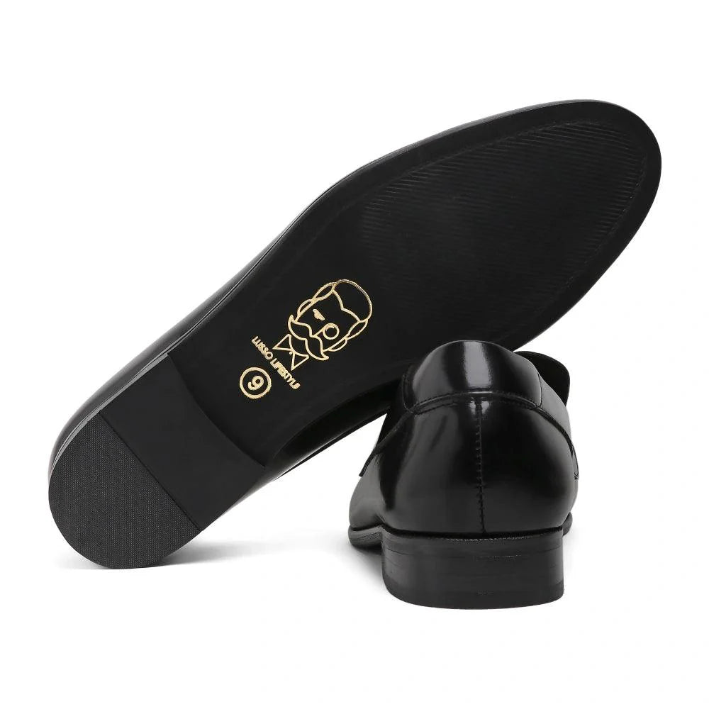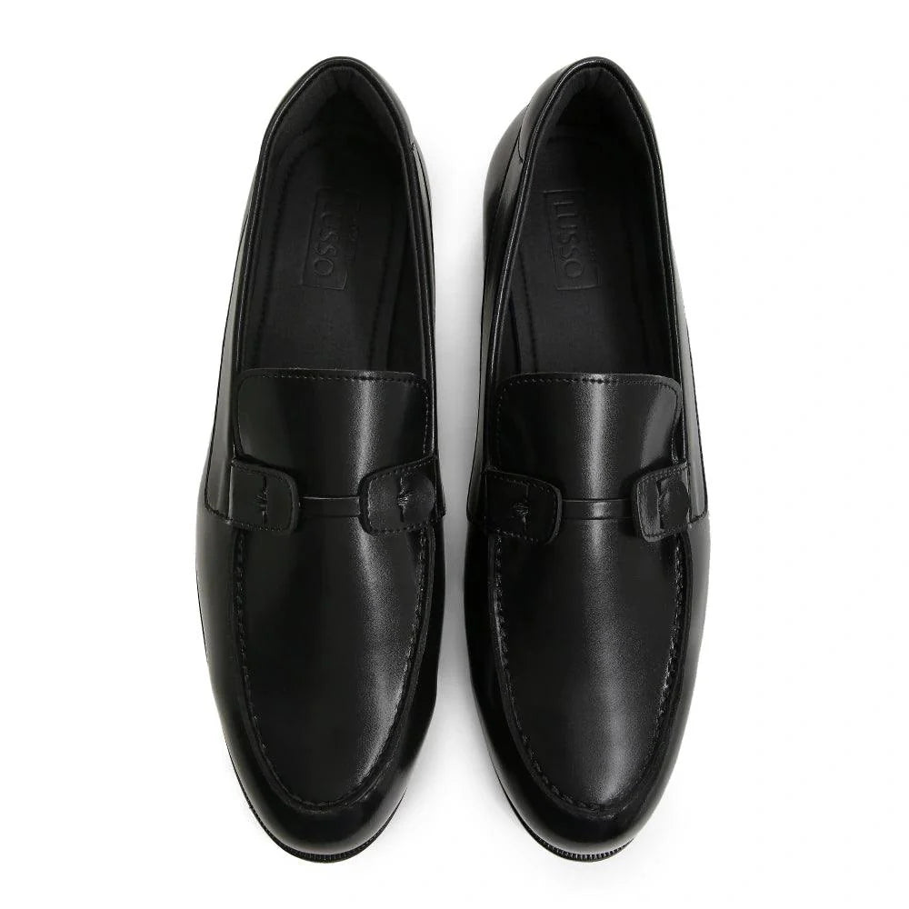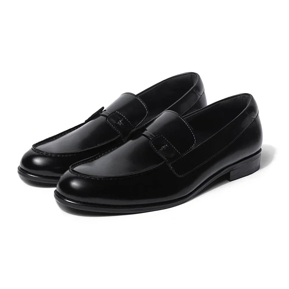 Made for the true gentlemen, these ultra-modern loafers are finely crafted and designed for a look that resonates with class and luxury. The "Baldwin" - Black Slip-on is a pair that redefines elegance with every stitch. A subtle yet noticeable semi-circle loop on either side of the tongue in our signature evergreen, round-toe silhouette creates a story of confidence and comfort weaved together.