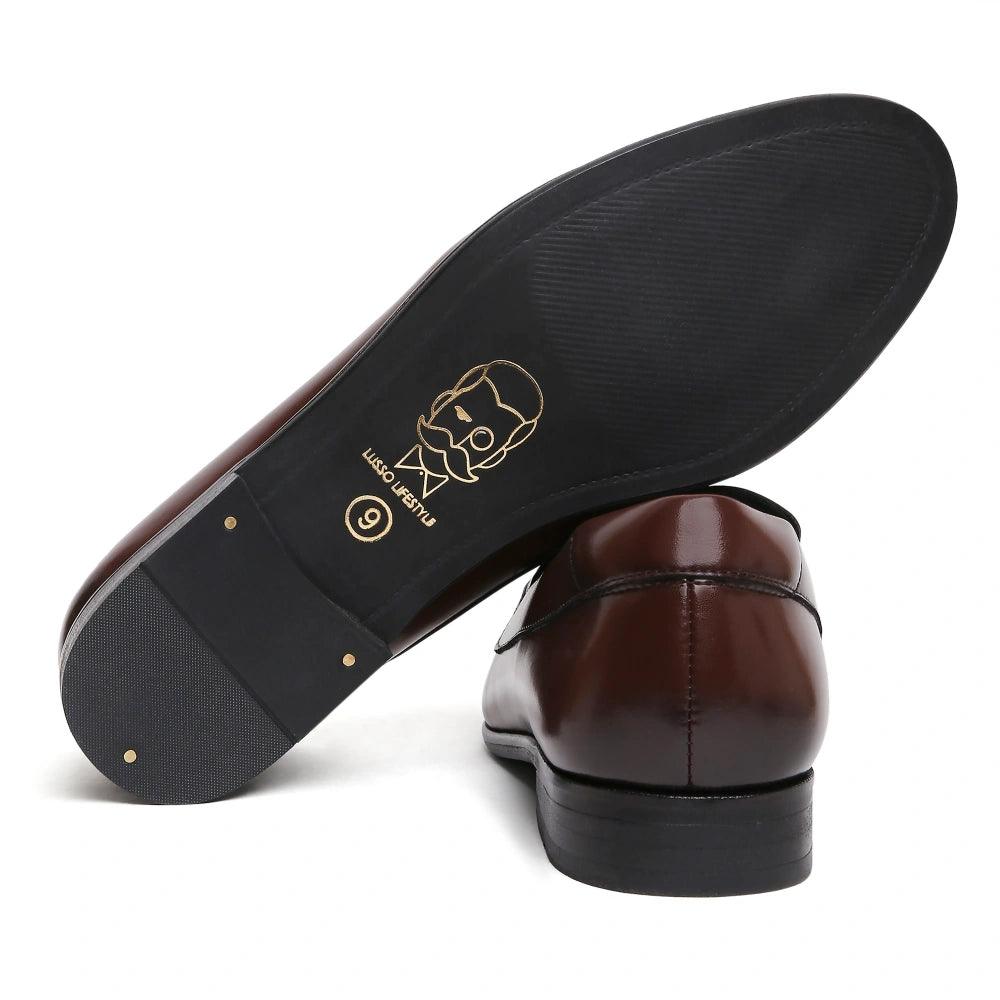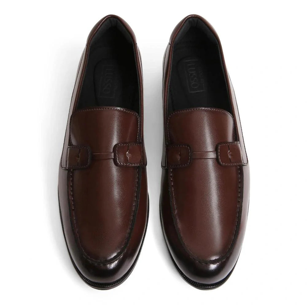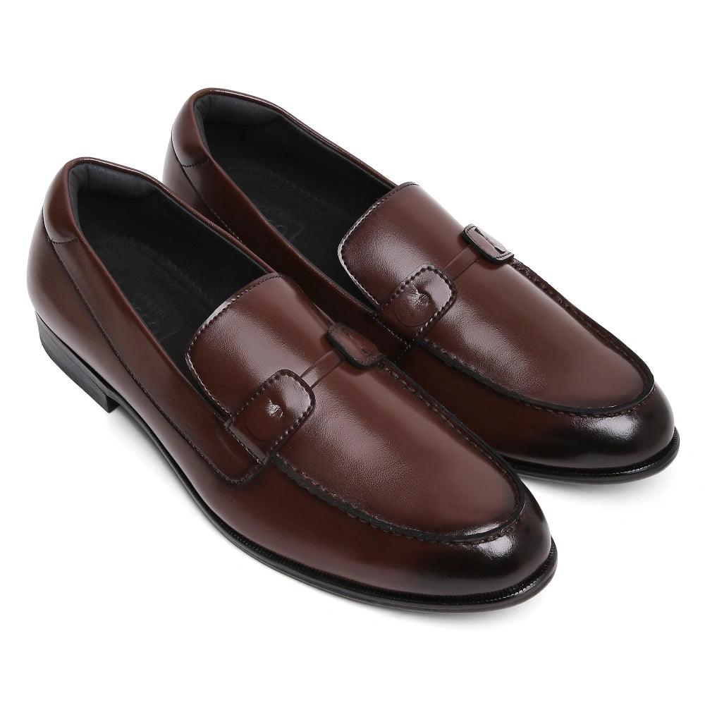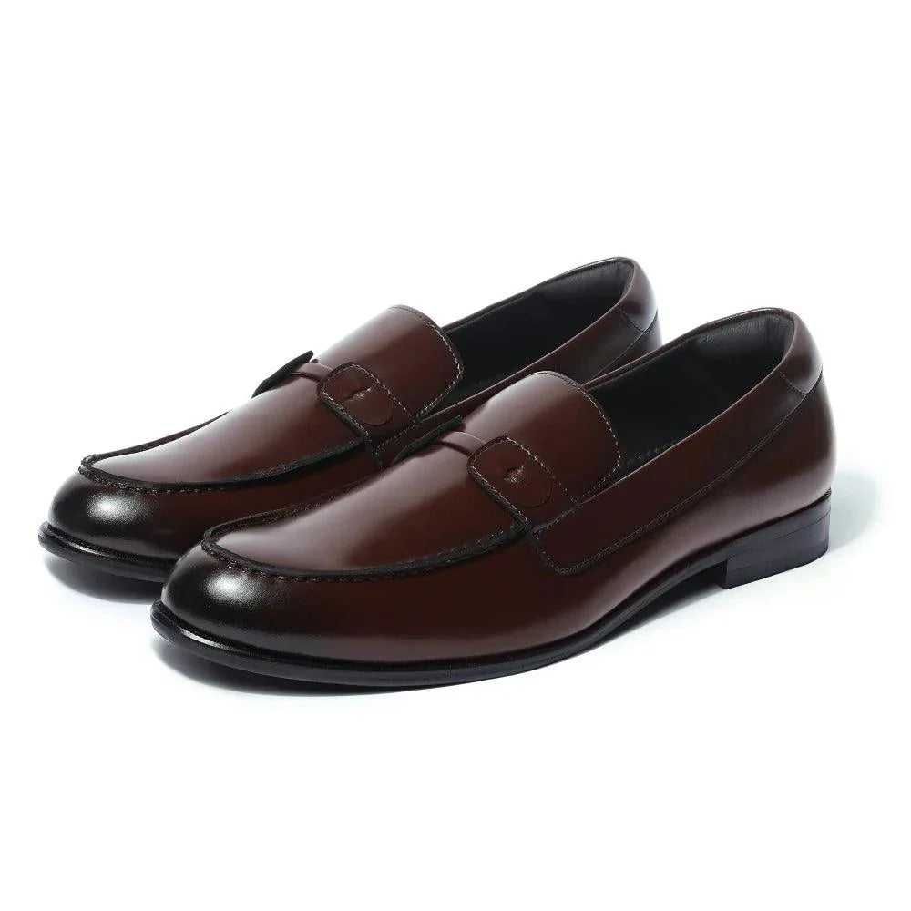 Made for the true gentlemen, these ultra-modern loafers are finely crafted and designed for a look that resonates with class and luxury. The "Baldwin" - Dark Tan Slip-on is a pair that redefines elegance with every stitch. A subtle yet noticeable semi-circle loop on either side of the tongue in our signature evergreen, round-toe silhouette creates a story of confidence and comfort weaved together.