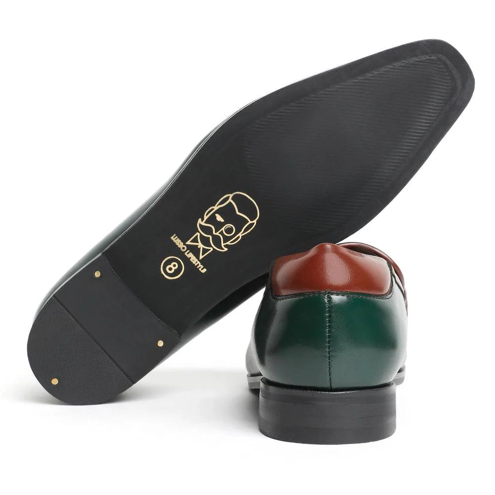 The "Giovanni" is our homage to the Italian craft and culture. These ultra-modern loafers are meticulously crafted to exude sophistication and opulence. The "Giovanni" - Green Slip-on embodies elegance in every detail. Featuring a striking green upper with a charming tan contrast on each side of the tongue, this pair offers a distinctive look. Our iconic square-toe silhouette of the "Giovanni" blends confidence and comfort seamlessly, telling a tale of style and ease.