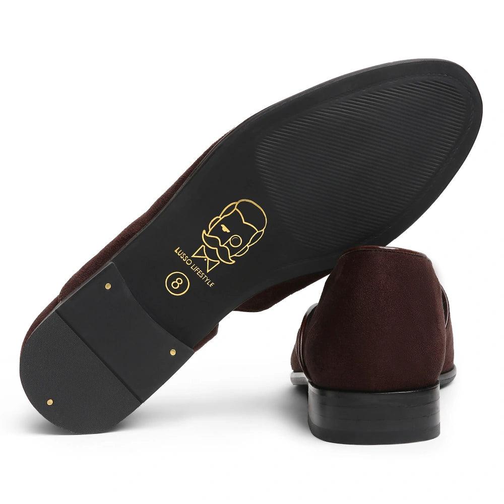 Discover "The Gulzar," an Indian ethnic slip-on that exudes traditional elegance with a modern flair. This distinguished shoe features a rich brown suede upper, providing a soft, plush feel that speaks of understated luxury. The true artistry of "The Gulzar" lies in its exquisite Zardosi handwork motif, a testament to the skill and dedication of our craftsmanship. Each motif is intricately designed, catching the light with every step, bringing a royal touch to your stride. Whether paired with a regal sherwani, a classic kurta, or a contemporary Indo-western ensemble, these slip-ons are versatile enough to transition seamlessly across a range of traditional Indian attire.