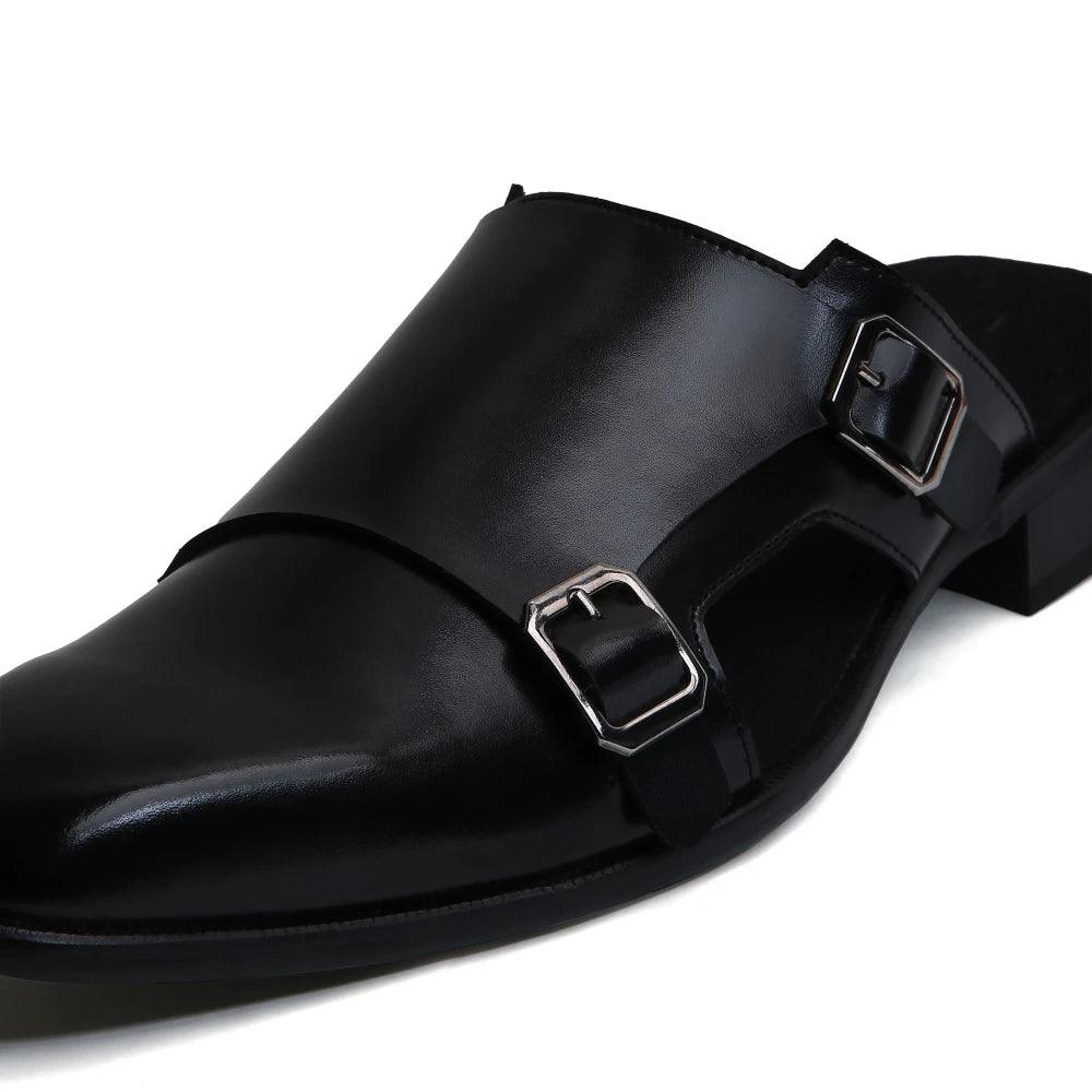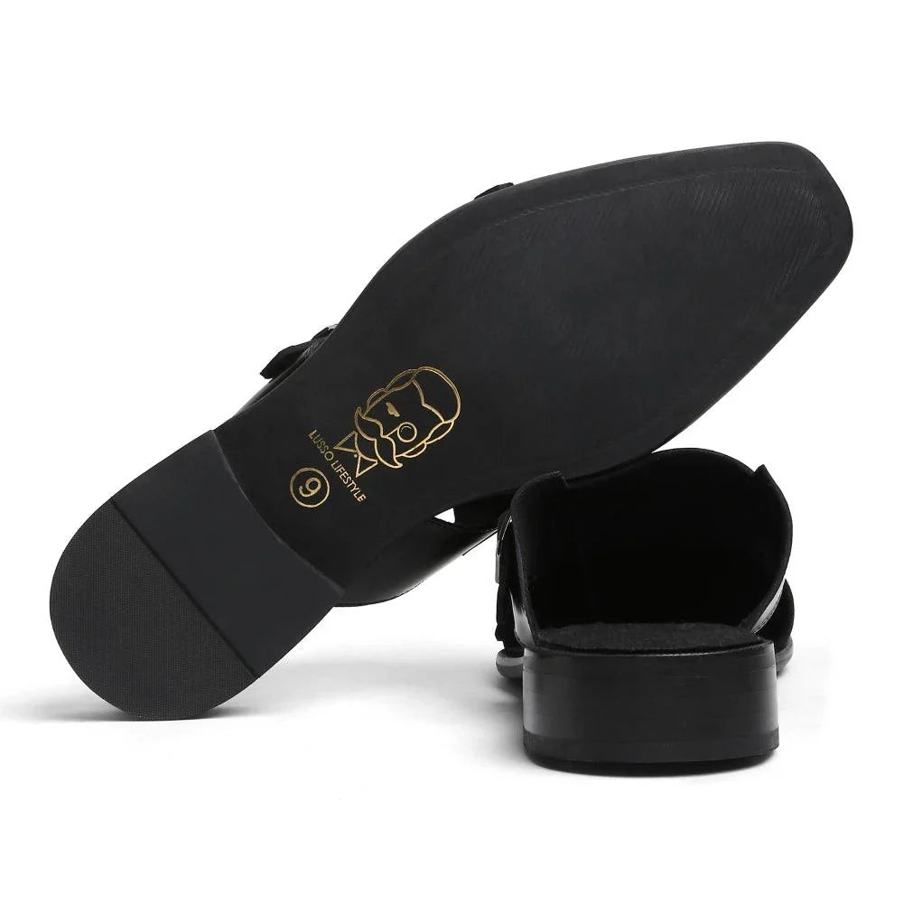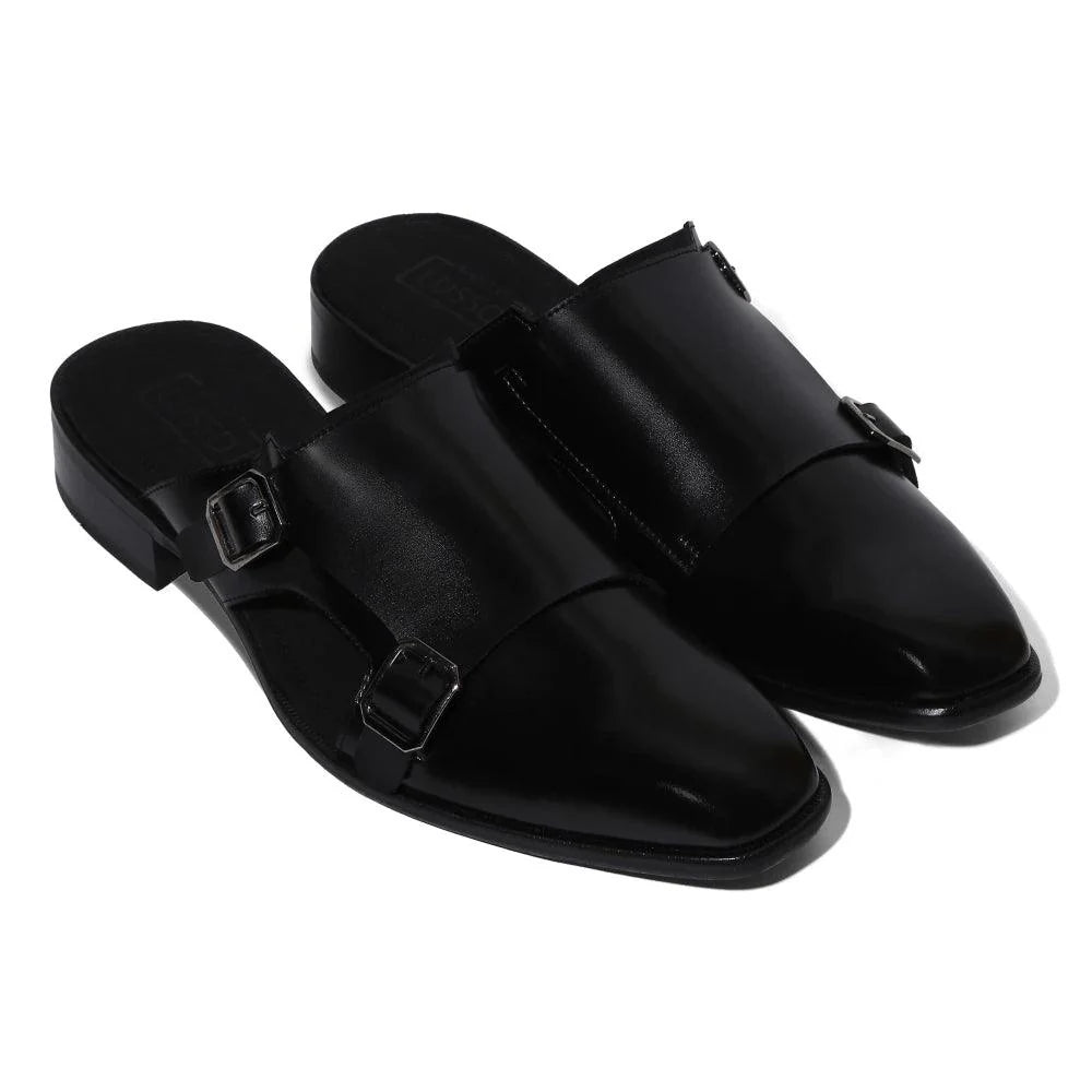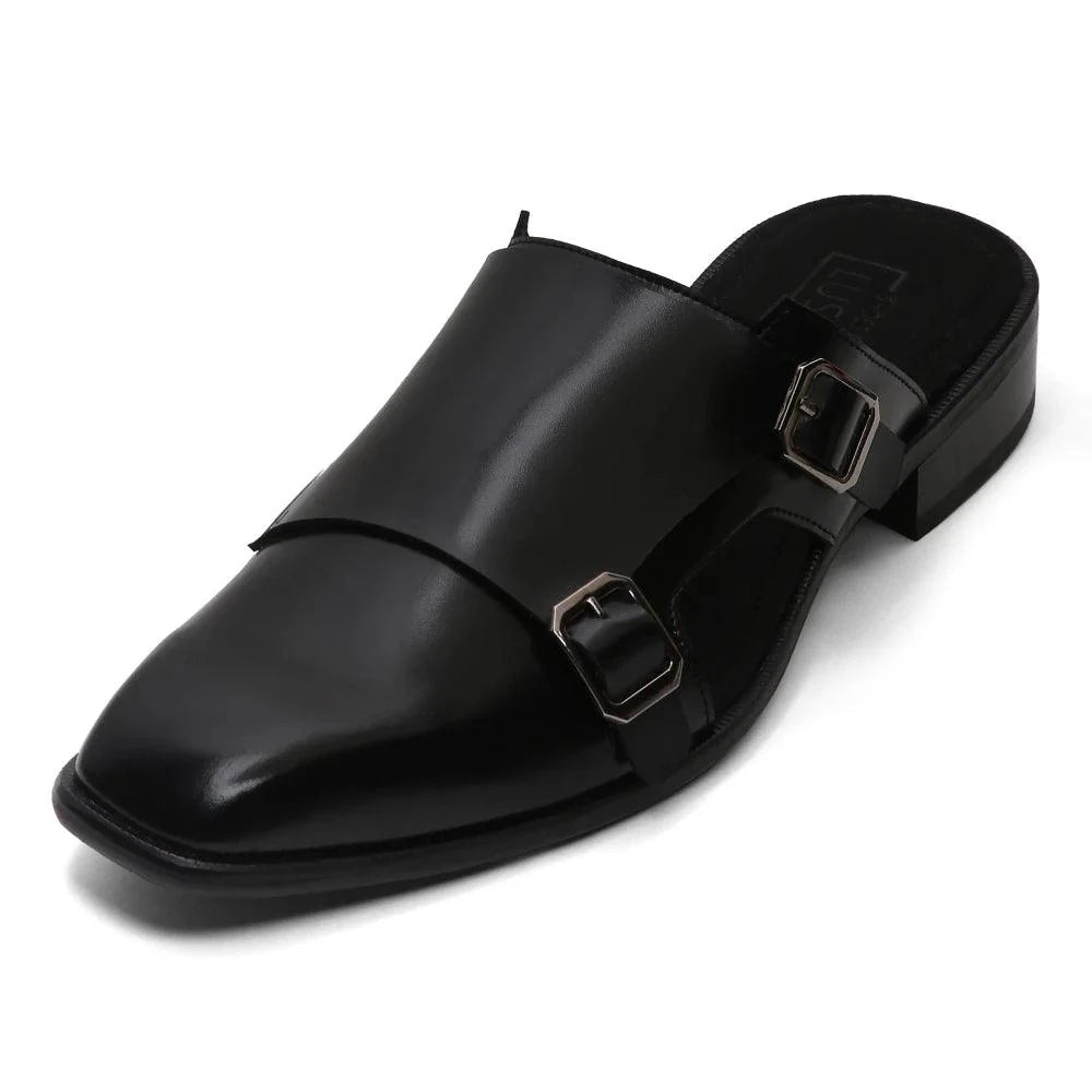 Introducing "The Hulio", the perfect blend of classic and contemporary. These plush black mules feature a clean double monk strap design with a square toe for a sharp, urban look. Ideal for dressing up or down, they slide on effortlessly to complement any outfit.