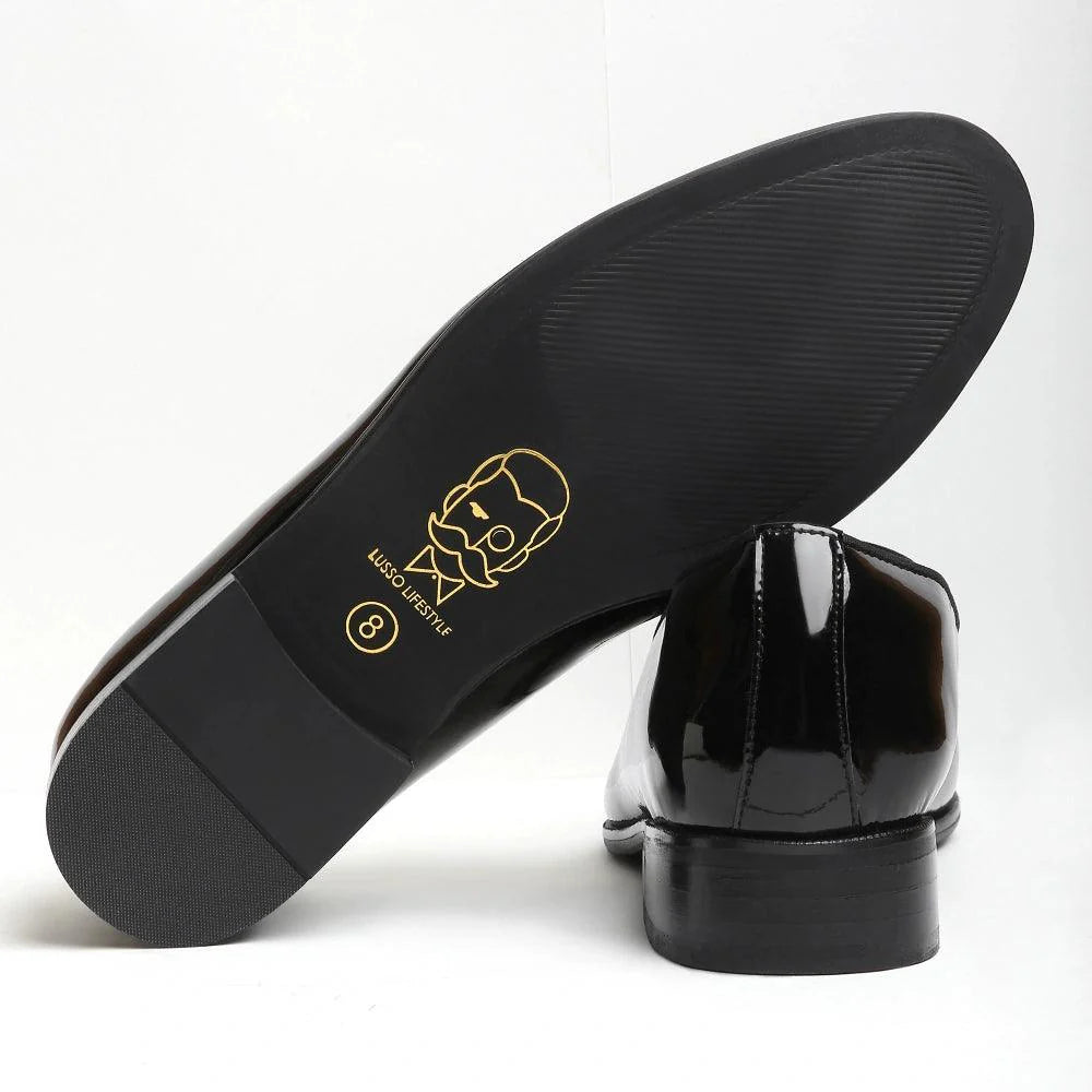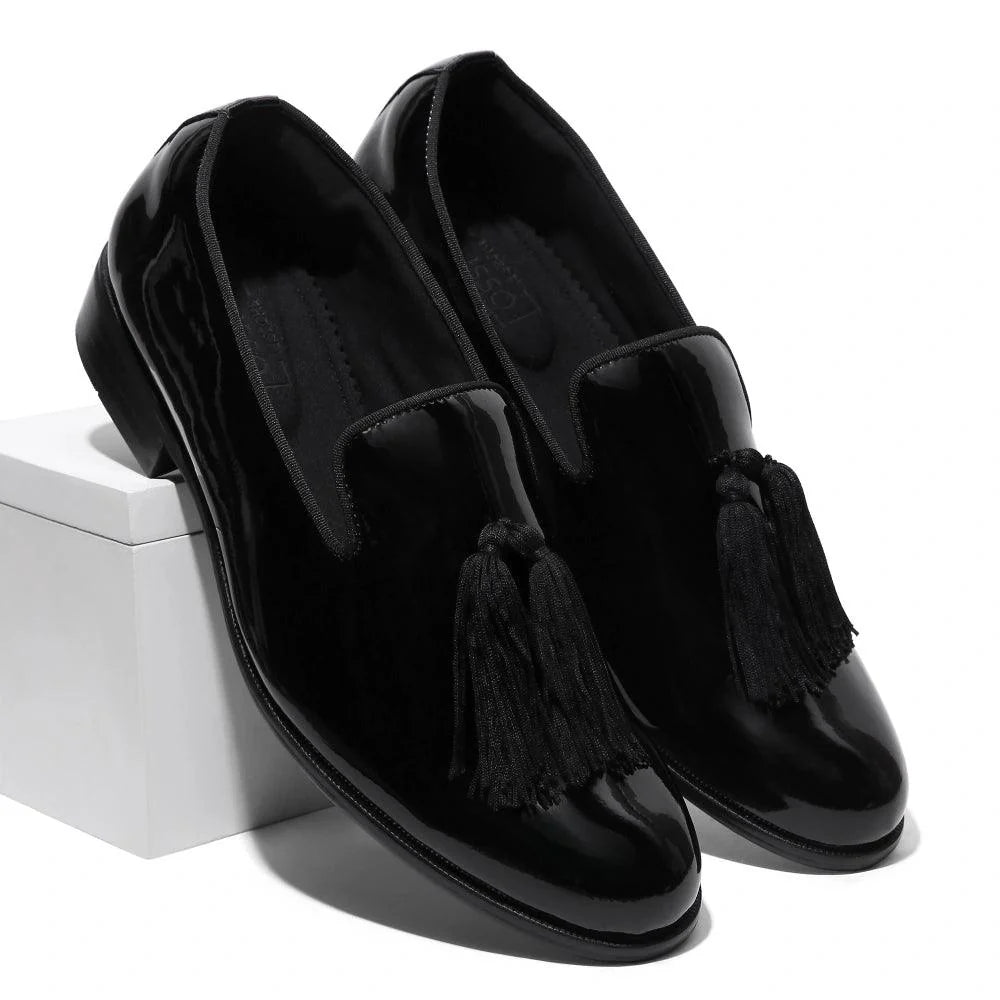 Meet "The Joma," a shoe that embodies simple elegance and ethical luxury. Its design is inspired by the timeless sophistication of a classic tassel, where style meets simplicity. The Joma features a sleek patent black upper, complemented by a distinctive, oversized tassel, adding a touch of flair. Perfect for the modern man who appreciates understated luxury, this slip-on shoe combines comfort with a conscientious choice for the environment. It's not just a shoe, it's a statement of refined taste and sustainable fashion, ideal for any occasion that calls for a touch of class.