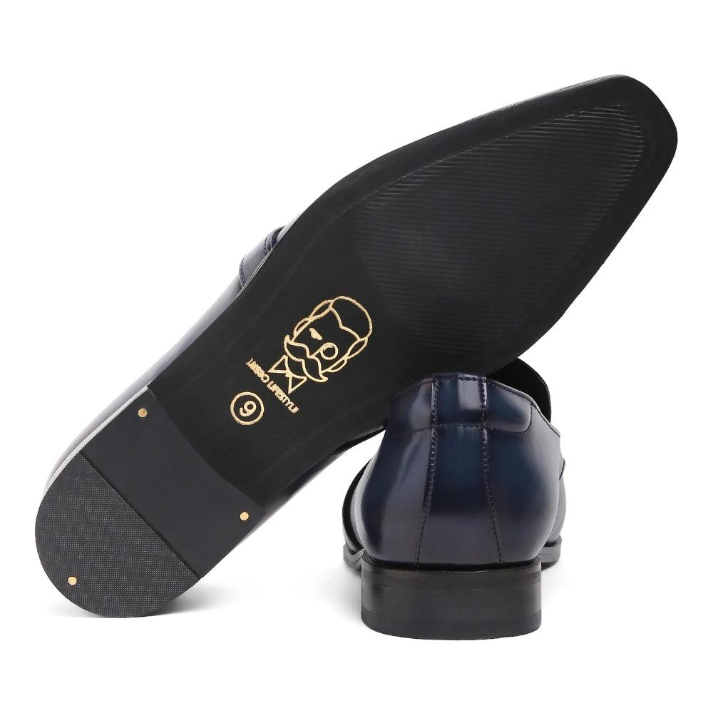 Introducing the "Grava" a piece of pure, unrivalled class. This pair of deep blue loafers is crafted in our signature square-toe silhouette and finished with a black dual tone on the contours. A class act indeed.