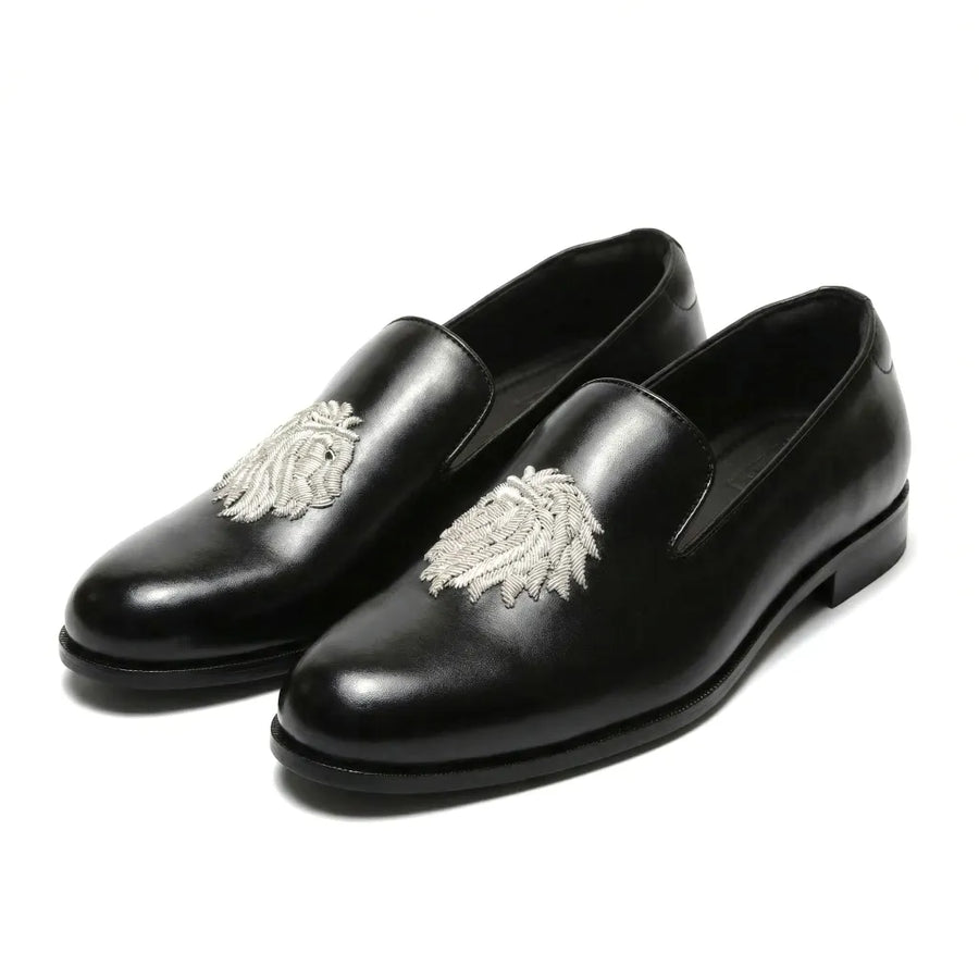 Simvara embodies regal confidence with a modern, understated elegance. The handcrafted zardosi lion motif, crafted in lustrous metallic threads, sits proudly against deep black vegan leather, creating a striking emblem of strength and authority. Designed for the man who commands presence without raising his voice, Simvara marries heritage craft with contemporary sophistication. Perfect for weddings, celebrations, and elevated ethnic dressing, this pair stands as a symbol of pride, power, and regality.