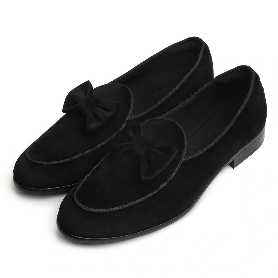Introducing "The Veneto," a quintessential tuxedo shoe that redefines classic sophistication. Crafted with a sumptuous black velvet upper, The Veneto is an epitome of refined elegance. The shoe is thoughtfully accented with grosgrain piping, enhancing its sleek and polished appearance. What elevates the entire look of this pair is the tuxedo-style bow on the tongue, a nod to traditional formal wear, yet with a contemporary twist. Perfect for black-tie events or any occasion that demands a touch of suave elegance, The Veneto promises to elevate any ensemble it accompanies. Its versatile design ensures it pairs seamlessly with classic tuxedos or adds a sophisticated edge to a more modern outfit, making it a must-have in the wardrobe of those who appreciate the finer things in life.