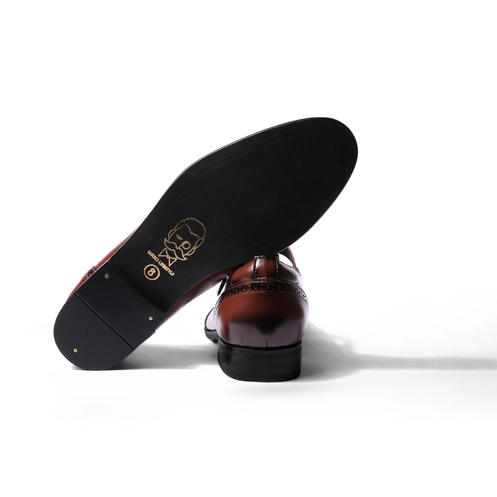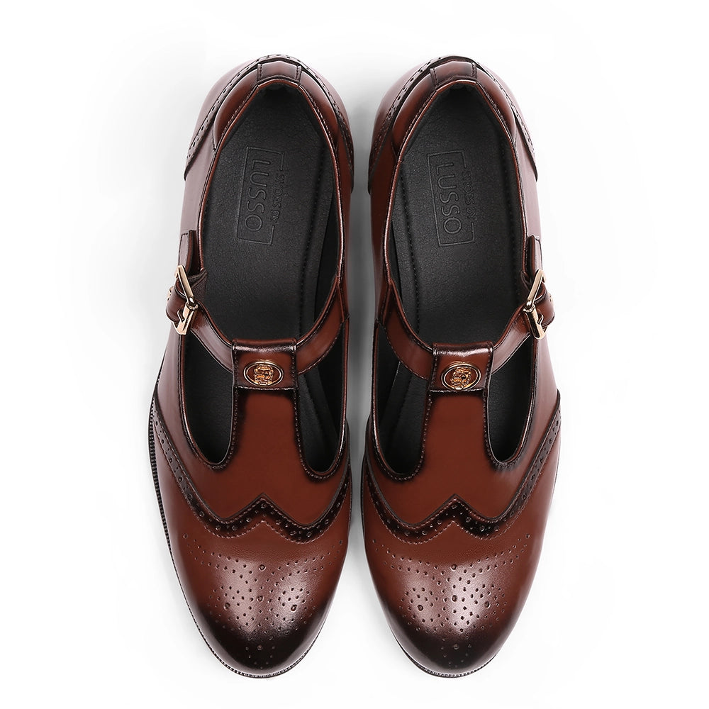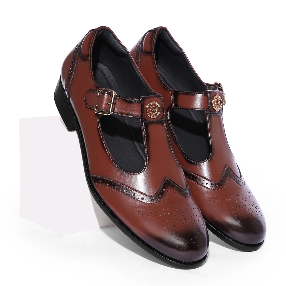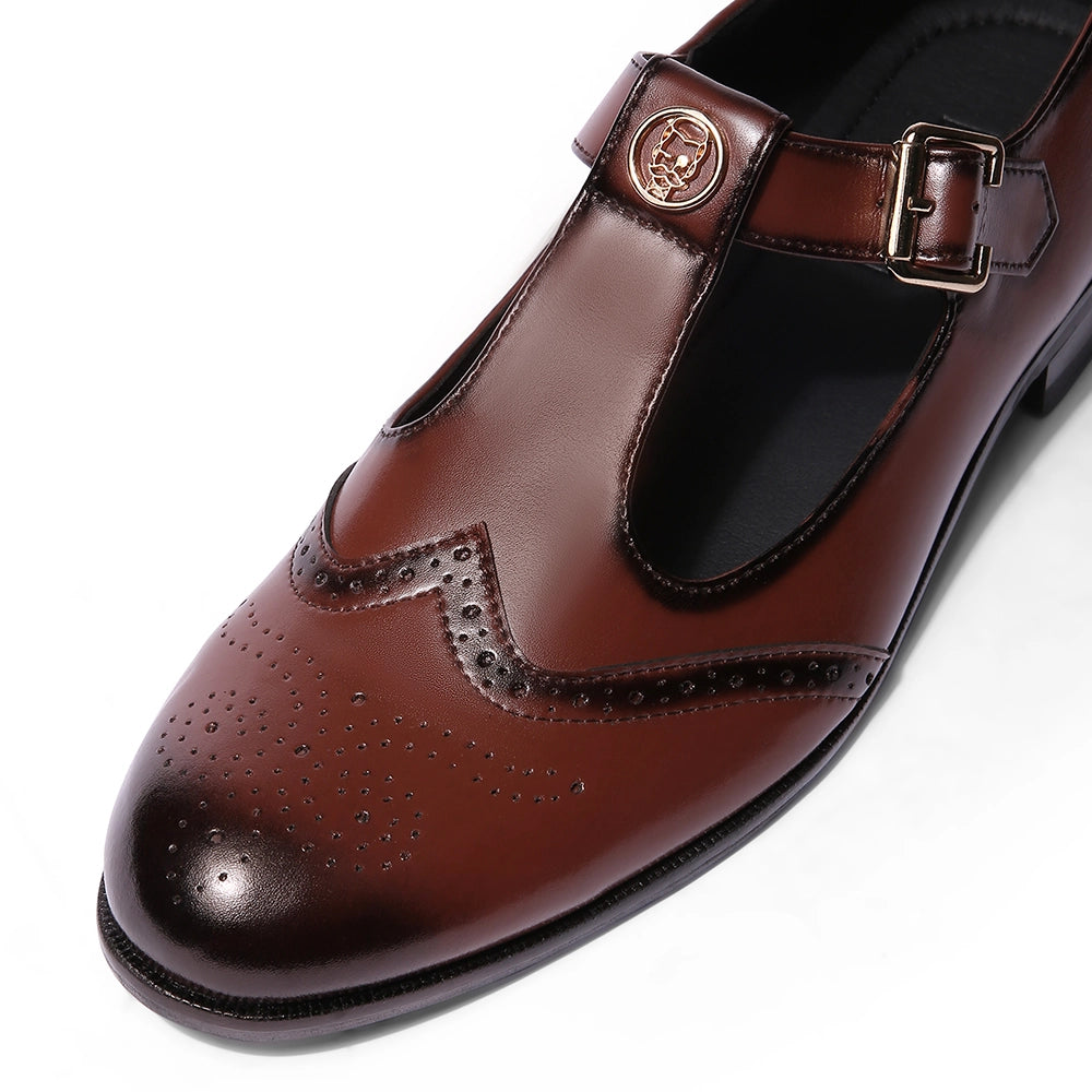 The Elco 2.0 brings back one of Lusso’s most loved designs with a stronger, sharper attitude. Crafted in polished British tan vegan leather, it features a reimagined T-strap silhouette and our signature emblem, a mark of identity and pride, the iconic Lusso Logo. The brogue detailing adds a classic edge, while the gold buckle gives it just the right amount of shine. Designed to pair effortlessly with ethnic wear and modern tailoring alike, Elco 2.0 stands for heritage done right, timeless, confident, and unmistakably Lusso.