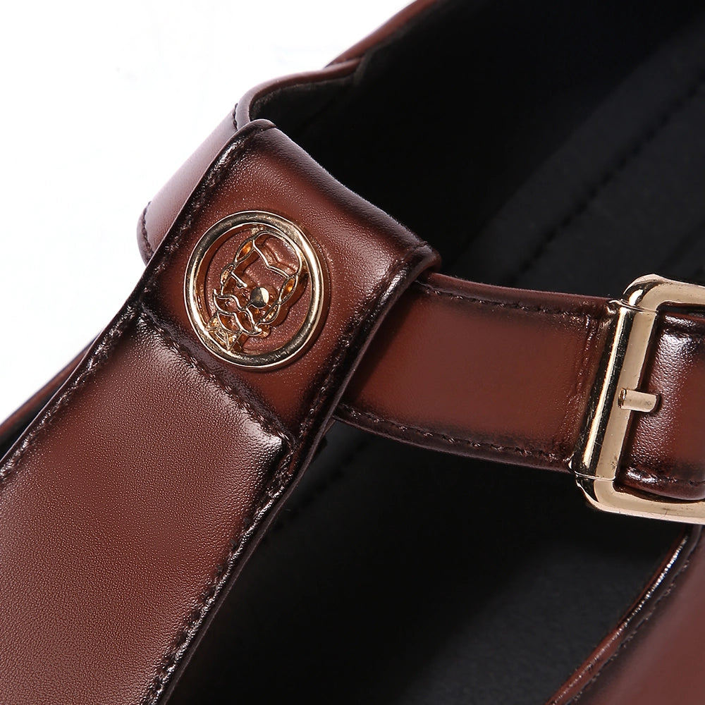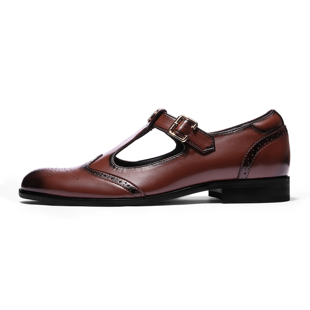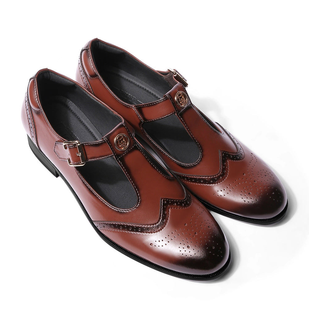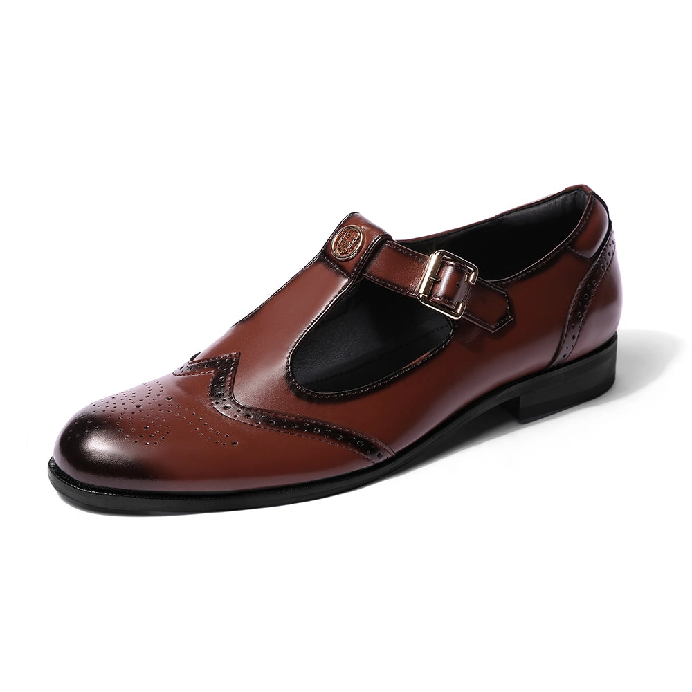 The Elco 2.0 brings back one of Lusso’s most loved designs with a stronger, sharper attitude. Crafted in polished British tan vegan leather, it features a reimagined T-strap silhouette and our signature emblem, a mark of identity and pride, the iconic Lusso Logo. The brogue detailing adds a classic edge, while the gold buckle gives it just the right amount of shine. Designed to pair effortlessly with ethnic wear and modern tailoring alike, Elco 2.0 stands for heritage done right, timeless, confident, and unmistakably Lusso.