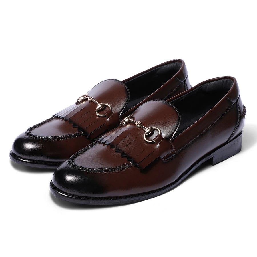 For the man who masters the art of understated luxury, the Gustoso 2.0 delivers. Crafted in rich dark tan leather with a smooth, polished finish, these loafers are adorned with the signature gold-tone horsebit and refined kiltie fringe. Versatile yet commanding, they bring effortless sophistication to every step, from tailored suits to relaxed weekend ensembles.