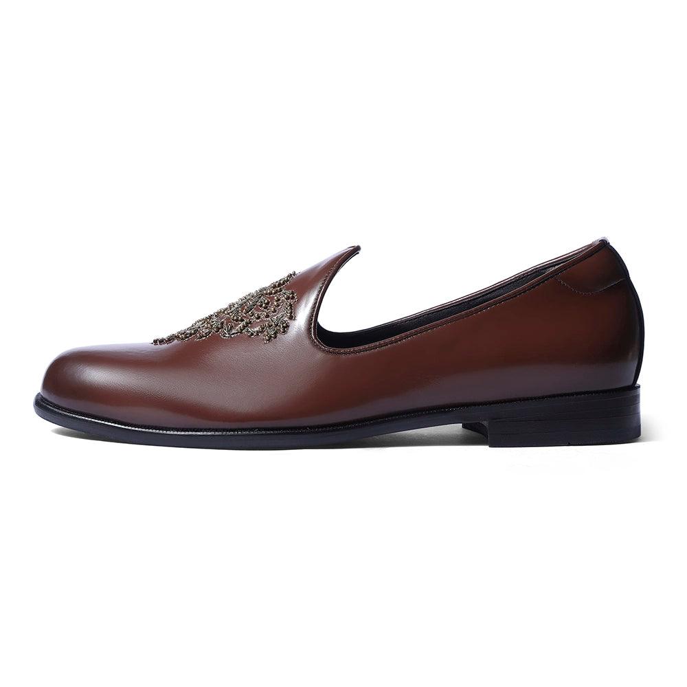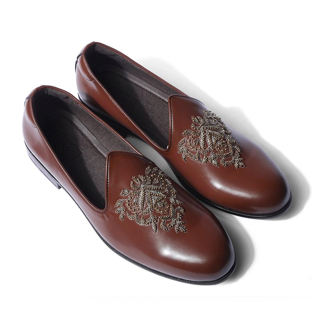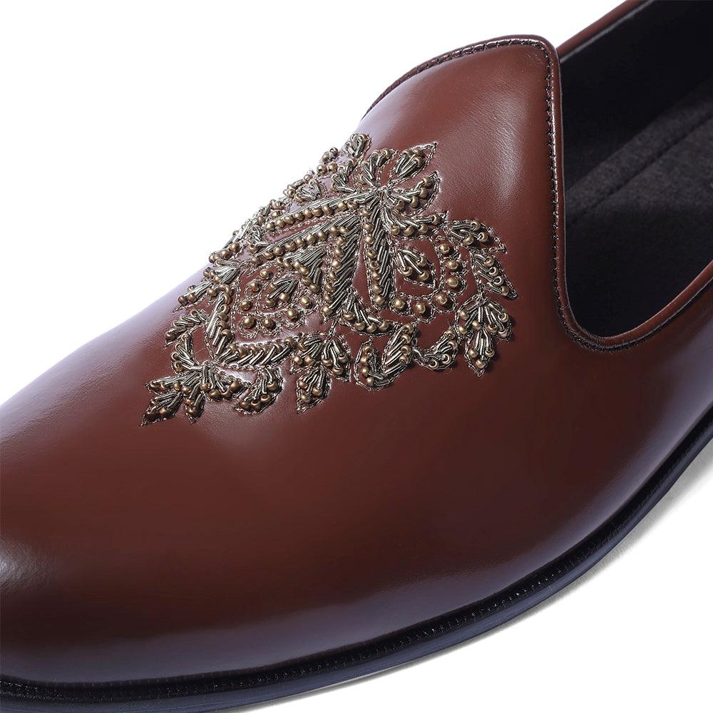 The "Joomar" is a pair that will fill you with pride and poise. These pair of mojdis are a true harmony between grace and splendour. Our beautiful vegan british tan upper is handcrafted with intricate zardosi work that represents our culture and history. Truly awe-inspiring.