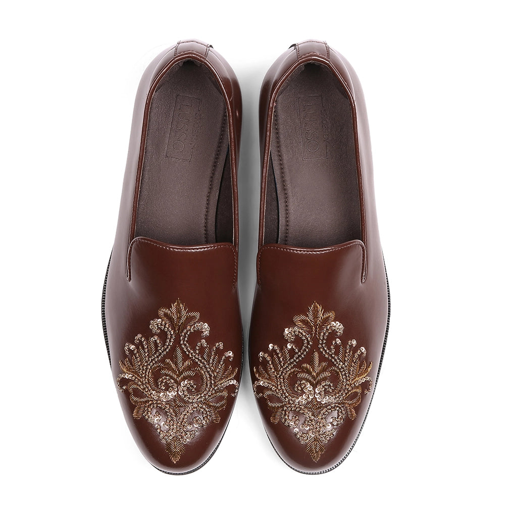 The Jumera draws its inspiration from the grand chandeliers and jhoomars that once lit royal durbars. Every thread of its Zardosi embroidery captures that same glow, ornate yet balanced, detailed yet dignified. The golden handwork glimmers softly against rich dark tan vegan leather, making it an ideal match for sherwanis and regal festive wear. Jumera is designed for moments that deserve presence, when every step feels like you're walking through a palace hall.