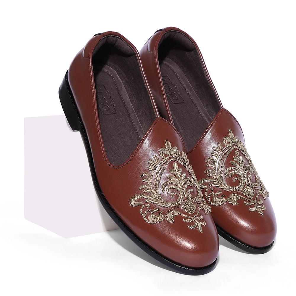 Its embroidery rises like the regal crest of a Kalgi, detailed with fine zardosi handwork that glints softly against the tan vegan leather base. Each curve is a nod to heritage, each stitch a reflection of poise.