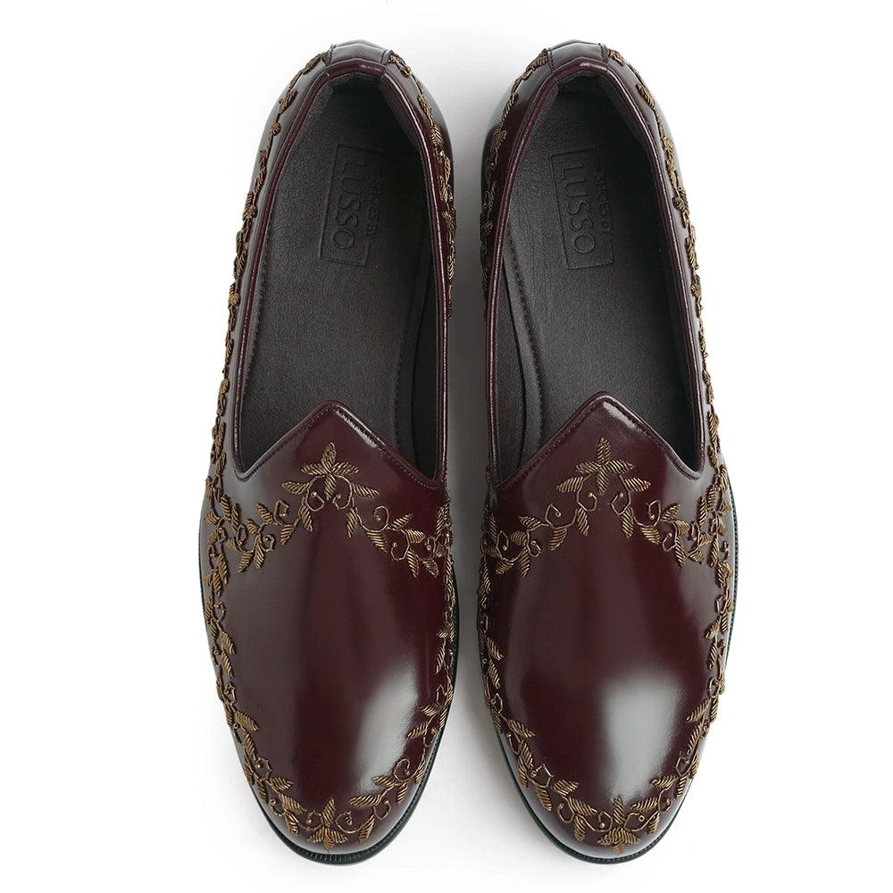 This pair signifies 'Royalty' in every sense of the word. The "Merwan" is handcrafted in our luxurious vegan dark tan upper. Contouring the silhouette are elaborately hand-worked zardozi leaves denoting garlands for the grandest of occasions.