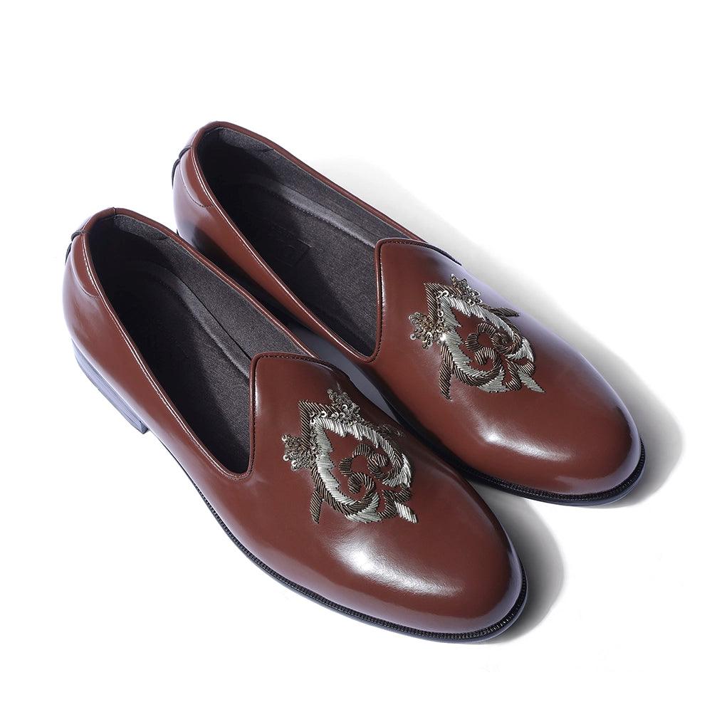 The "Mir" is a pair that will fill you with pride and poise. Crafted in our beautiful British tan upper, these pair of mojdis are a true harmony between grace and splendour. This beautiful vegan mojdi is handcrafted with intricate zardozi work in golden and silver. Truly awe-inspiring.
