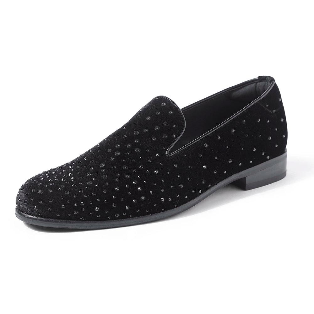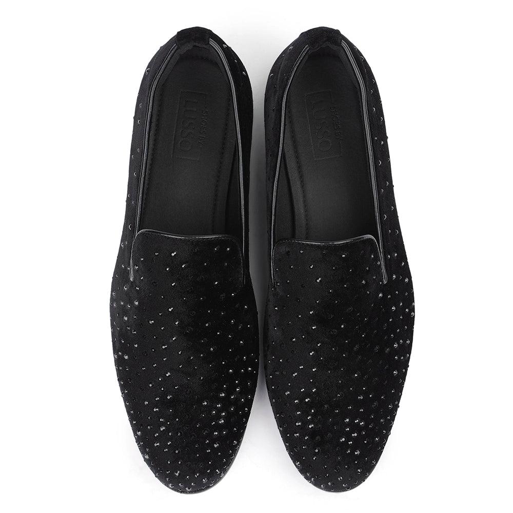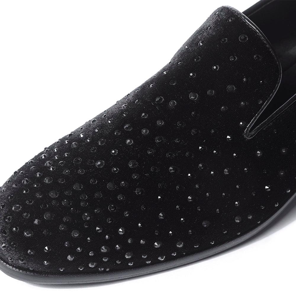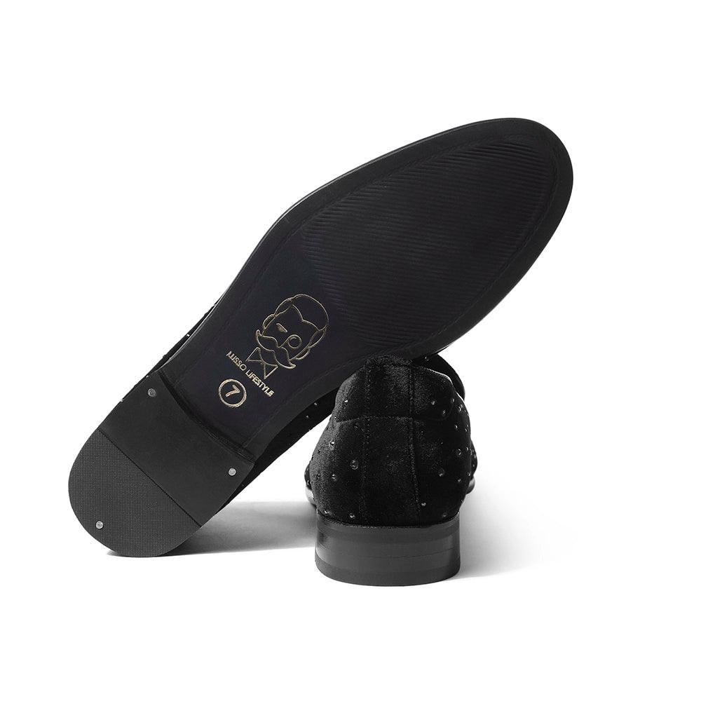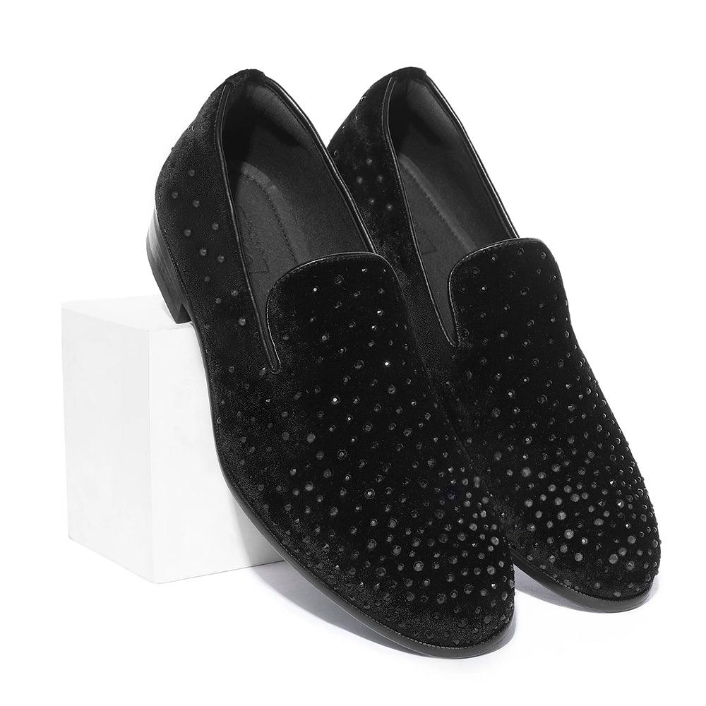 The "Omair" is more than just a pair of shoes. It is handcrafted from a rich black velvet upper and a dispersed sequin design that represents the stars beyond, and you are destined to shine like one when you adorn these on your feet.