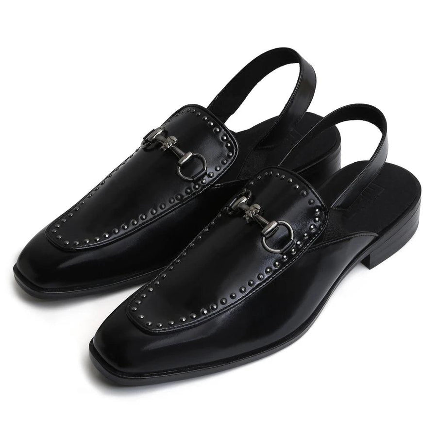 Experience the blend of traditional charm and modern elegance with our plush black square toe sandals, an ideal choice for enhancing your Indian ethnic attire. The plush upper provides a soft, luxurious feel, while the striking rivets along the contour add a touch of bold sophistication. A classic horsebit buckle completes the look, offering a timeless appeal. These sandals are not only a nod to classic style but also a perfect match for the contemporary fashion landscape.