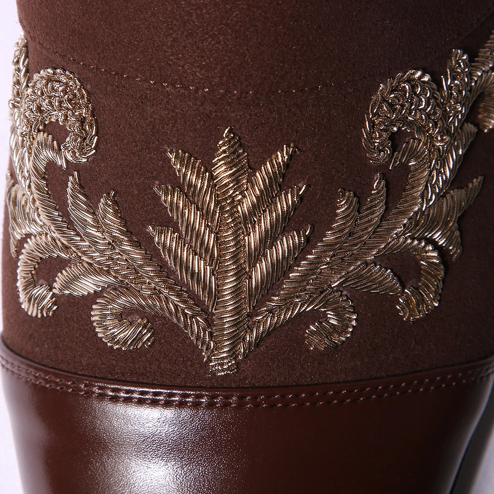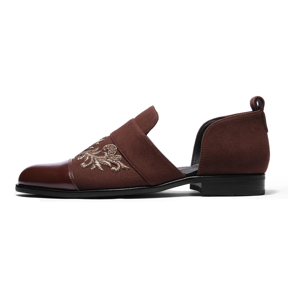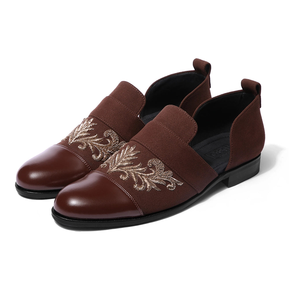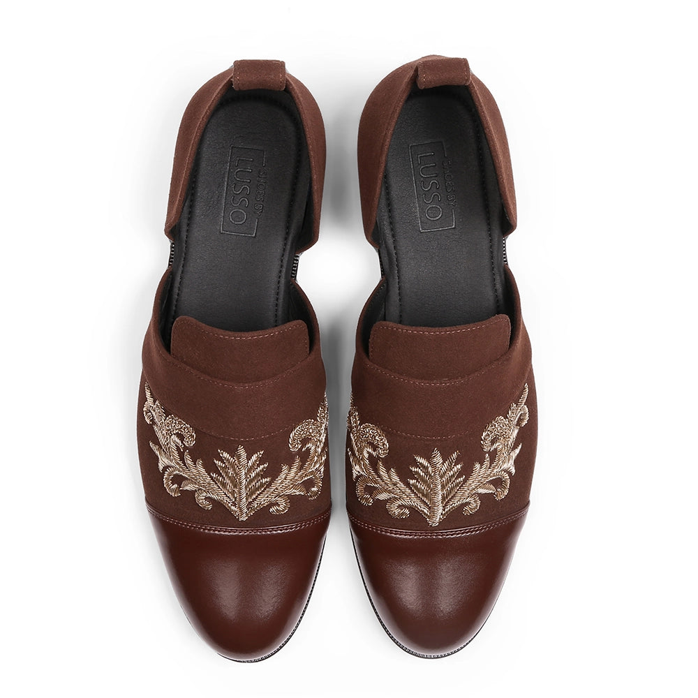 The Sehra is designed for the moment every groom dreams of, the walk that marks a new beginning. Crafted in dark tan vegan leather and brown suede with intricate Zardosi handwork, it blends the richness of Indian artistry with Lusso’s modern craftsmanship. The embroidery draws inspiration from royal wedding finery, detailed yet balanced against the clean structure of the sandal. Paired best with sherwanis and grand festive wear, Sehra is built to complete the look of celebration. It's regal, confident, and made for the spotlight.